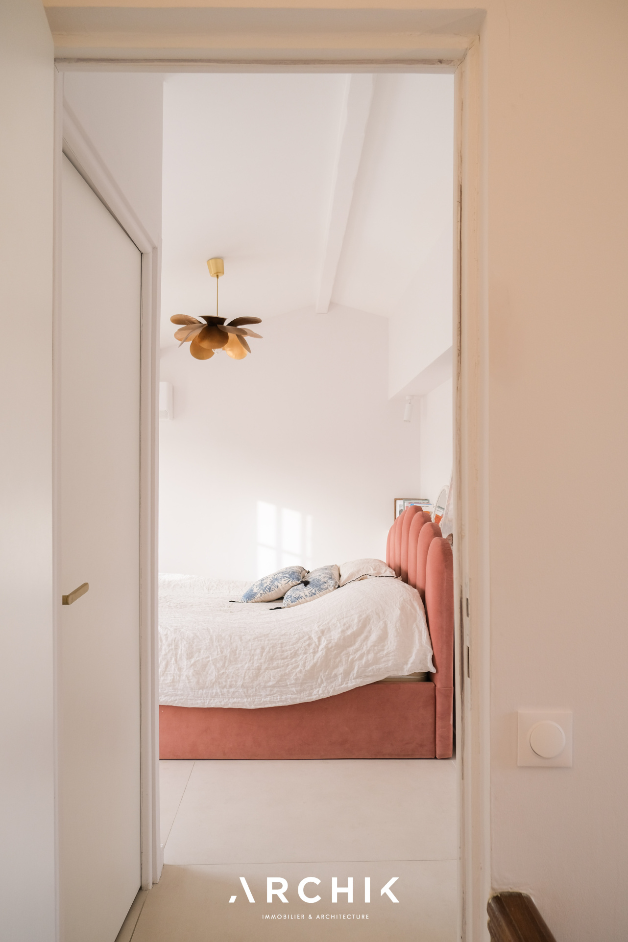 Le dernier niveau est entièrement dédié à la suite parentale. Traversante, elle bénéficie d'une lumière généreuse et s'ouvre sur deux terrasses offrant des vues dégagées sur le quartier. Elle développe un espace nuit apaisé, un dressing confortable et une salle d'eau aux finitions délicates, mêlant faïences graphiques et détails soignés.