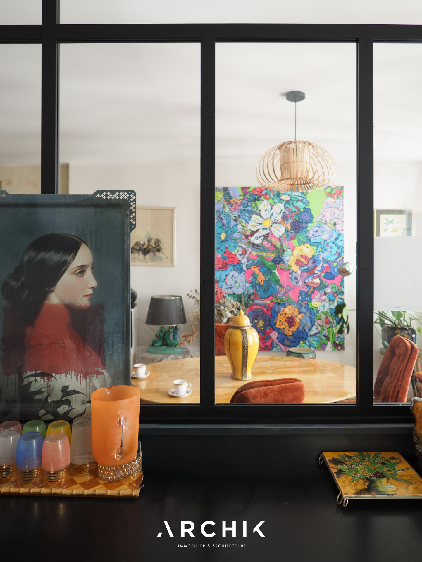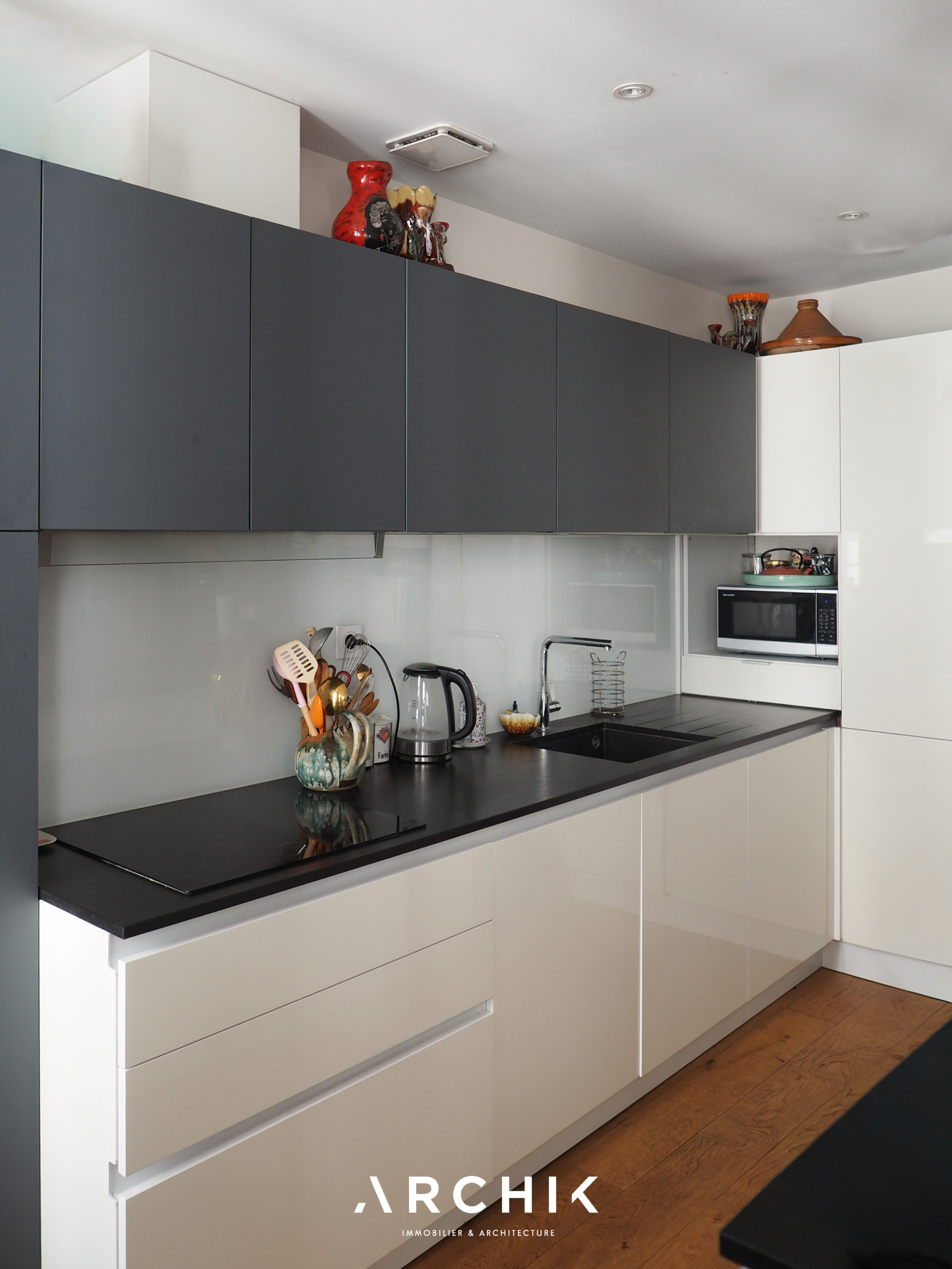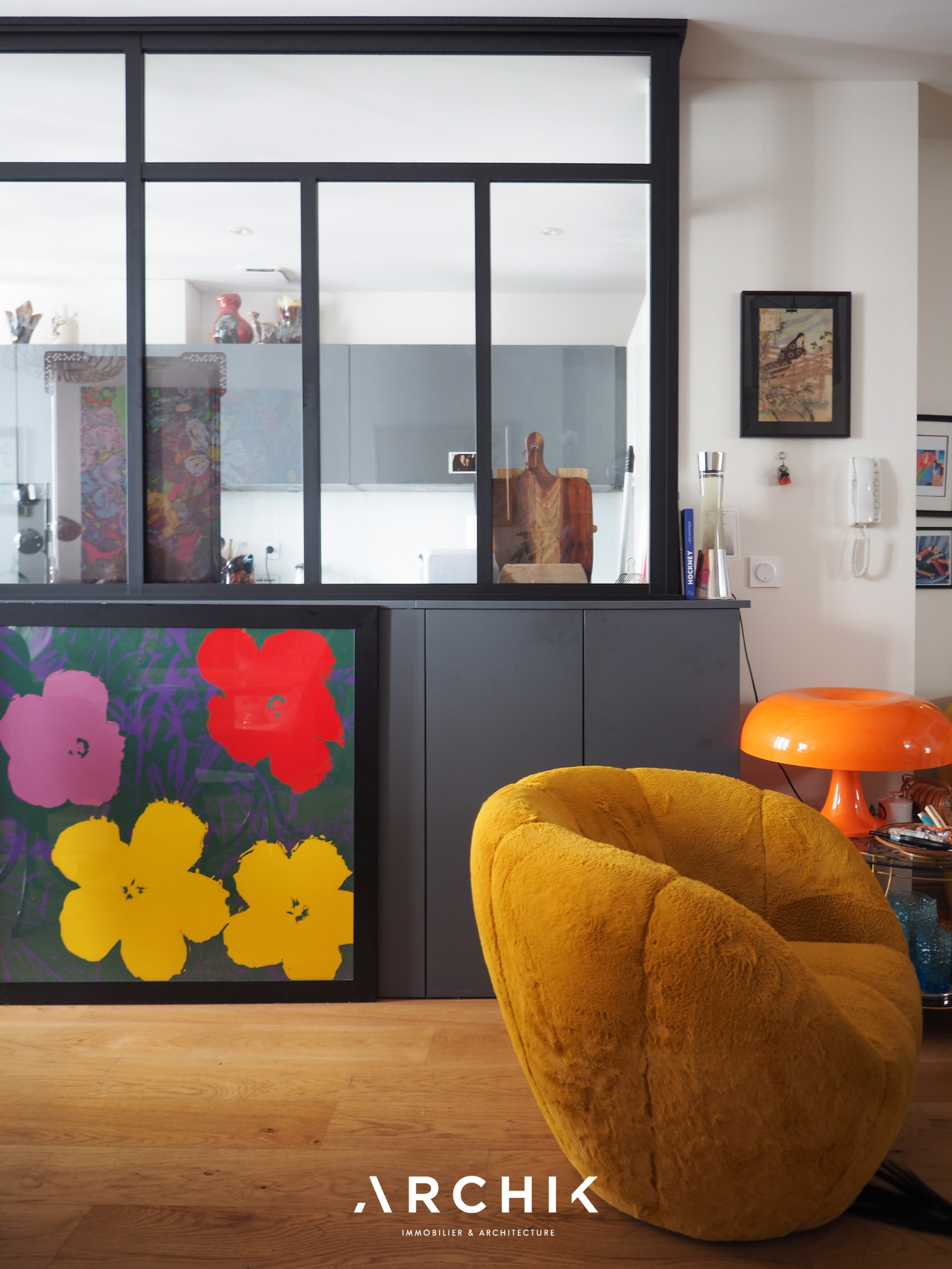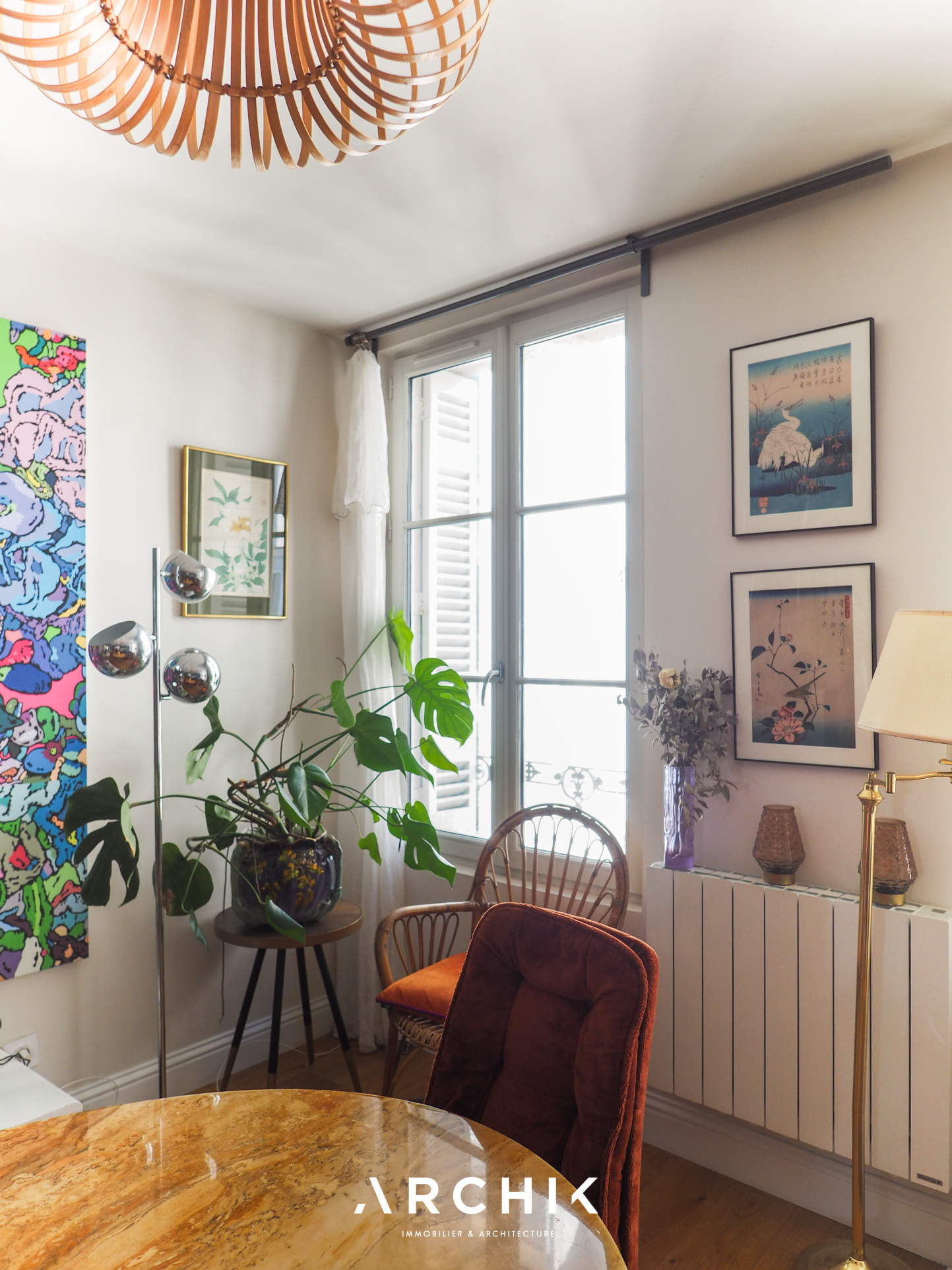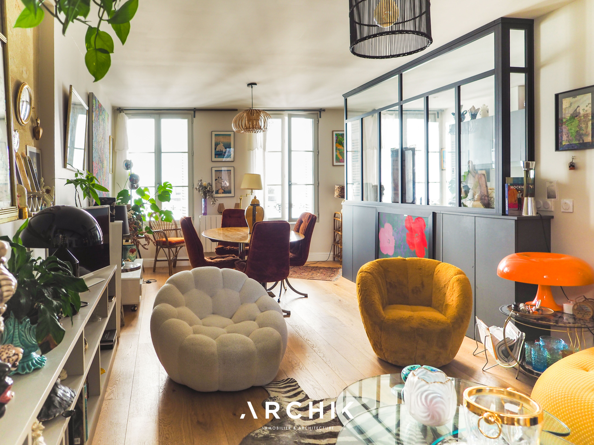 Rénové en 2021, l'accès à l'appartement se fait depuis le 1er étage de l'immeuble par un bel escalier en bois aux ferronneries noires, longeant un mur en pierre. Se découvre ensuite la pièce de vie aux tons neutres : un parquet en chêne contrecollé et des touches de pierre blonde, soulignées par des IPN noirs, ouvrent et structurent l'espace. Depuis le coin salon, intime et accompagné d'une bibliothèque sur mesure, la lumière des trois fenêtres orientées à l'Est attire le regard vers l'espace repas et la cuisine semi-fermée, dévoilée à travers une verrière de style atelier aux accents noirs. Entièrement équipée, la cuisine, habillée de blanc et de gris, avec un plan de travail minéral, conjugue séparation et convivialité.