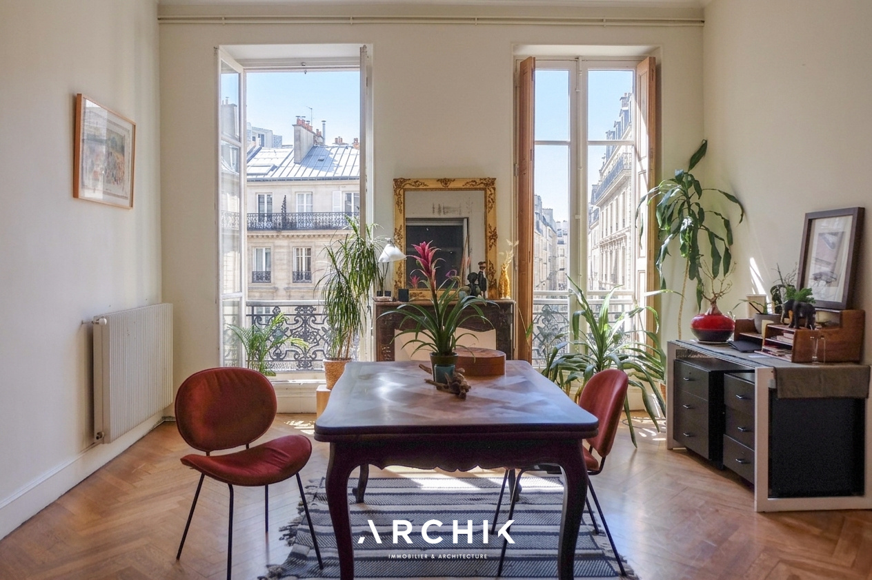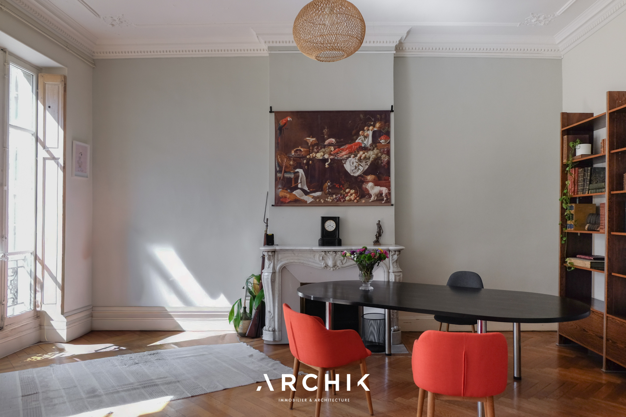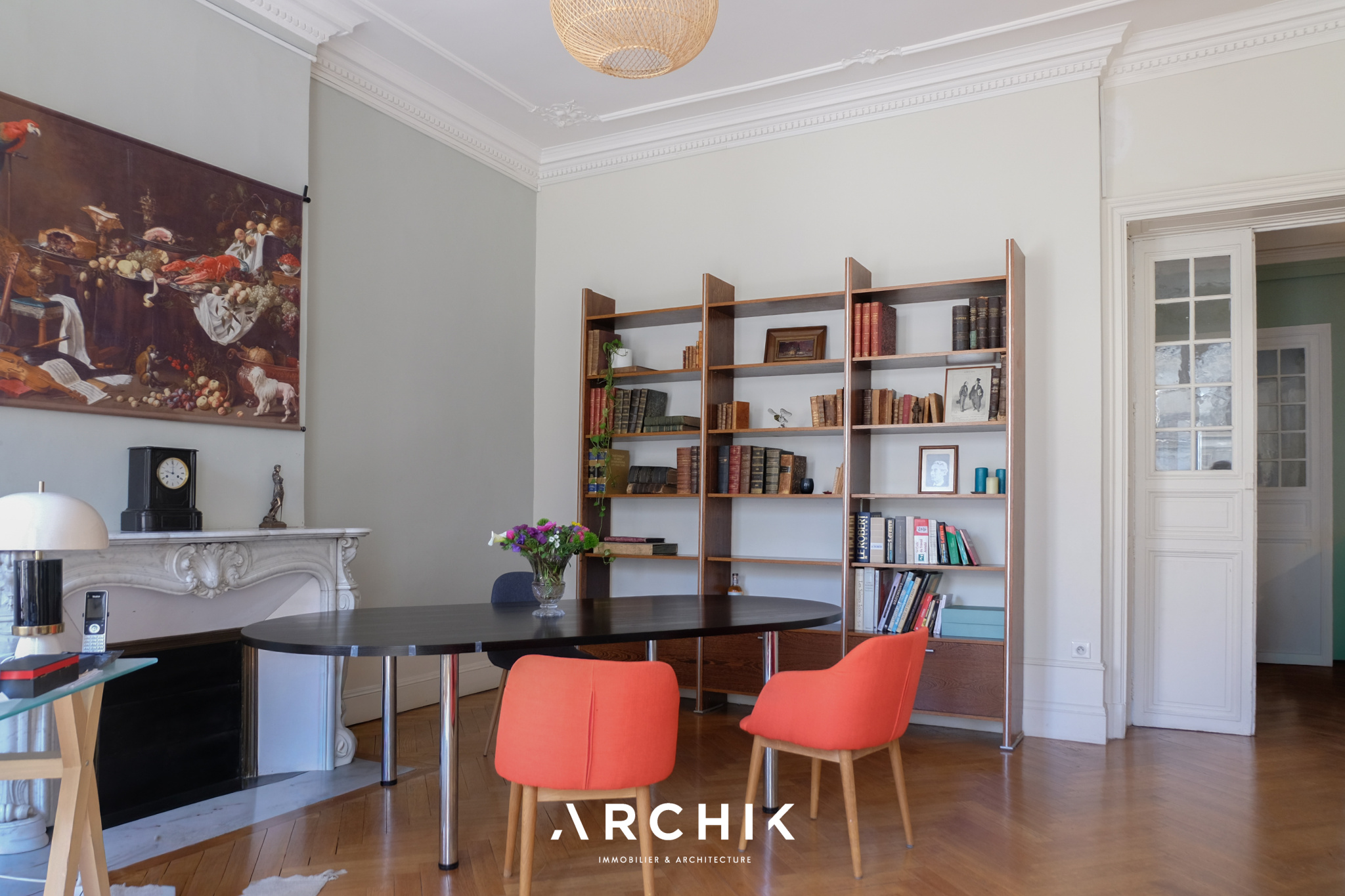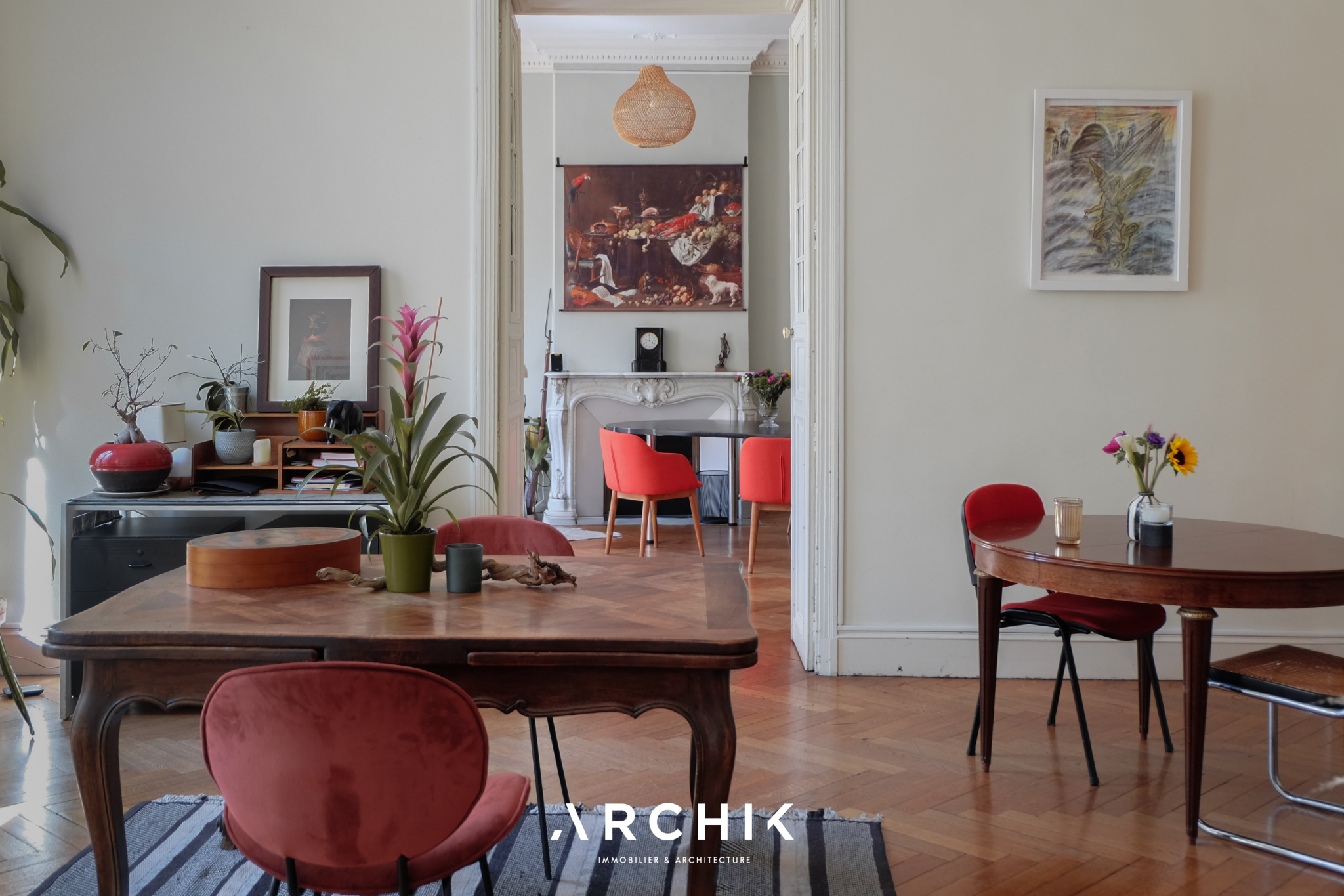 La distribution, pensée pour la vie de famille, s'organise autour de volumes généreux et d'une circulation fluide. Trois salons en enfilade, aux proportions agréables, composent une perspective élégante et offrent de beaux espaces de réception. La cuisine, conçue comme une véritable pièce de vie, se distingue par son esprit théâtral sous verrière, apportant cachet et convivialité. L'appartement accueille aujourd'hui six chambres ainsi que deux salles d'eau, laissant entrevoir de multiples possibilités d'aménagement selon les usages.