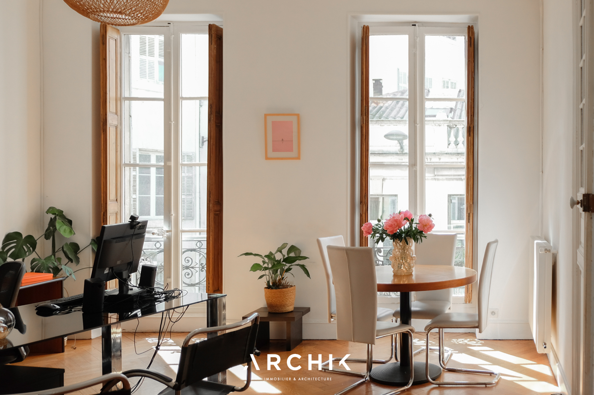 Dans son état d'origine, en angle et baigné de lumière grâce à son exposition Sud-Ouest, il profite d'une belle ouverture sans vis-à-vis, offrant une atmosphère à la fois intime et lumineuse. Dès l'entrée, un vaste hall d'accueil aux belles hauteurs sous plafond annonce immédiatement le caractère des lieux : volumes, élégance et prestance. Aujourd'hui occupé par un cabinet d'avocats, l'espace a su conserver l'ensemble de ses éléments d'origine, hérités de son passé : moulures raffinées, parquet ancien, cheminées d'époque... autant de détails qui affirment son authenticité et son identité.