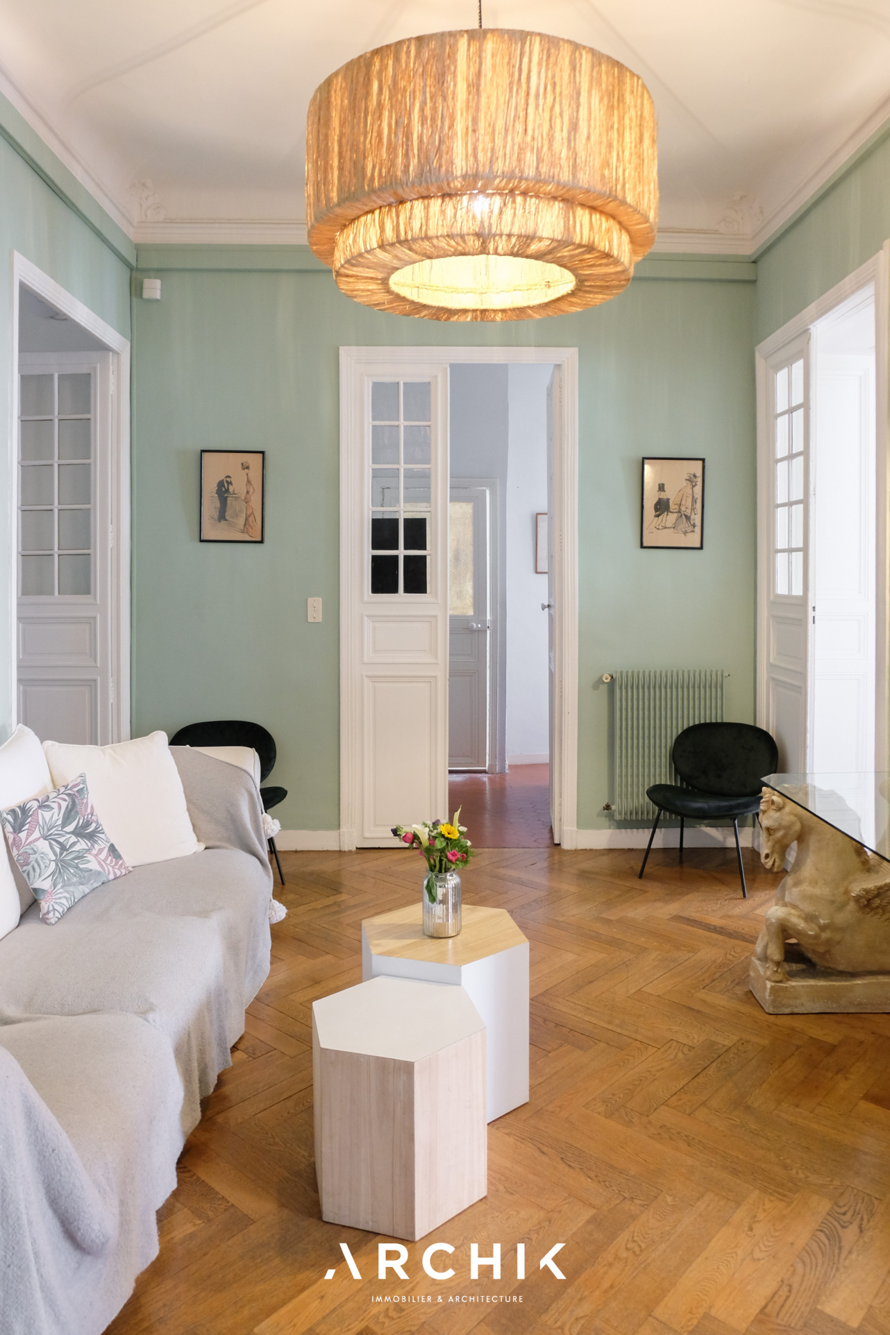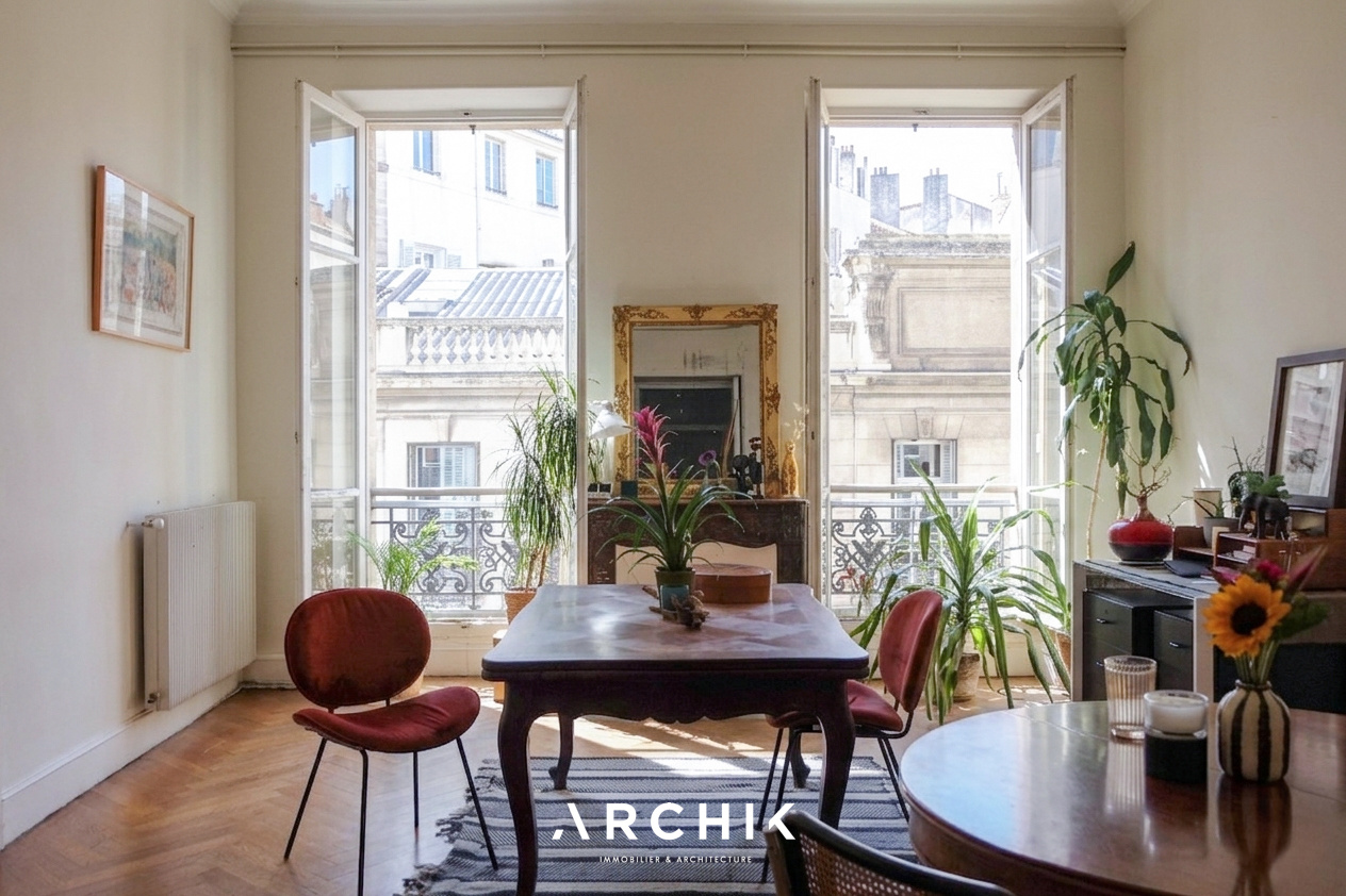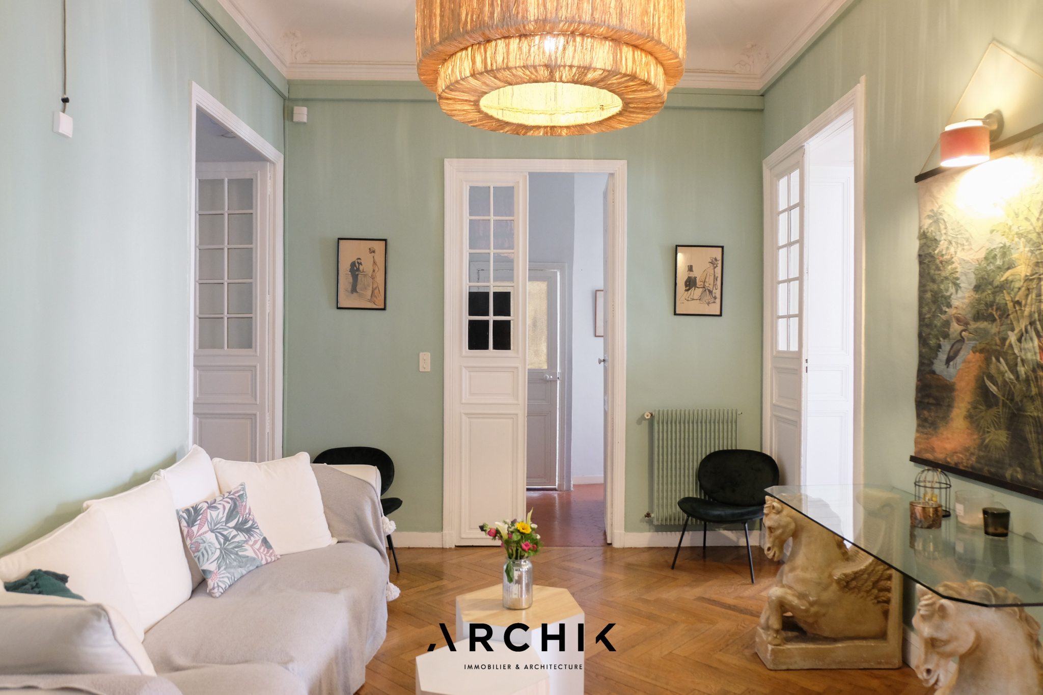 Architecture du début du XXème siècle cet appartement situé au premier étage se déploie sur 225 m2 et exploite tout le charme de l'architecture bourgeoise marseillaise du quartier des Antiquaires.