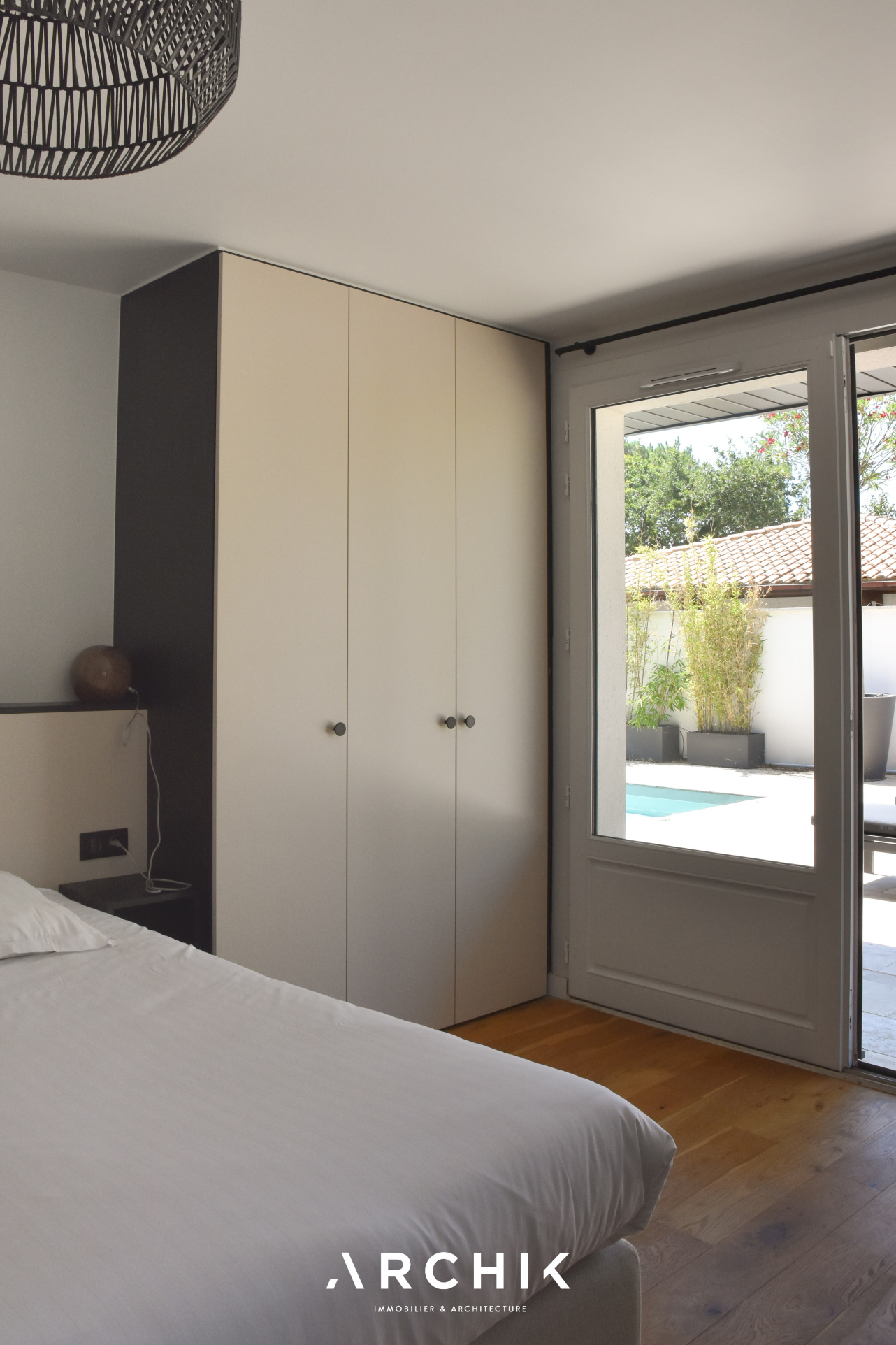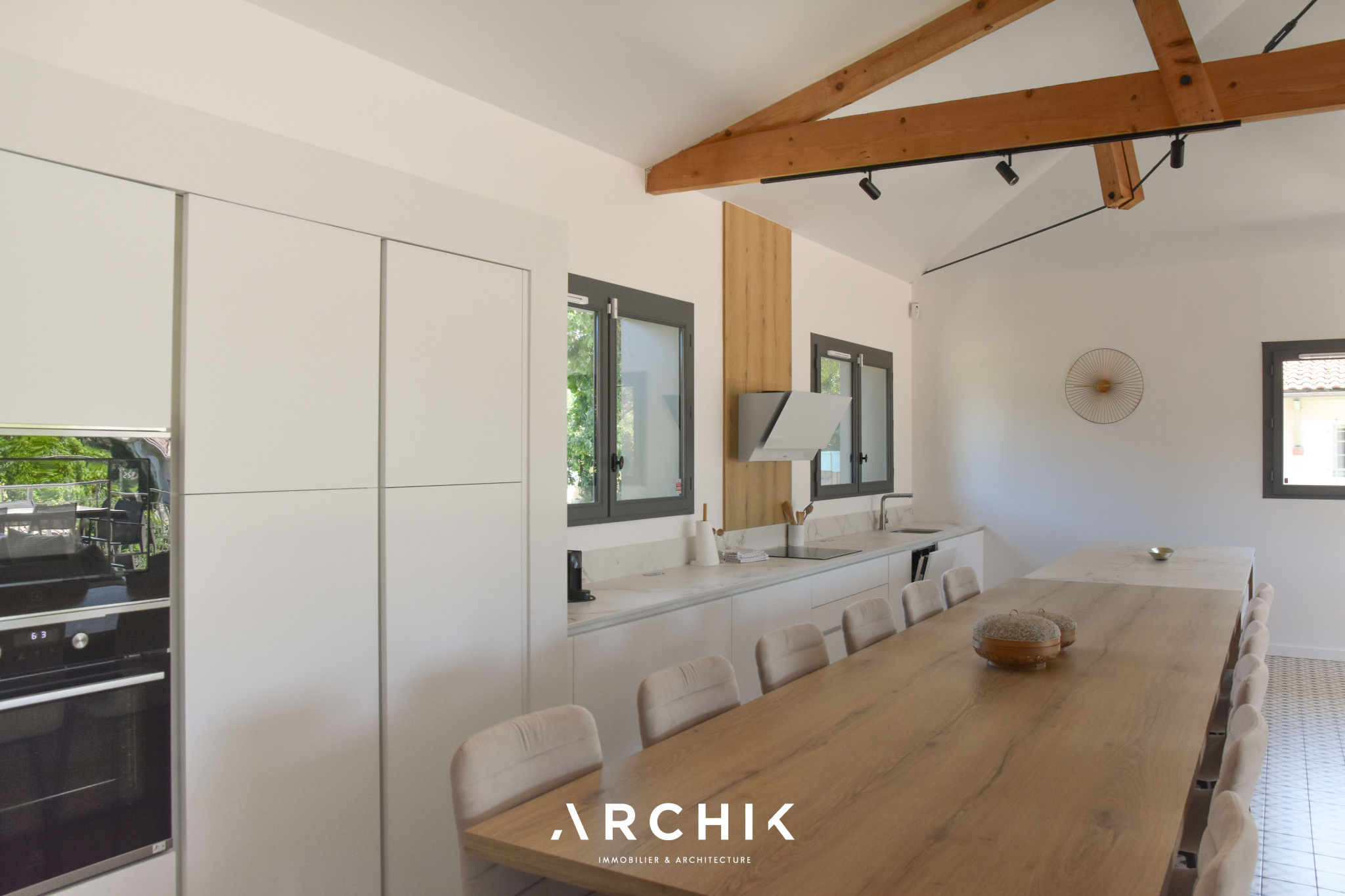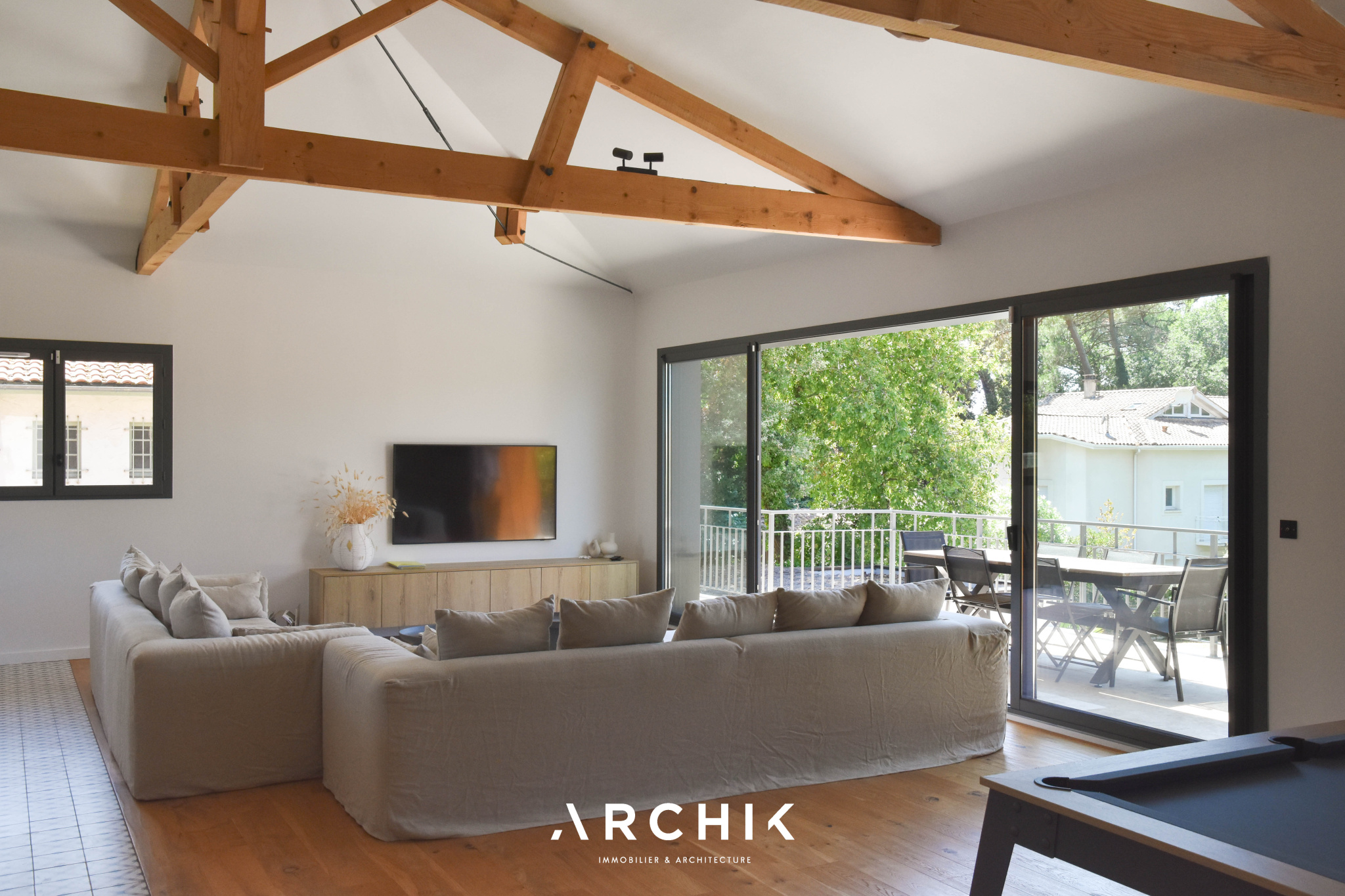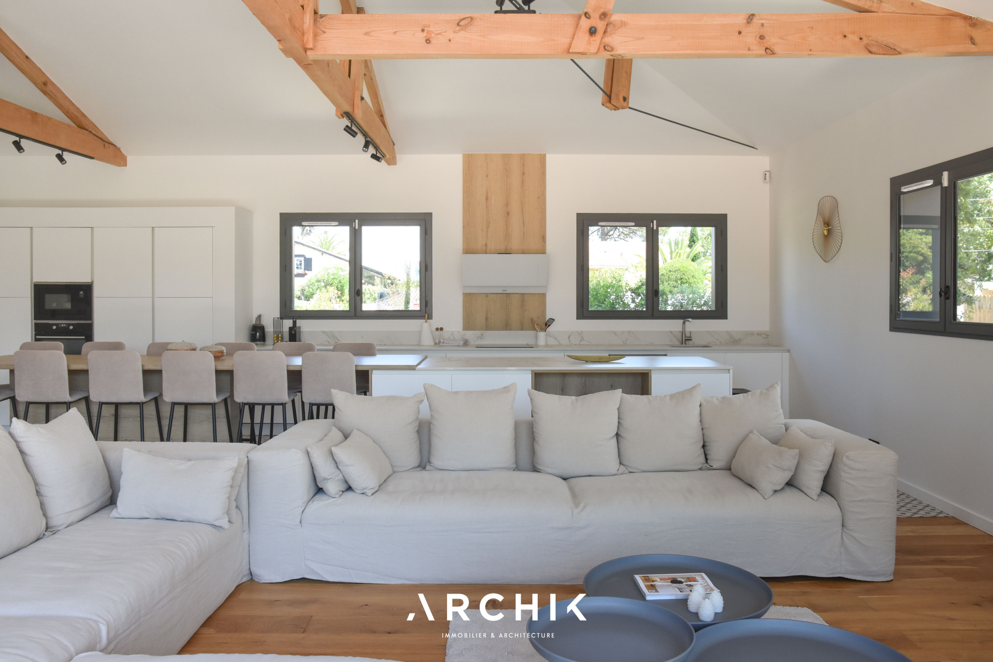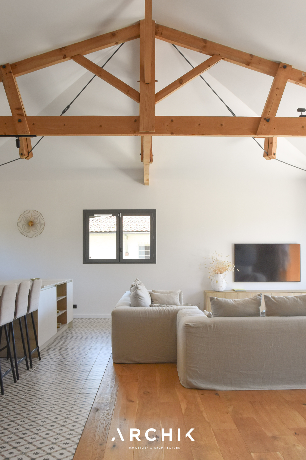 Afin de tirer profit de la lumière et des vues, l'espace de vie prend place en hauteur, à l'étage. La vaste pièce traversante et lumineuse de 70 m2 s'ouvre sur une terrasse suspendue avec aperçu sur le Bassin. Les tons neutres sont omniprésents, faisant ressortir le parquet en chêne massif et le bois de la charpente apparente qui sublime le volume cathédrale de la pièce. La cuisine, entièrement équipée avec un plan de travail en Dekton et une arrière-cuisine aménagée, est séparée du salon par un immense îlot central. Une belle suite parentale comprenant une salle de bain et un dressing, profite également de la vue et de la terrasse à cet étage.