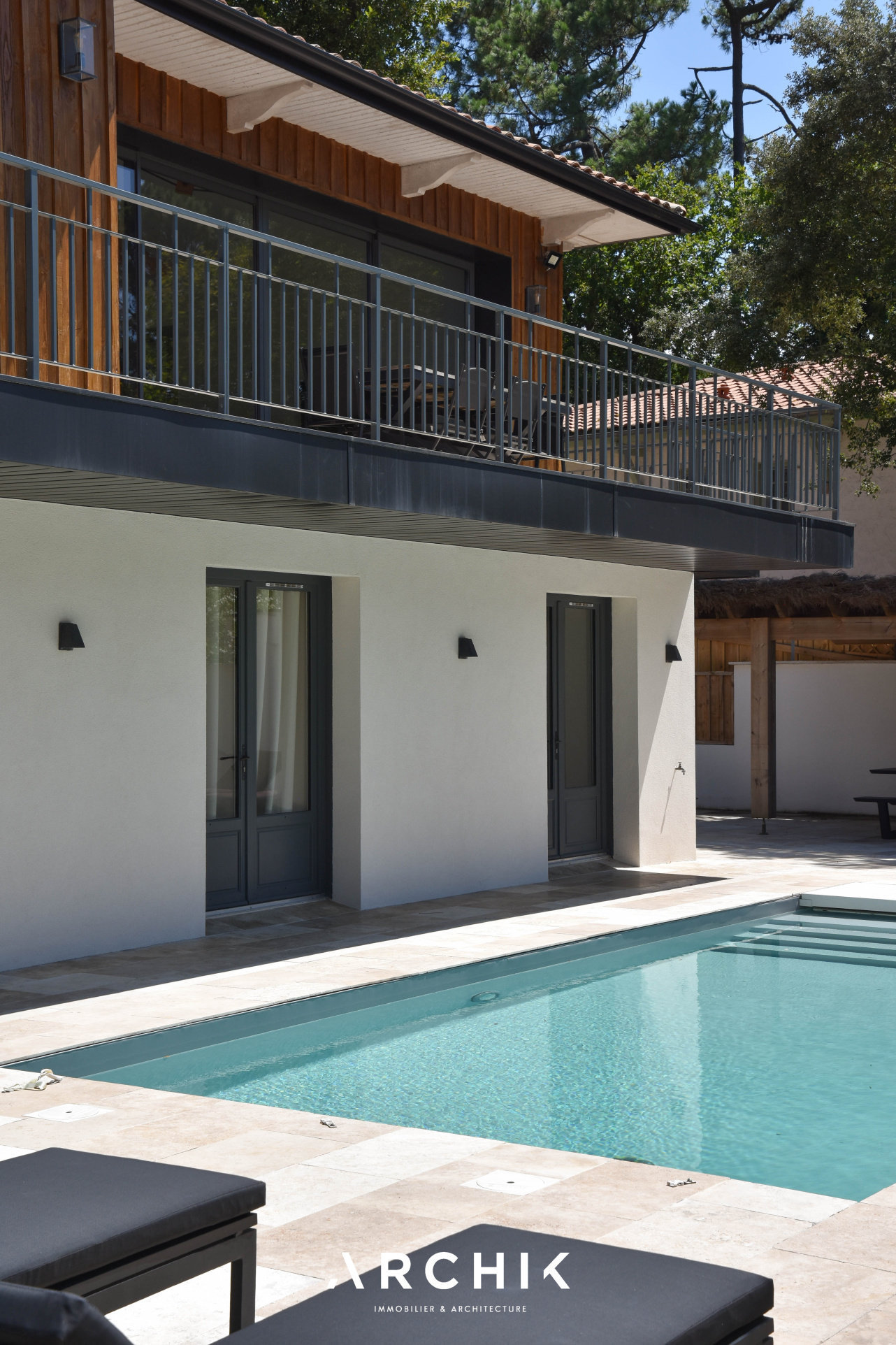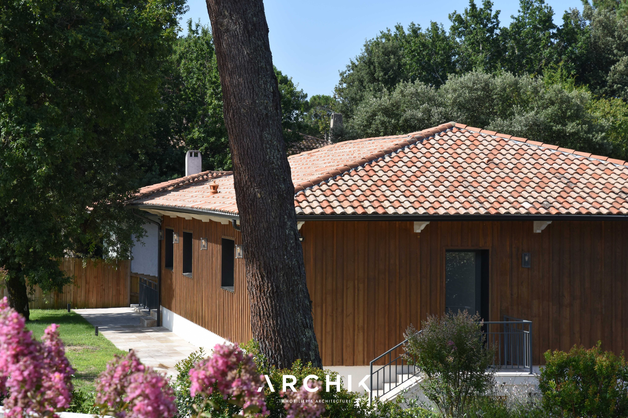 Rénovée dans les règles de l'art en 2022, cette maison en plan inversé se déploie sur deux niveaux épousant la pente naturelle du terrain. De l'extérieur, ce sont deux volumes qui se superposent : la base en enduit blanc et l'étage en bardage bois, typique du bassin.
