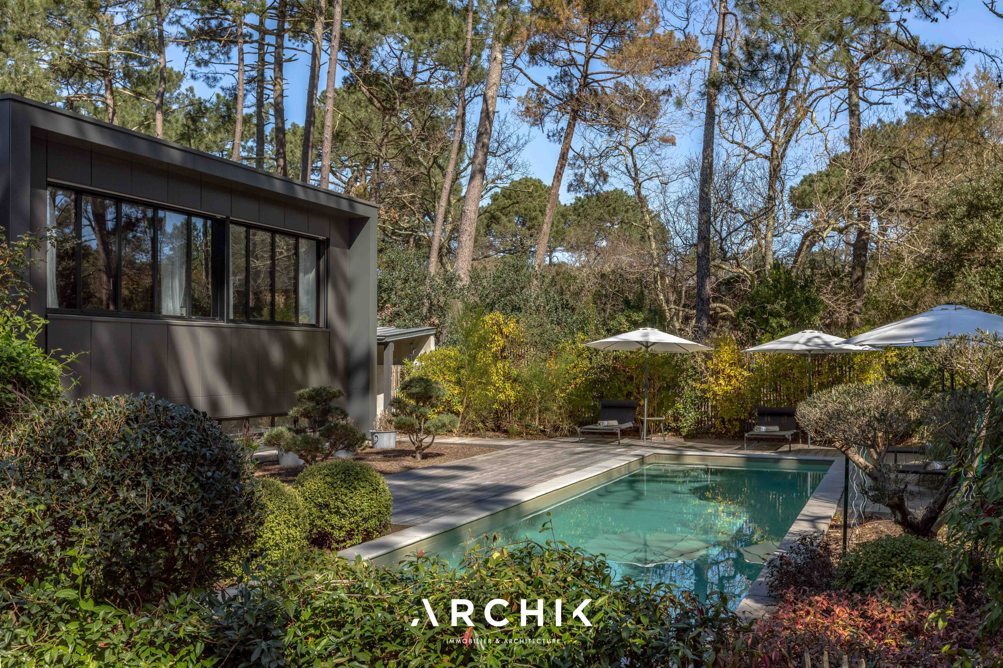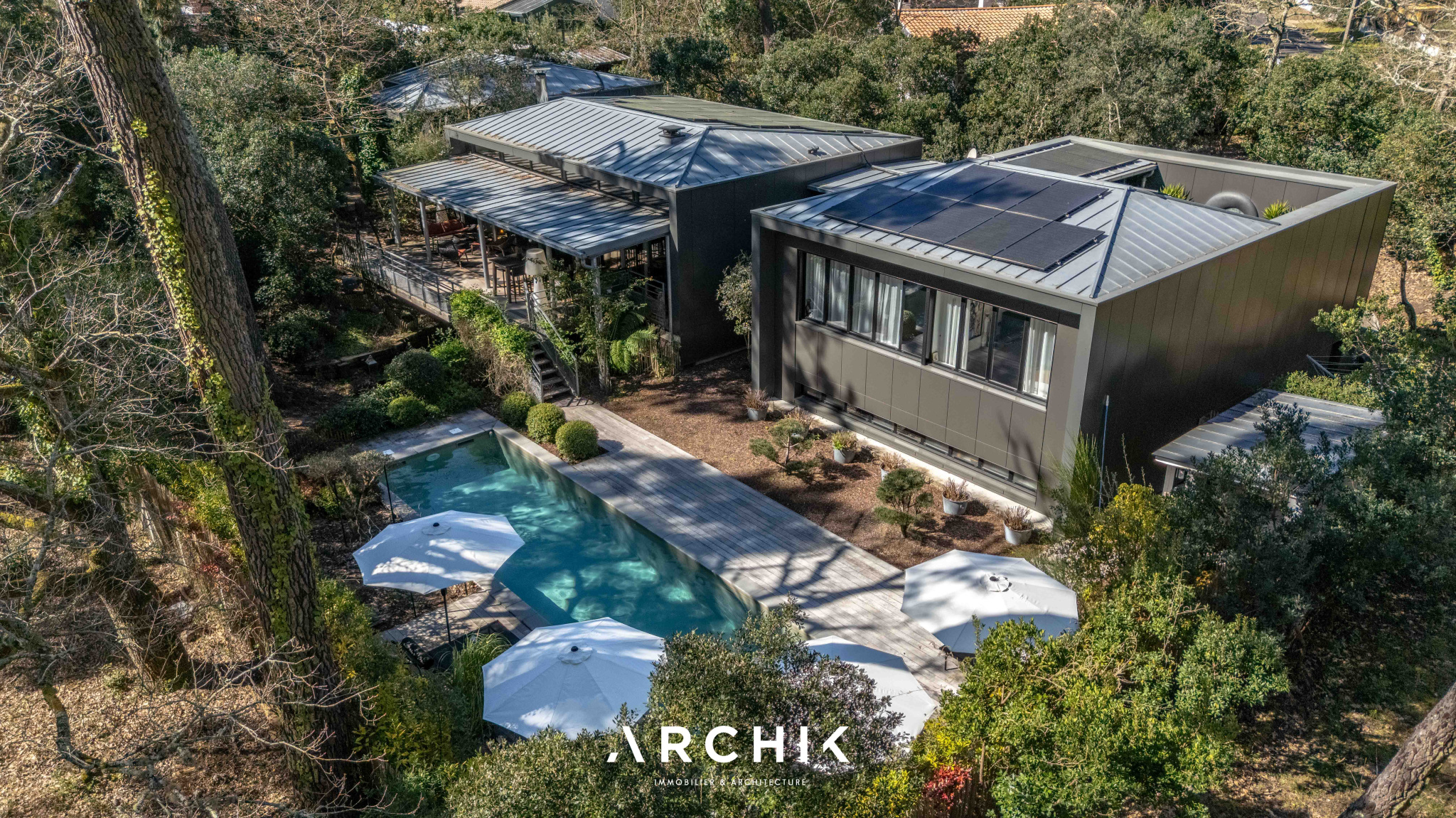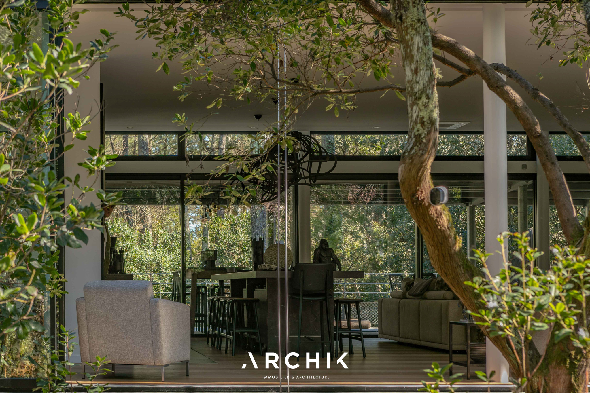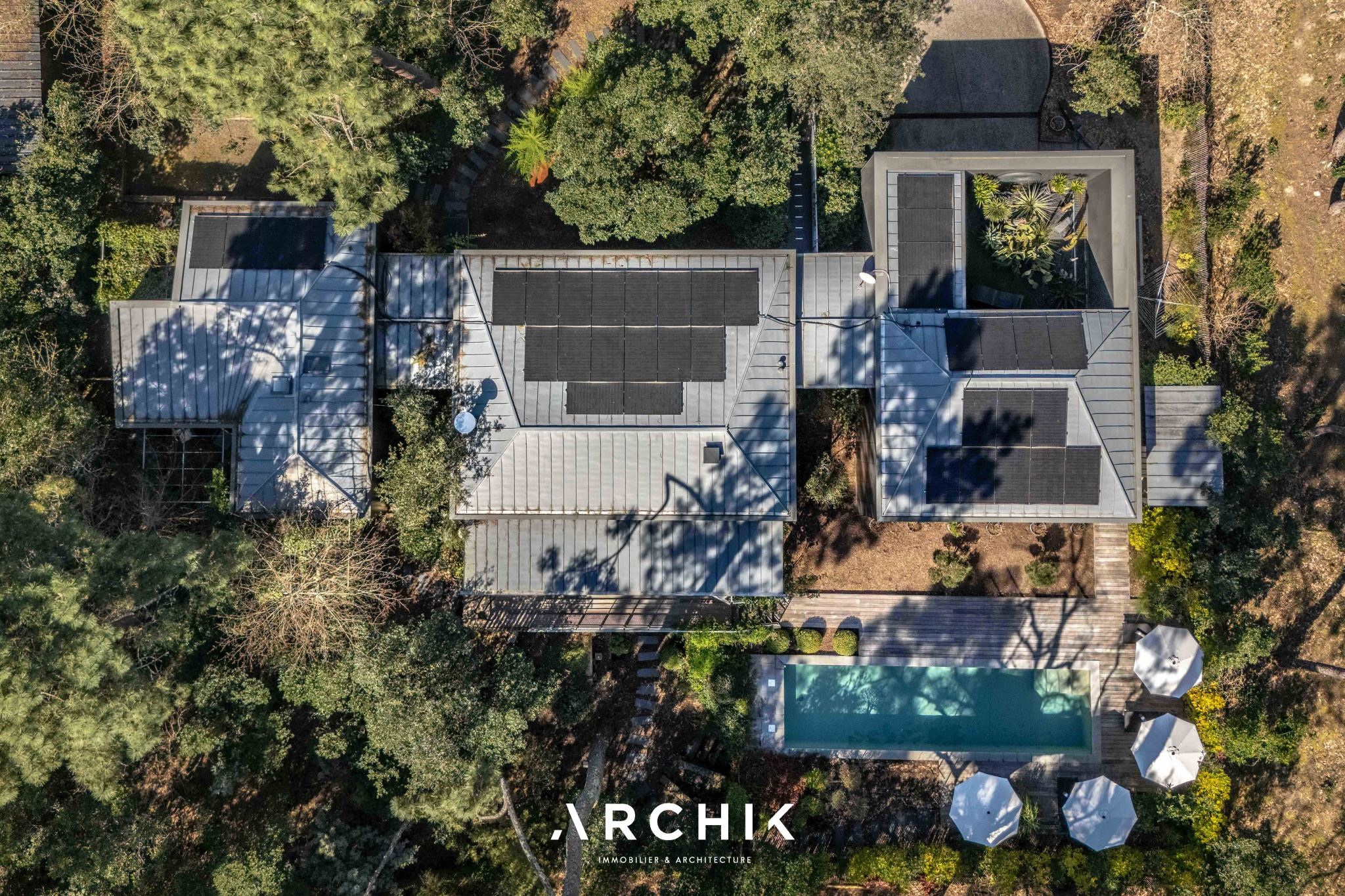 Construite en 2021 par le cabinet d'architectes Bordelais MAJCZ, fondé par Martine Arrivet et Jean-Charles Zebo, cette réalisation incarne une vision affirmée d'une architecture parfaitement intégrée à son cadre naturel. Les larges surfaces vitrées effacent les frontières entre intérieur et extérieur, laissant la nature s'inviter pleinement dans les espaces de vie. Pensée de plain-pied, en parfaite harmonie avec la topographie du terrain, la maison s'organise en trois sections distinctes, chacune dédiée à un usage spécifique. La pièce de vie, traversante et baignée de lumière, impressionne par ses volumes. Elle s'ouvre en totalité par un jeu de baies coulissantes et donne sur une terrasse couverte, prolongée par un espace piscine tourné vers la forêt. De part et d'autre de ce volume aux lignes épurées, reliés par des circulations transparentes, les pavillons offrent une distribution idéale : l'un dédié aux enfants composé de trois chambres avec chacune leur propre terrasse, l'autre, une suite parentale avec salle d'eau et grand dressing bénéficiant de son jardin minéral suspendu, où confort et intimité sont les maîtres mots.