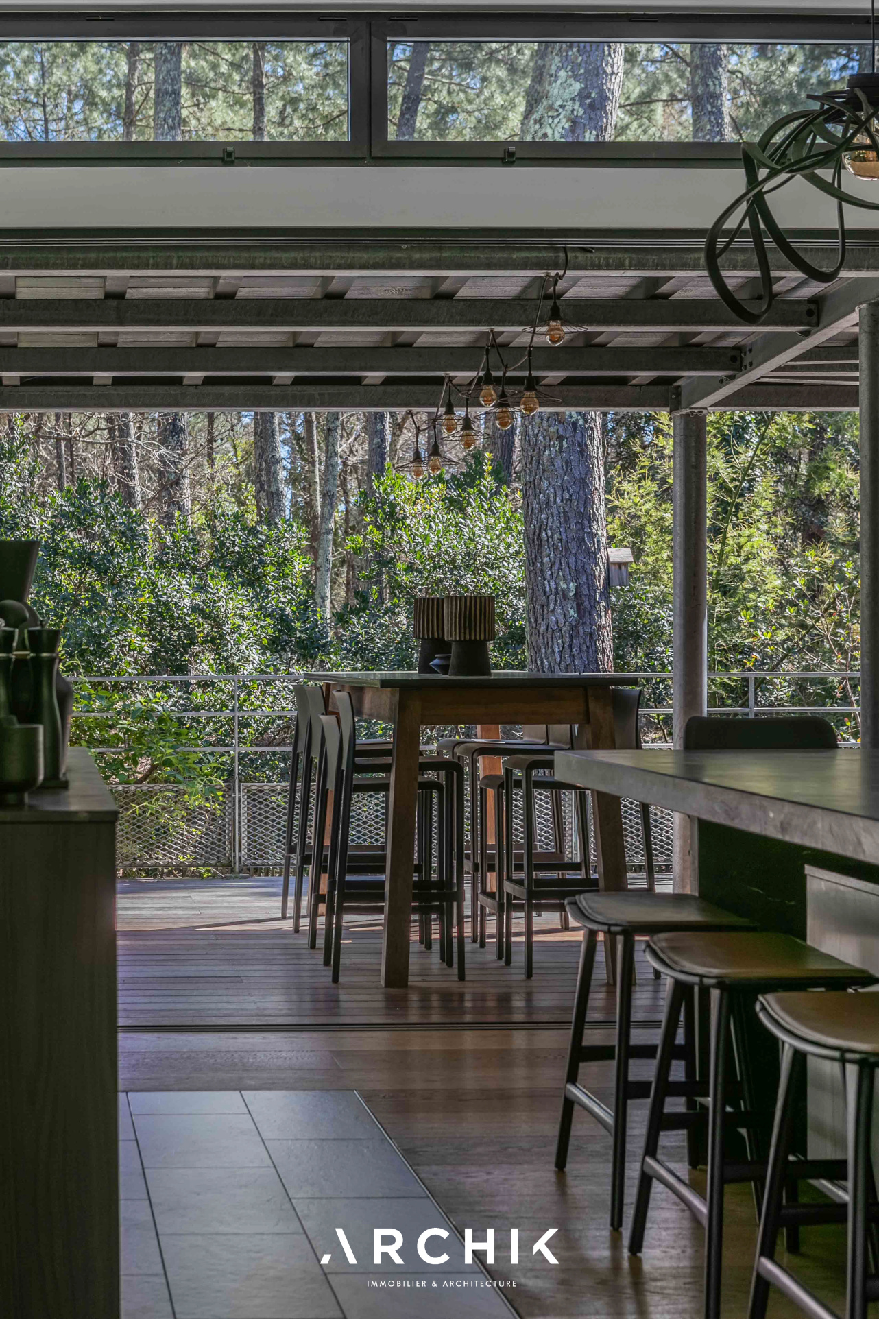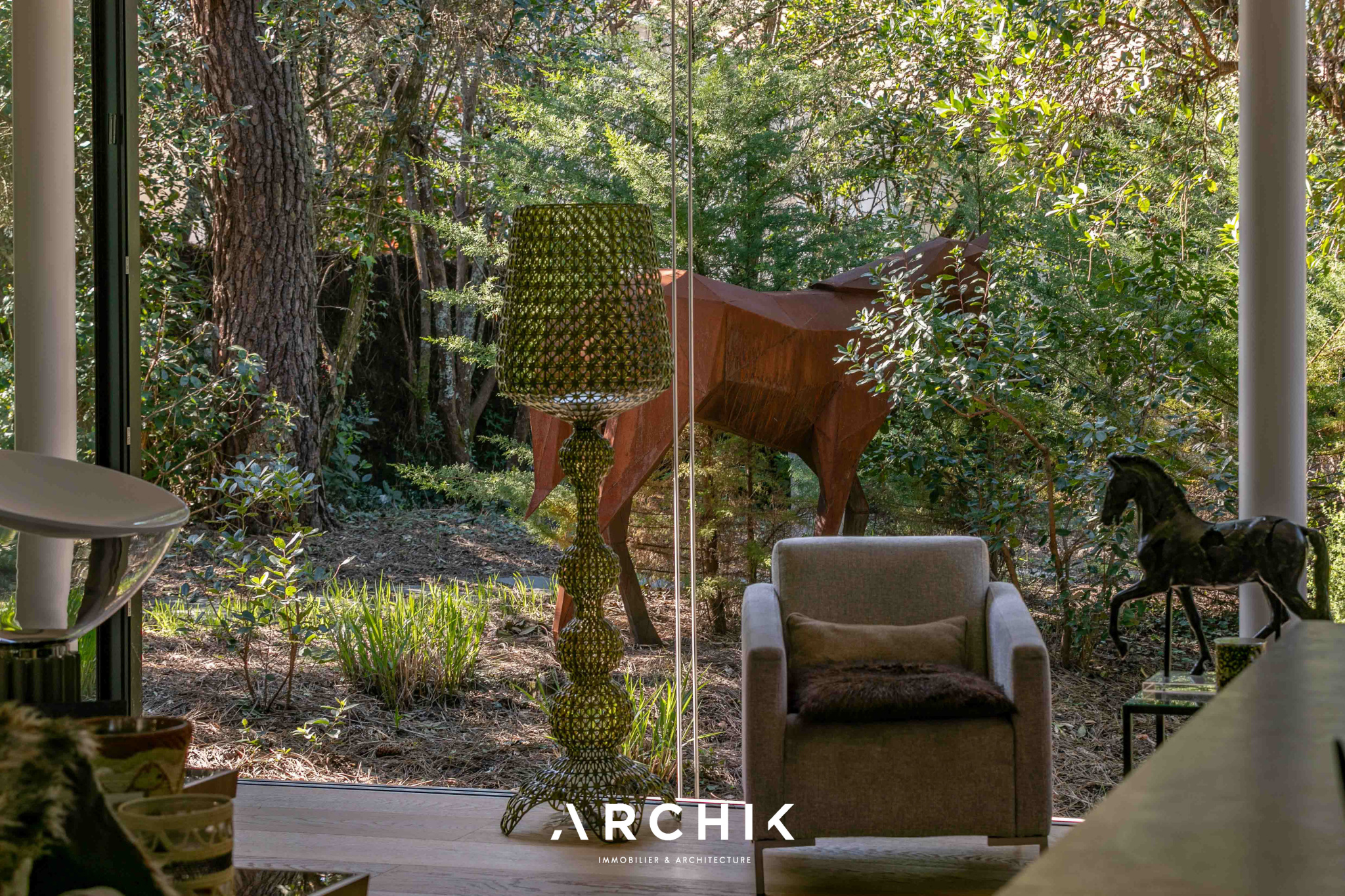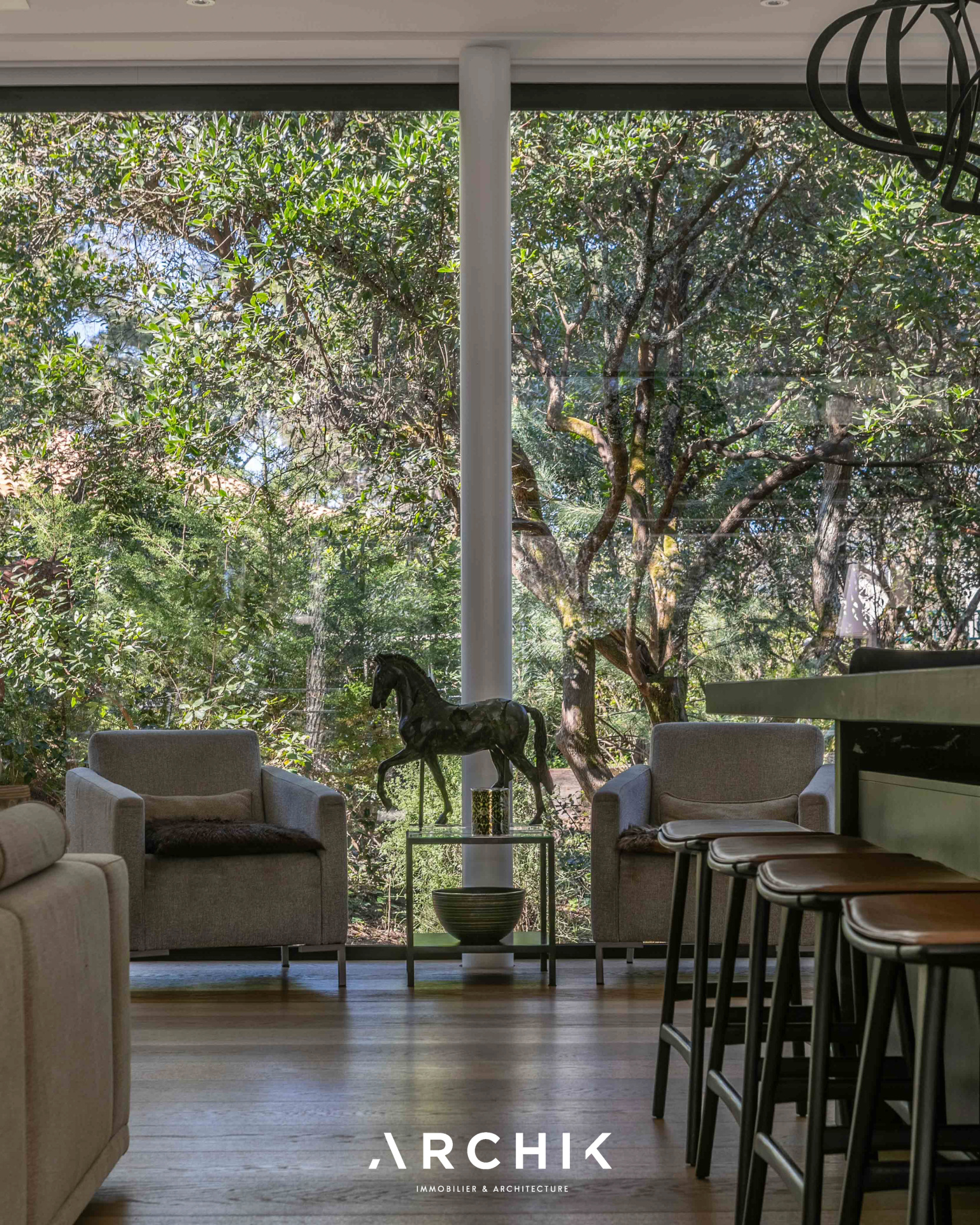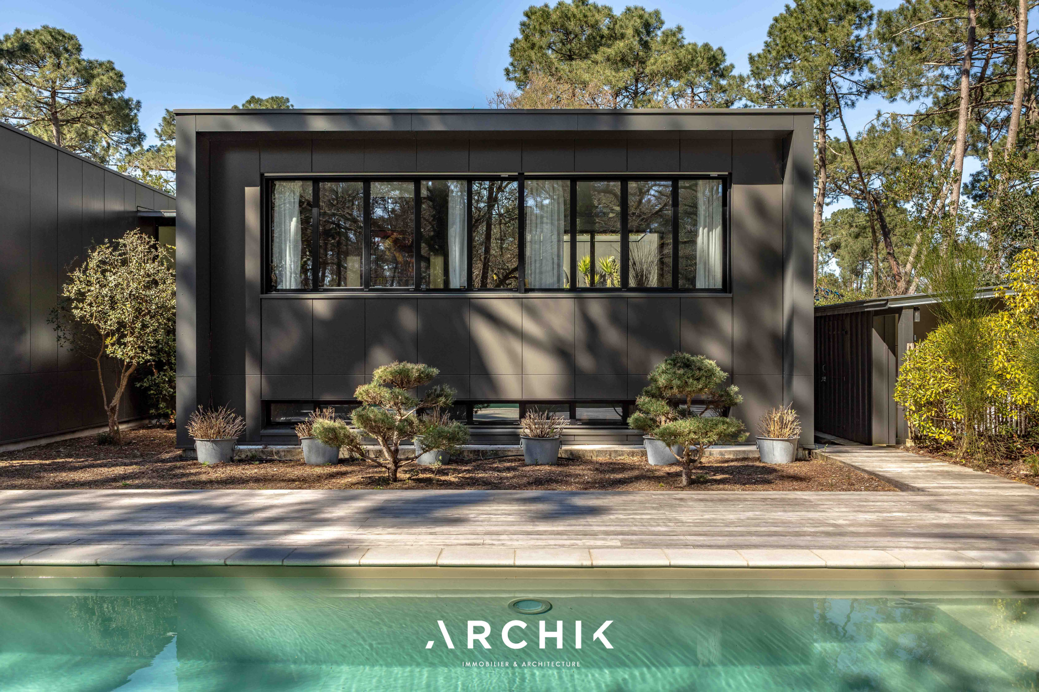Construite en 2021 par le cabinet d'architectes Bordelais MAJCZ, fondé par Martine Arrivet et Jean-Charles Zebo, cette réalisation incarne une vision affirmée d'une architecture parfaitement intégrée à son cadre naturel. Les larges surfaces vitrées effacent les frontières entre intérieur et extérieur, laissant la nature s'inviter pleinement dans les espaces de vie. Pensée de plain-pied, en parfaite harmonie avec la topographie du terrain, la maison s'organise en trois sections distinctes, chacune dédiée à un usage spécifique. La pièce de vie, traversante et baignée de lumière, impressionne par ses volumes. Elle s'ouvre en totalité par un jeu de baies coulissantes et donne sur une terrasse couverte, prolongée par un espace piscine tourné vers la forêt. De part et d'autre de ce volume aux lignes épurées, reliés par des circulations transparentes, les pavillons offrent une distribution idéale : l'un dédié aux enfants composé de trois chambres avec chacune leur propre terrasse, l'autre, une suite parentale avec salle d'eau et grand dressing bénéficiant de son jardin minéral suspendu, où confort et intimité sont les maîtres mots.