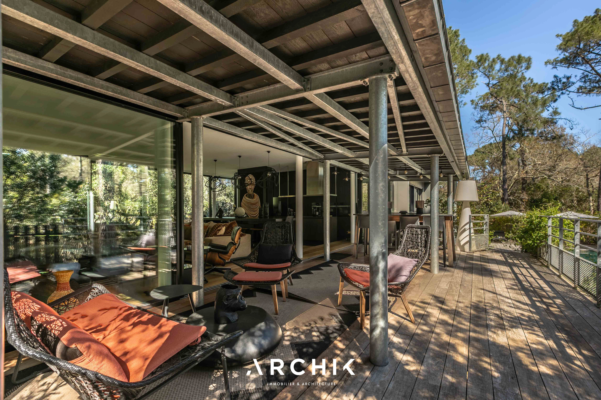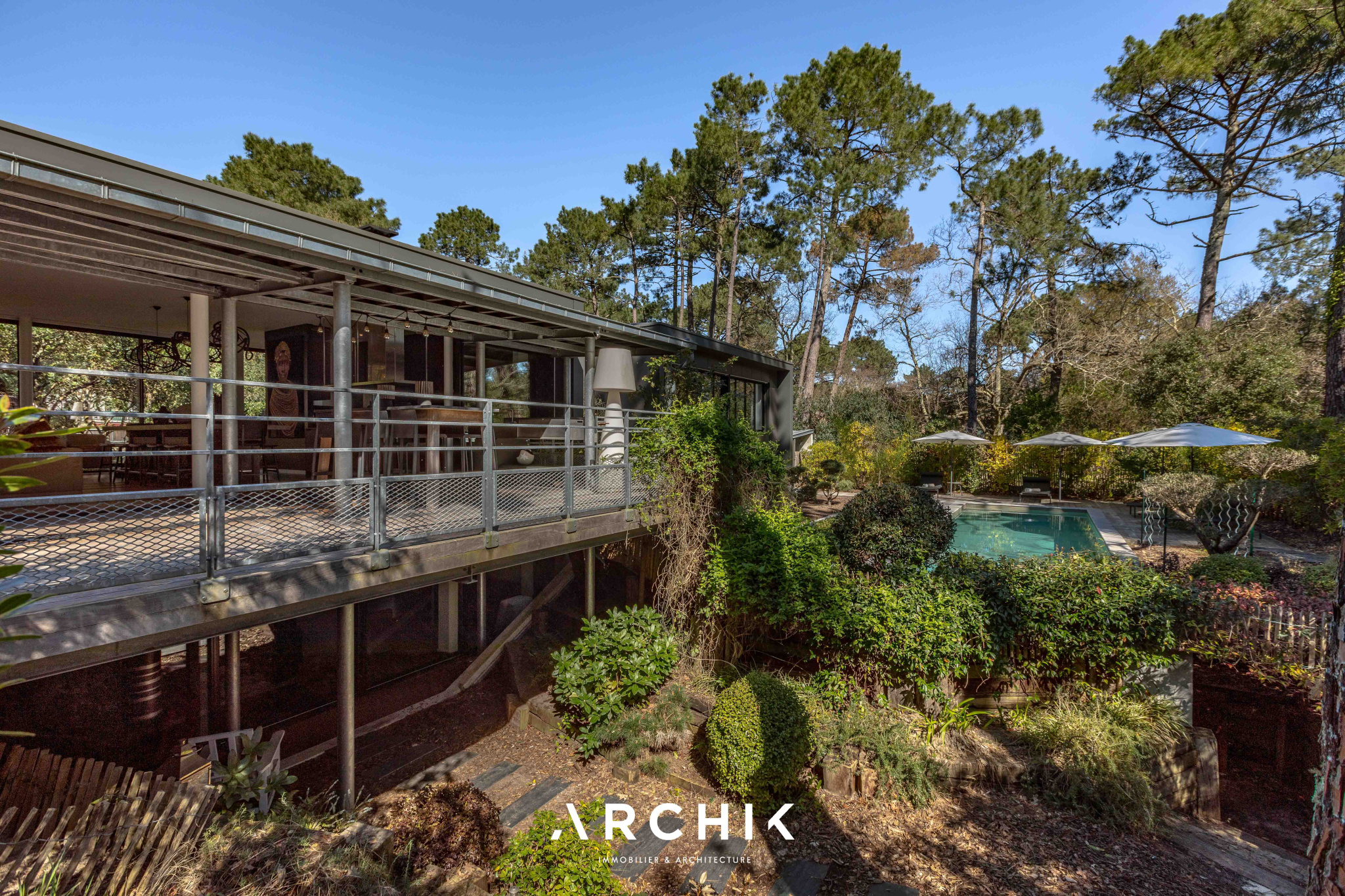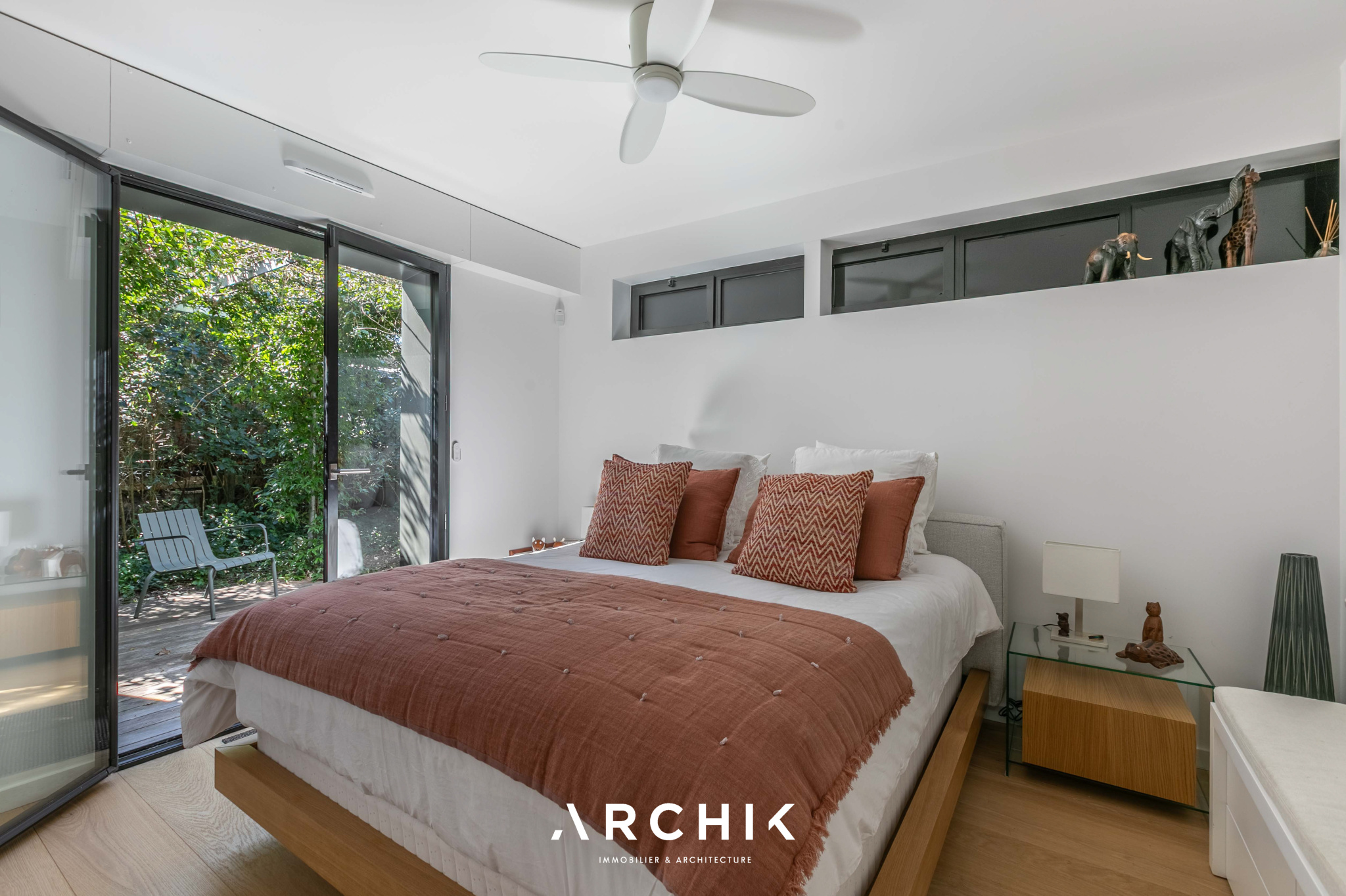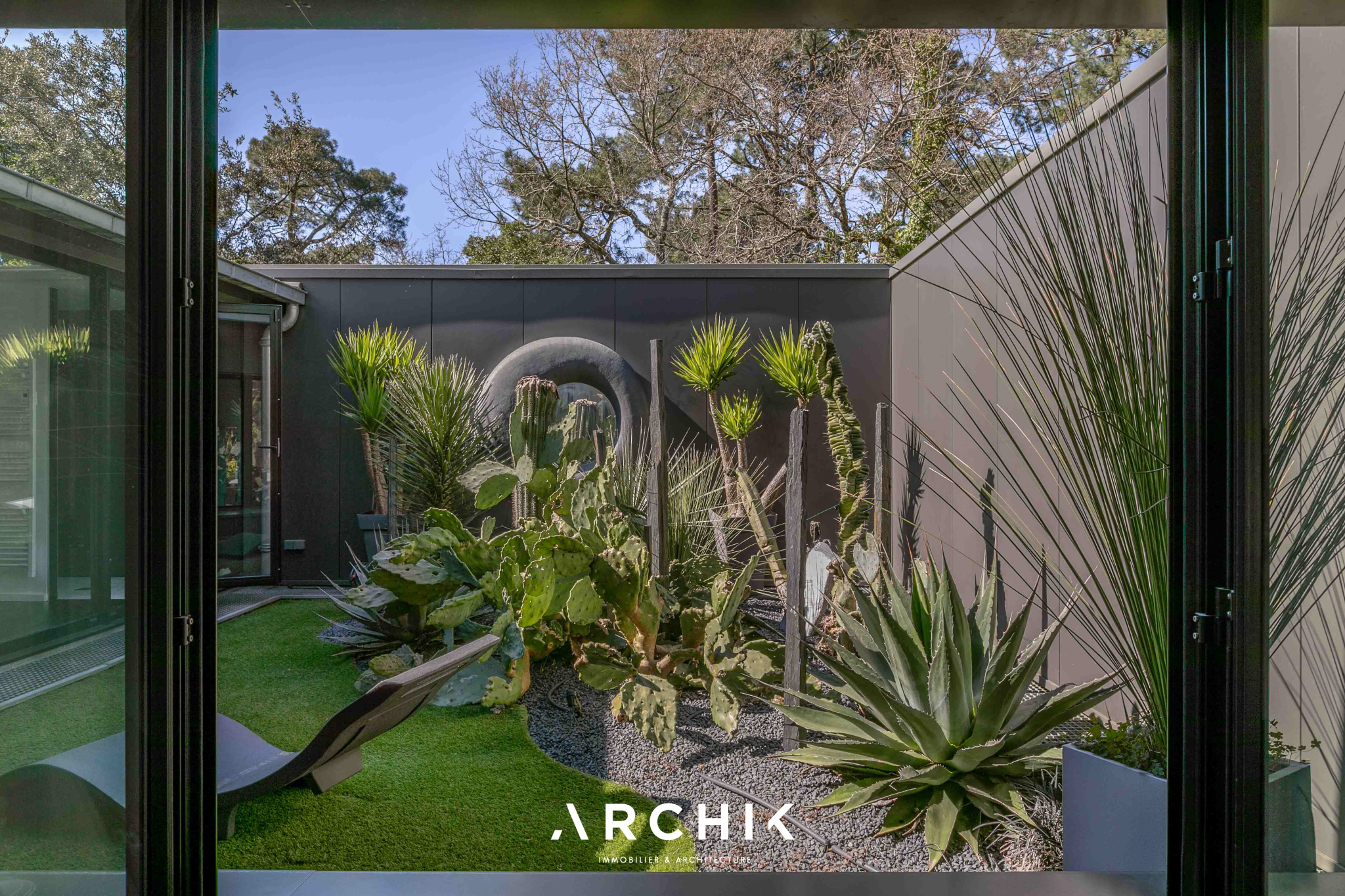 Construite en 2021 par le cabinet d'architectes Bordelais MAJCZ, fondé par Martine Arrivet et Jean-Charles Zebo, cette réalisation incarne une vision affirmée d'une architecture parfaitement intégrée à son cadre naturel. Les larges surfaces vitrées effacent les frontières entre intérieur et extérieur, laissant la nature s'inviter pleinement dans les espaces de vie. Pensée de plain-pied, en parfaite harmonie avec la topographie du terrain, la maison s'organise en trois sections distinctes, chacune dédiée à un usage spécifique. La pièce de vie, traversante et baignée de lumière, impressionne par ses volumes. Elle s'ouvre en totalité par un jeu de baies coulissantes et donne sur une terrasse couverte, prolongée par un espace piscine tourné vers la forêt. De part et d'autre de ce volume aux lignes épurées, reliés par des circulations transparentes, les pavillons offrent une distribution idéale : l'un dédié aux enfants composé de trois chambres avec chacune leur propre terrasse, l'autre, une suite parentale avec salle d'eau et grand dressing bénéficiant de son jardin minéral suspendu, où confort et intimité sont les maîtres mots.