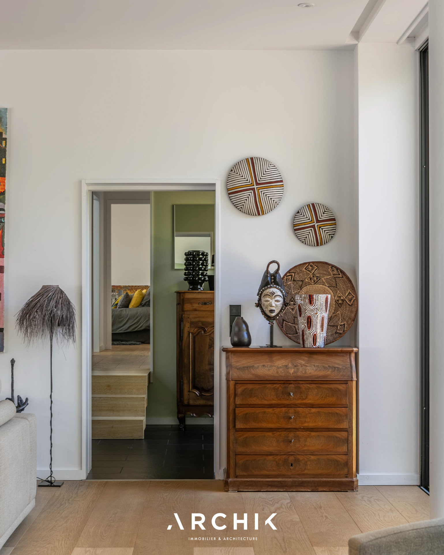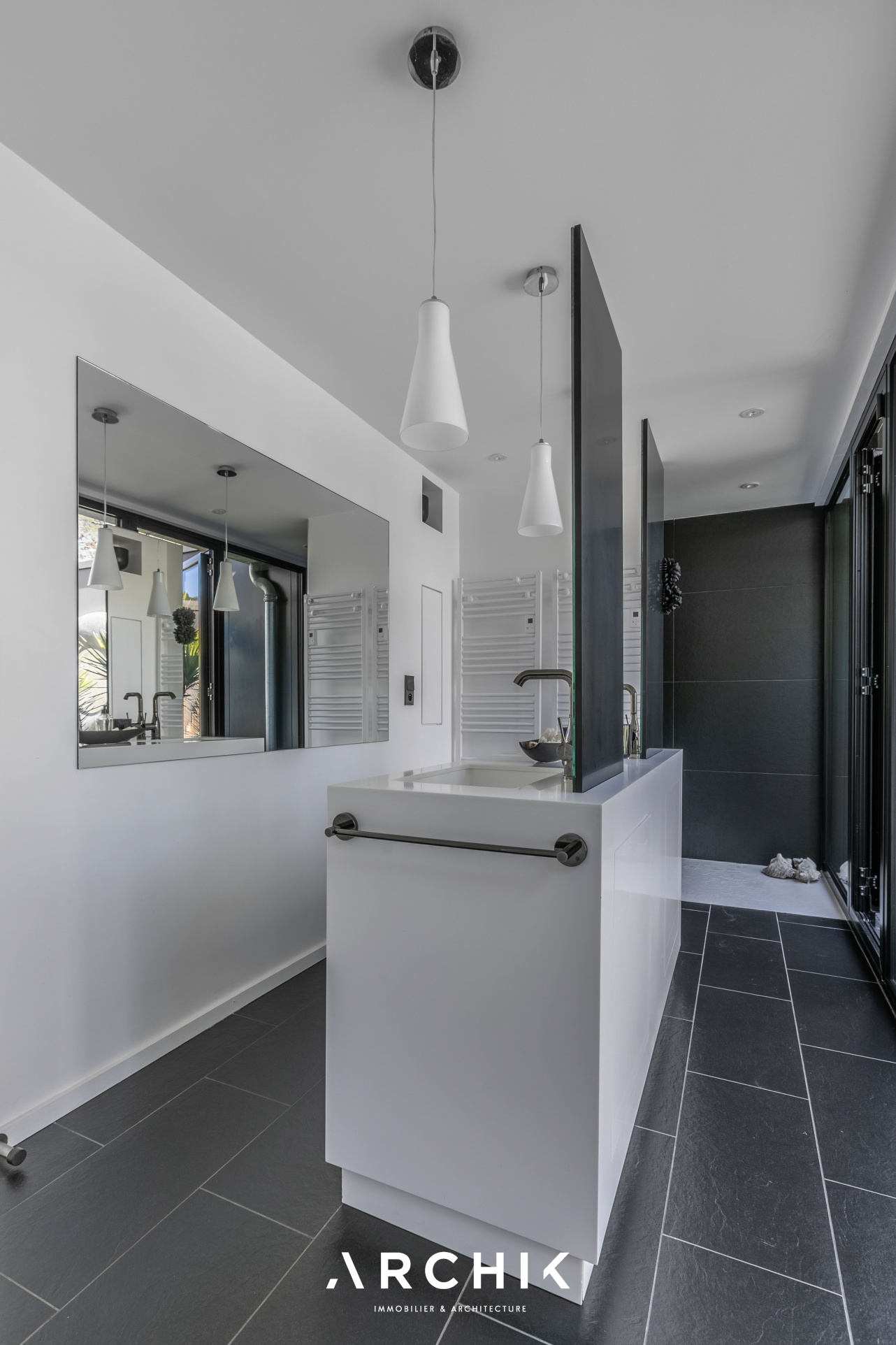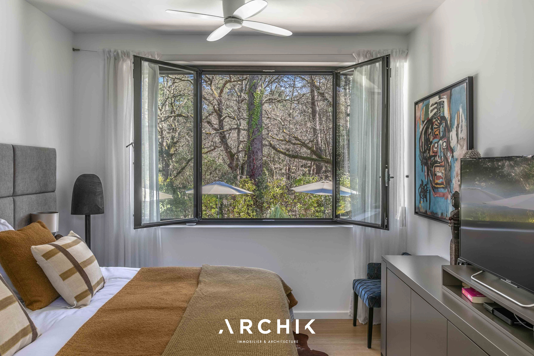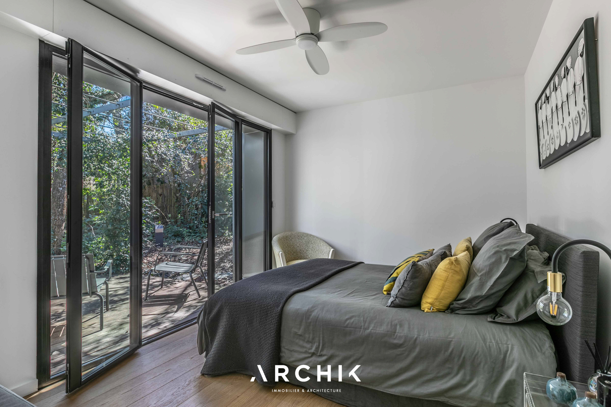 Construite en 2021 par le cabinet d'architectes Bordelais MAJCZ, fondé par Martine Arrivet et Jean-Charles Zebo, cette réalisation incarne une vision affirmée d'une architecture parfaitement intégrée à son cadre naturel. Les larges surfaces vitrées effacent les frontières entre intérieur et extérieur, laissant la nature s'inviter pleinement dans les espaces de vie. Pensée de plain-pied, en parfaite harmonie avec la topographie du terrain, la maison s'organise en trois sections distinctes, chacune dédiée à un usage spécifique. La pièce de vie, traversante et baignée de lumière, impressionne par ses volumes. Elle s'ouvre en totalité par un jeu de baies coulissantes et donne sur une terrasse couverte, prolongée par un espace piscine tourné vers la forêt. De part et d'autre de ce volume aux lignes épurées, reliés par des circulations transparentes, les pavillons offrent une distribution idéale : l'un dédié aux enfants composé de trois chambres avec chacune leur propre terrasse, l'autre, une suite parentale avec salle d'eau et grand dressing bénéficiant de son jardin minéral suspendu, où confort et intimité sont les maîtres mots.