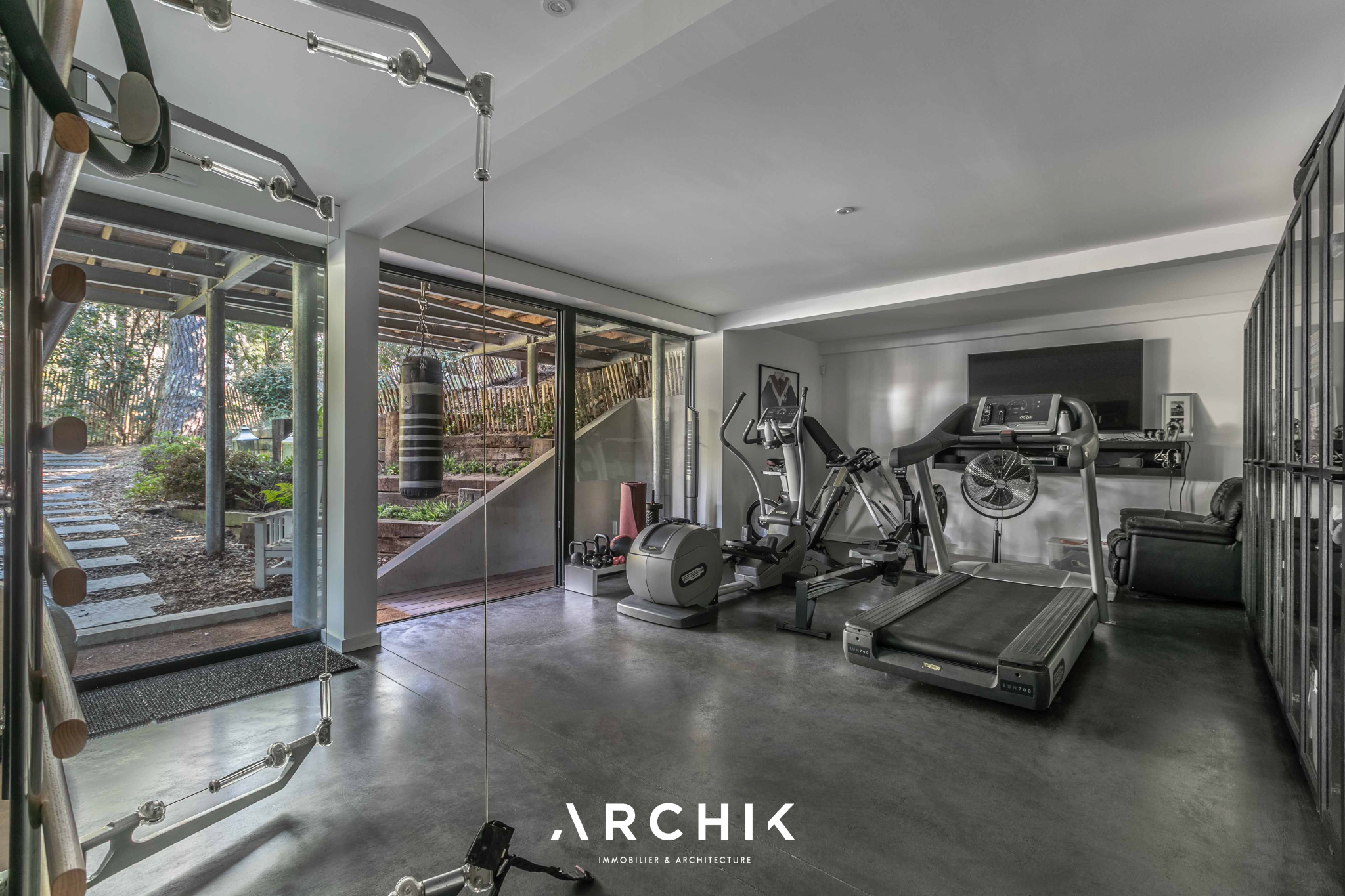 Au niveau inférieur, une salle de sport, une suite pour les invités avec salle d'eau, une buanderie, des pièces hybrides ainsi qu'un garage double complètent les prestations haut de gamme. À l'extérieur, les terrasses et la piscine s'intègrent harmonieusement dans un écrin végétal composé d'essences locales, avec la forêt en toile de fond.