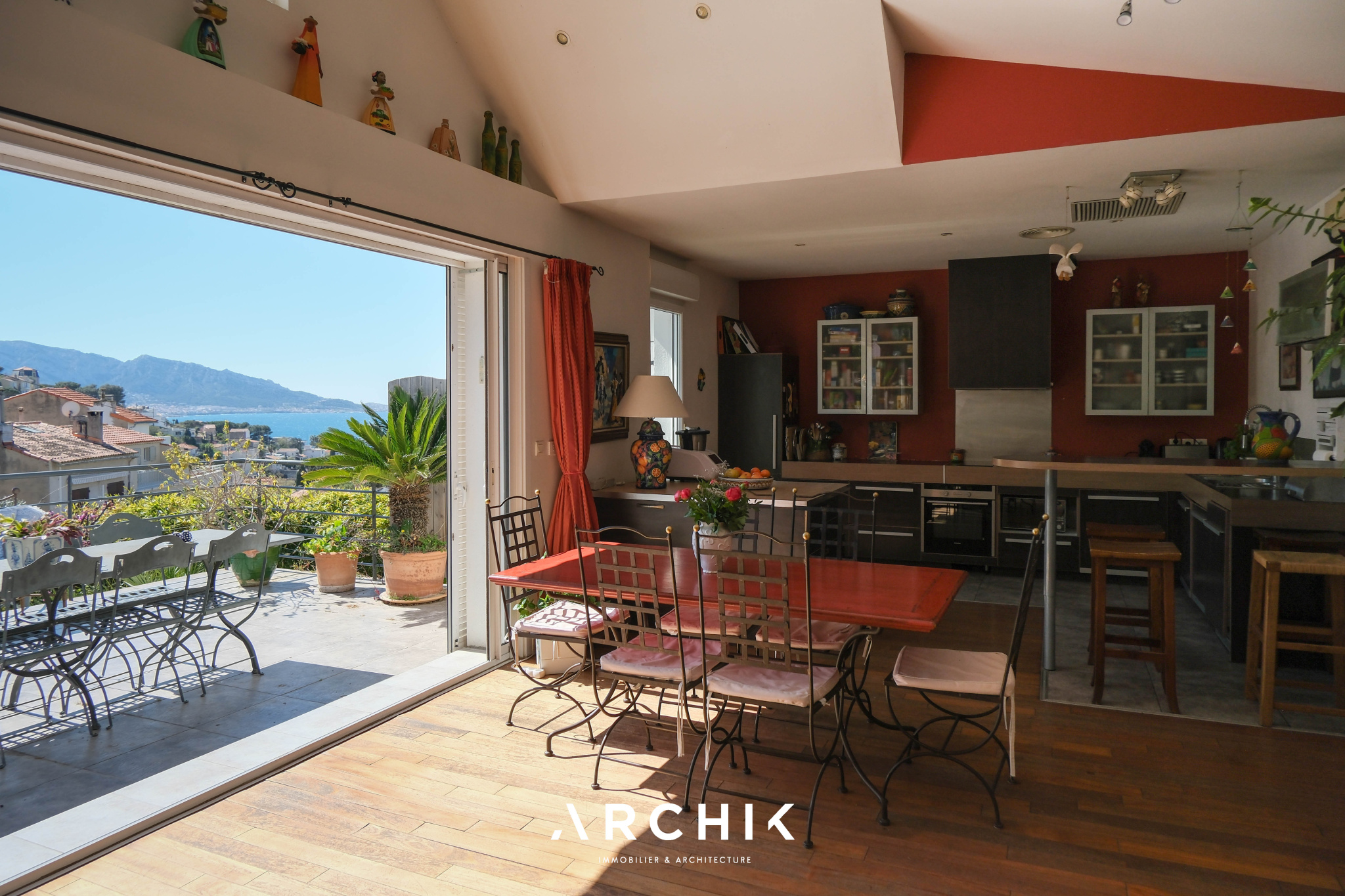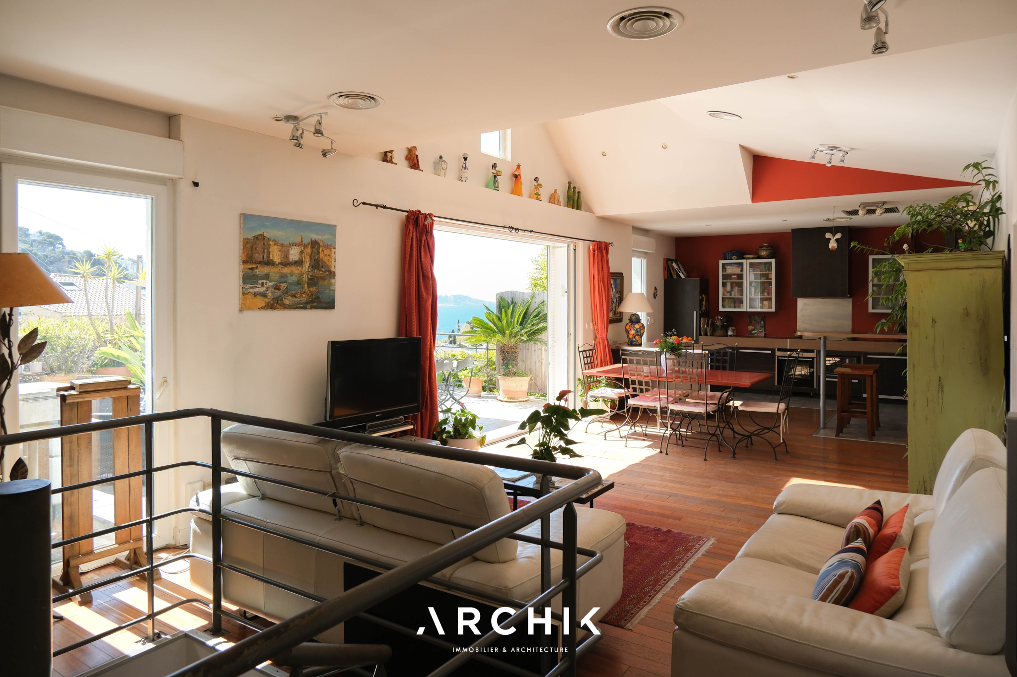 A l'étage, l'espace de vie décloisonné s'organise dans un volume généreux en double hauteur et baigné de lumière. Les lignes s'effacent au profit de la sensation d'espace. Le parquet en bois réchauffe l'ensemble, tandis que les touches de couleurs, les matières et les éléments décoratifs insufflent un esprit convivial, presque artistique, évoquant une maison de vacances. La cuisine s'habille de rouge et s'organise autour d'un ilot convivial qui prolonge naturellement les espaces de réception. Une large baie centrale ouvre sur une terrasse panoramique de 60 m2 pensée comme une pièce de vie posée au-dessus de la mer. Elle offre un panorama unique entre le ciel et la mer.