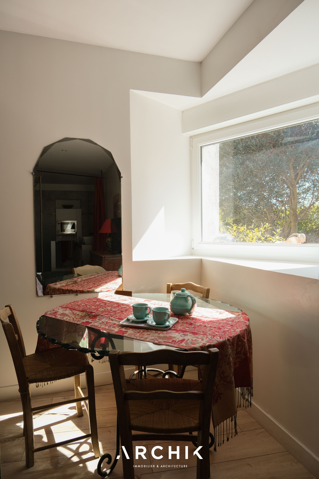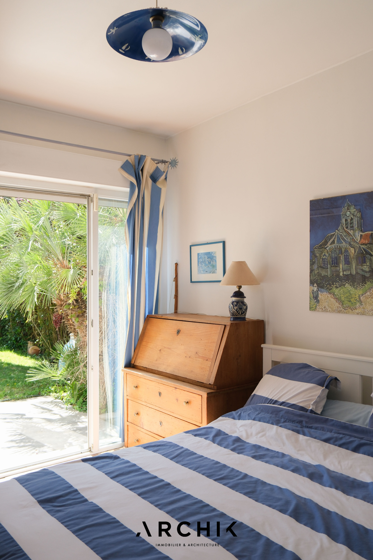 A l'intérieur, les espaces de vie se développent sur deux niveaux. En rez-de-jardin, l'espace nuit offre quatre chambres, dont deux traitées en suite. Chacune d'entre elles bénéficie d'une ouverture singulière sur l'extérieur : vue mer, prolongement vers un patio intime et coloré ou encore accès direct à la végétation. Les frontières entre intérieur et extérieur s'effacent, offrant une sensation unique : celle de vivre et de dormir au coeur du jardin. Un bureau et une salle d'eau viennent compléter ce niveau.
