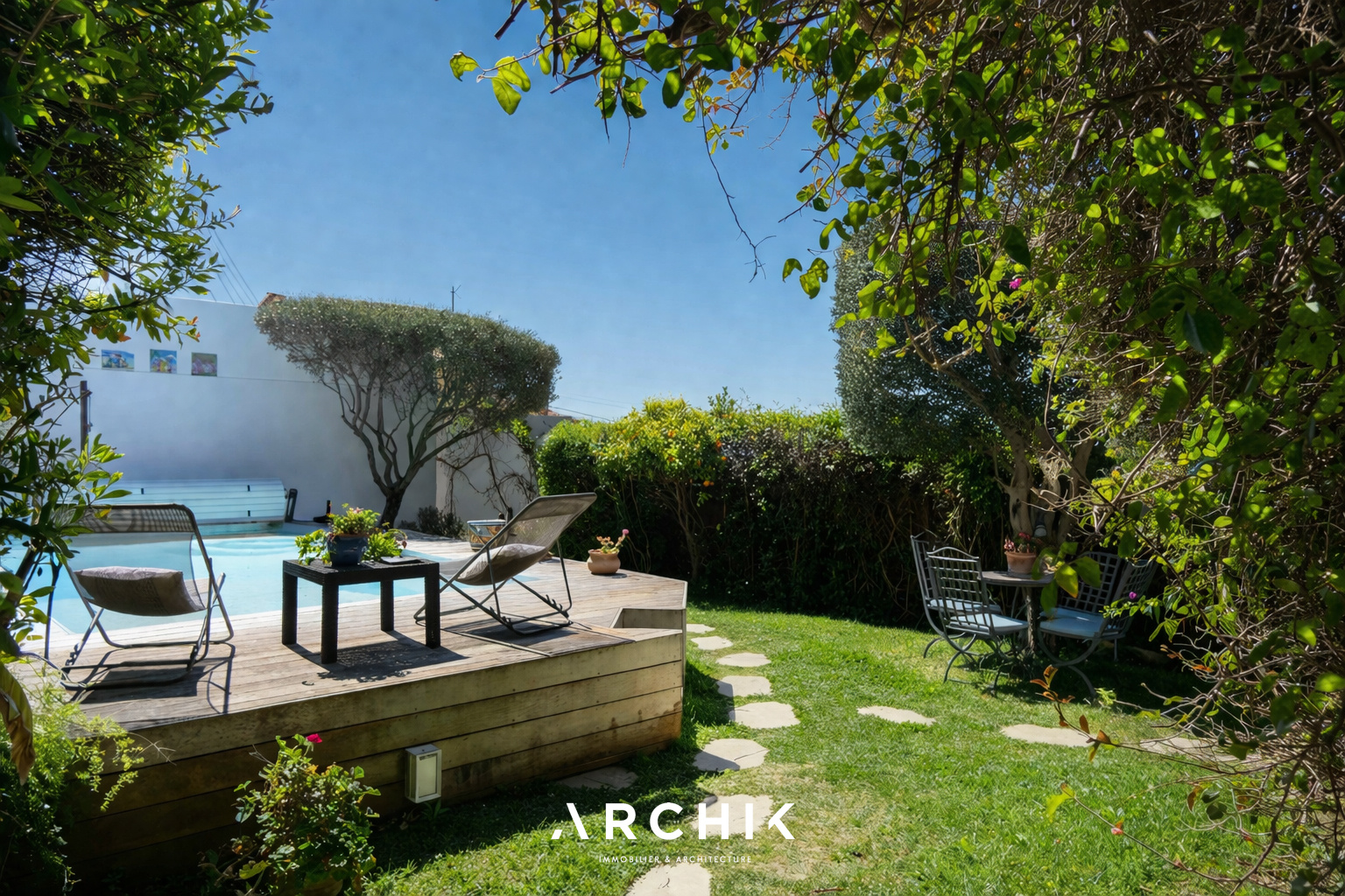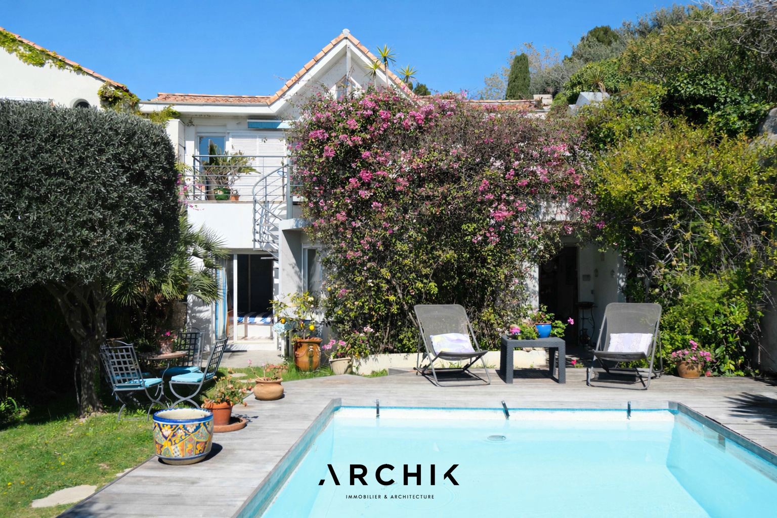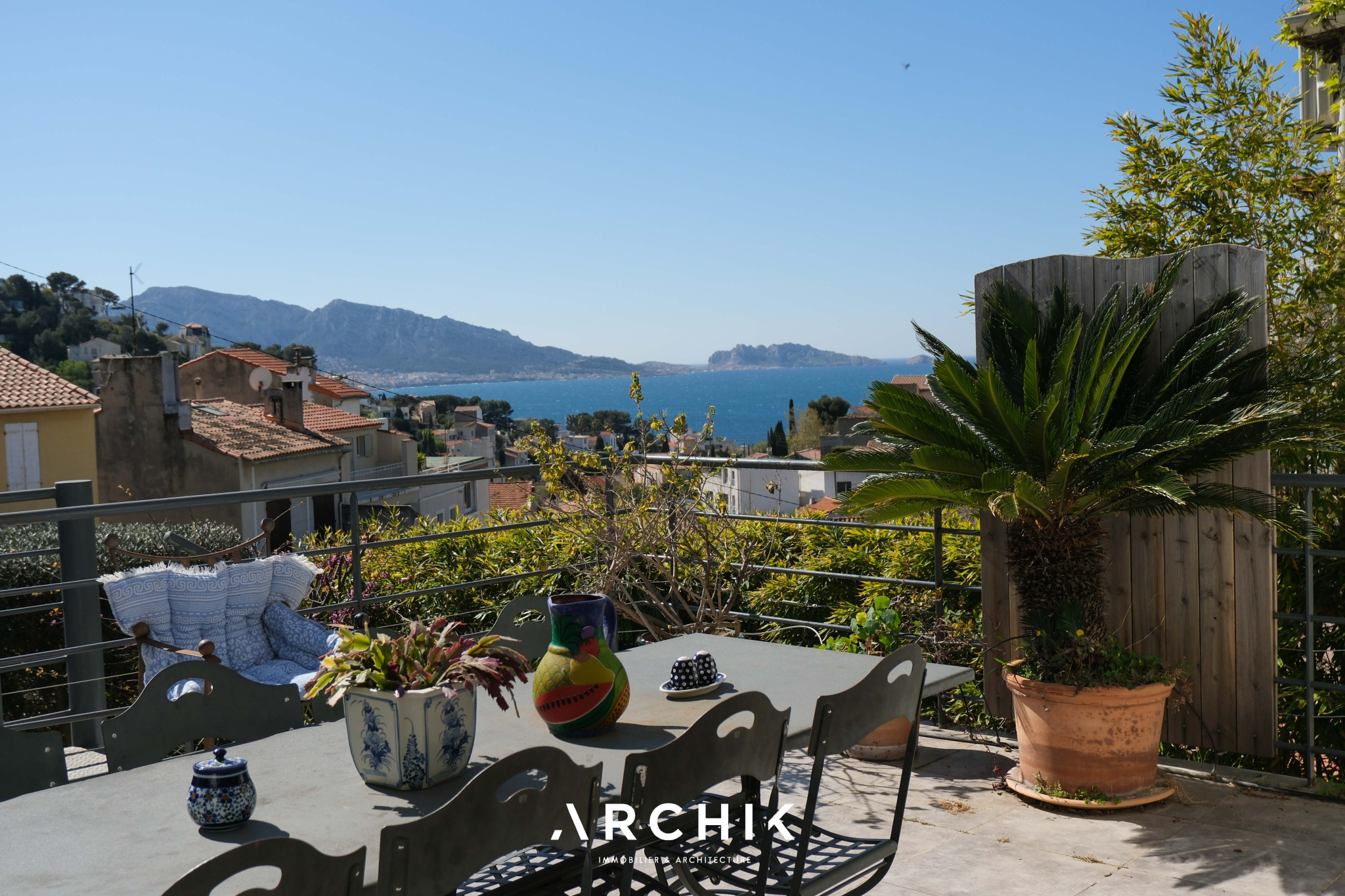Architecture vernaculaire aux inspirations insulaires, cette maison de 163 m2 et son jardin aux accents bucoliques offre des vues panoramiques sur la baie de Marseille et s'insère au sein d'un tissu ancien en plein coeur du quartier de Bompard.