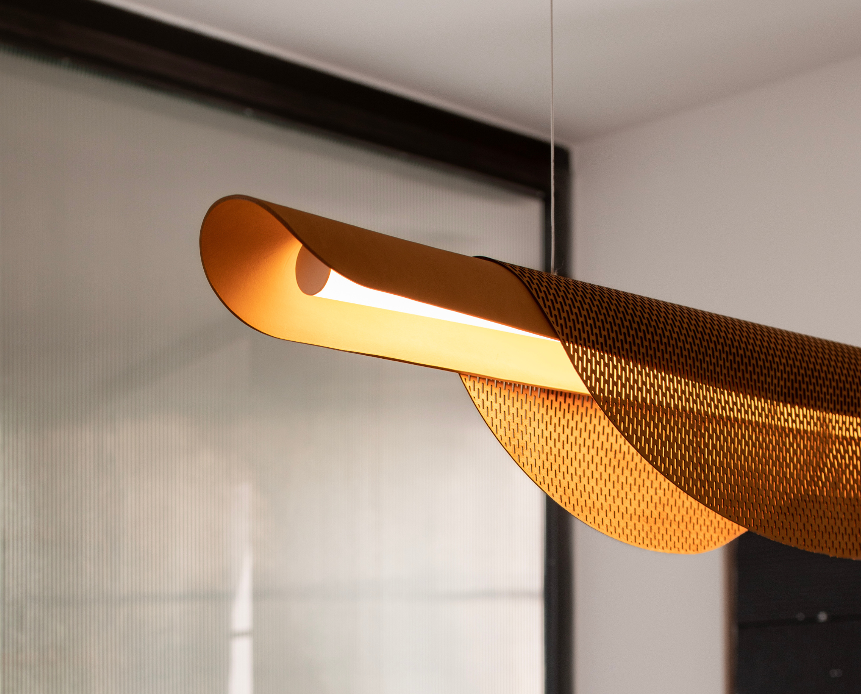 La suspension ONDE(S) interroge les potentiels du cuir. « La matière est suspendue simplement, sans ajout, l’objet valorise ainsi les potentiels du cuir, en tant que structurant formel et filtre souple visuel. Le moulage rigidifie le cuir pour former la coque du luminaire, la perforation vient alléger la seconde peau, déjà souple naturellement. Elle apporte ainsi une vibration optique fonctionnelle. Ces perforations permettent à la fois de jouer sur notre perception du matériau, de loin nous pourrions y voir une tôle fine, un métal perforé, de près la sensualité du cuir apparaît, puis vibre avec le motif, la trame optique », explique Caroline.
