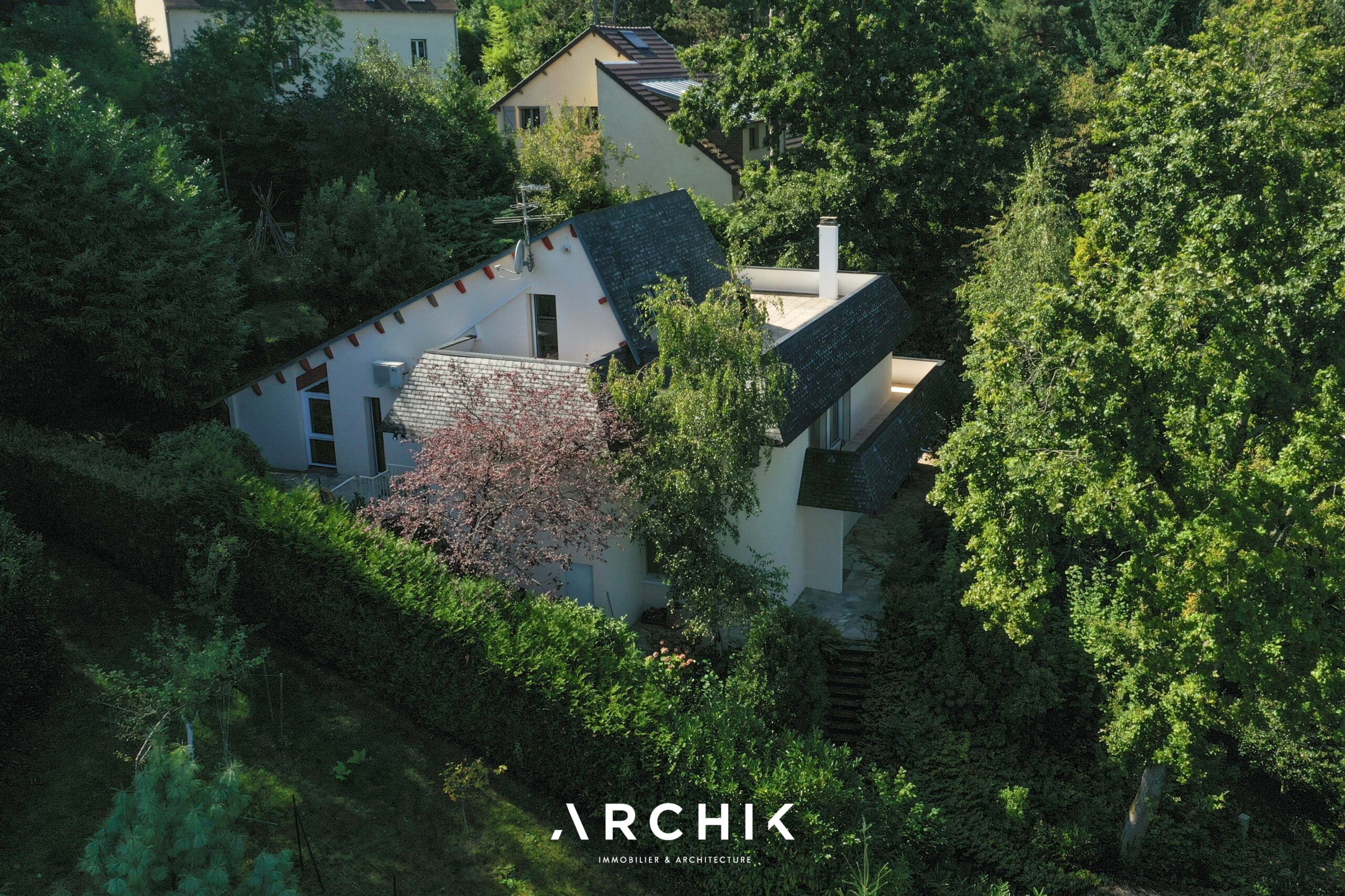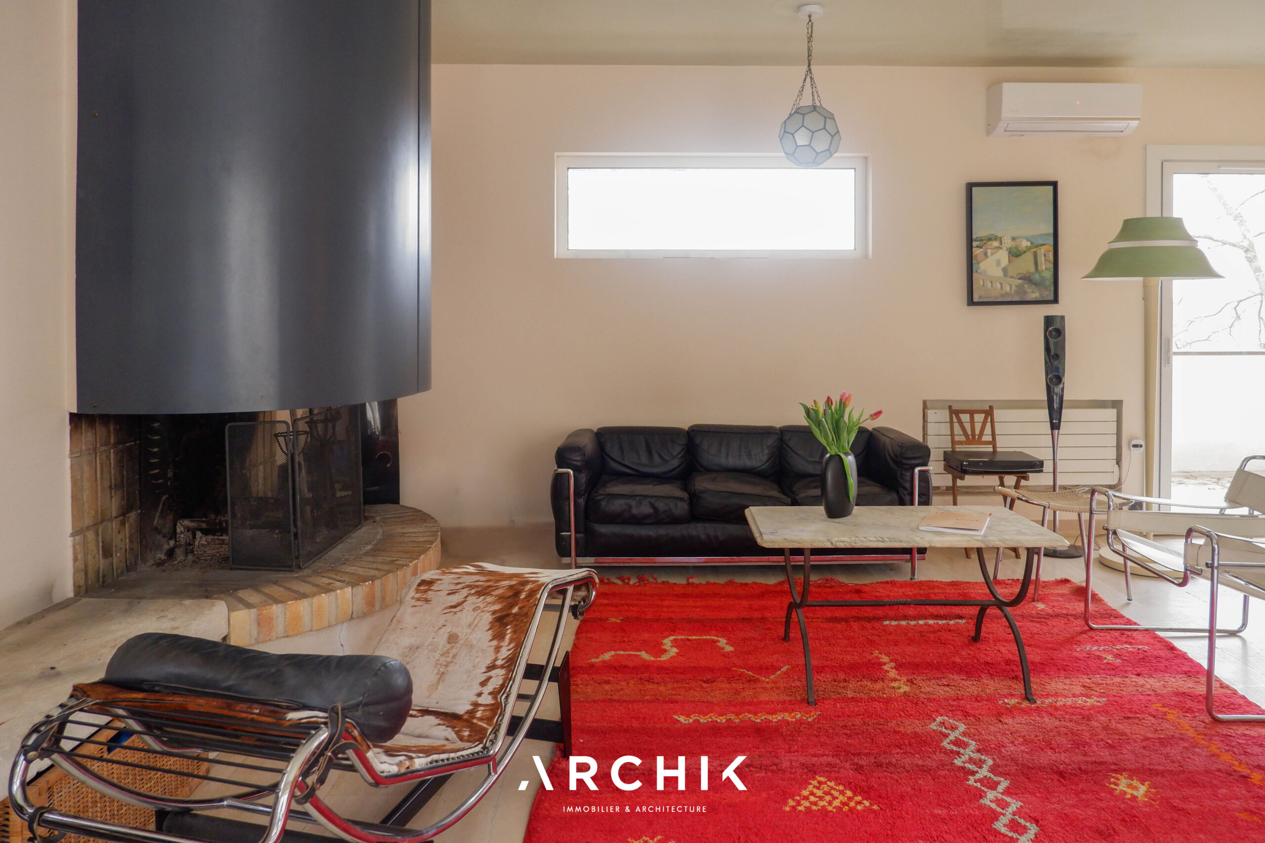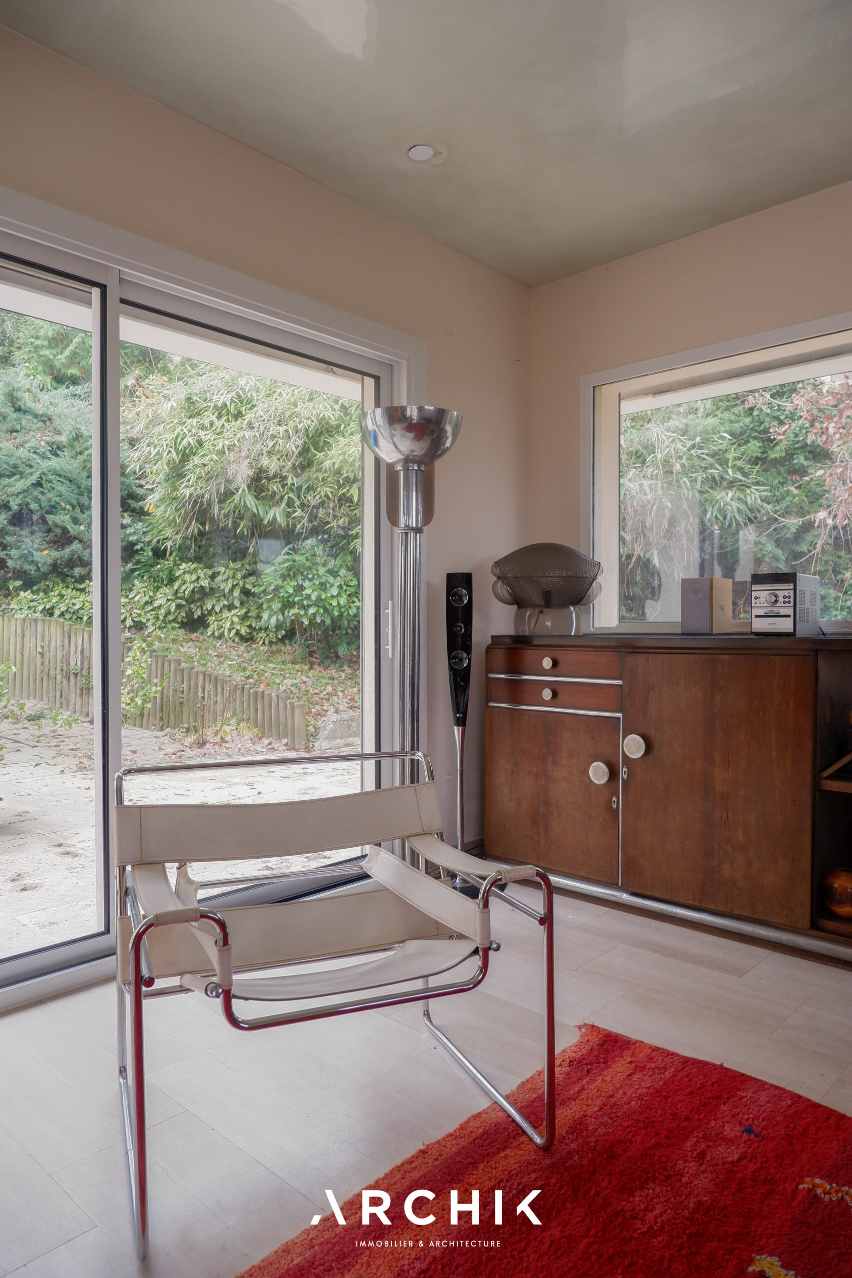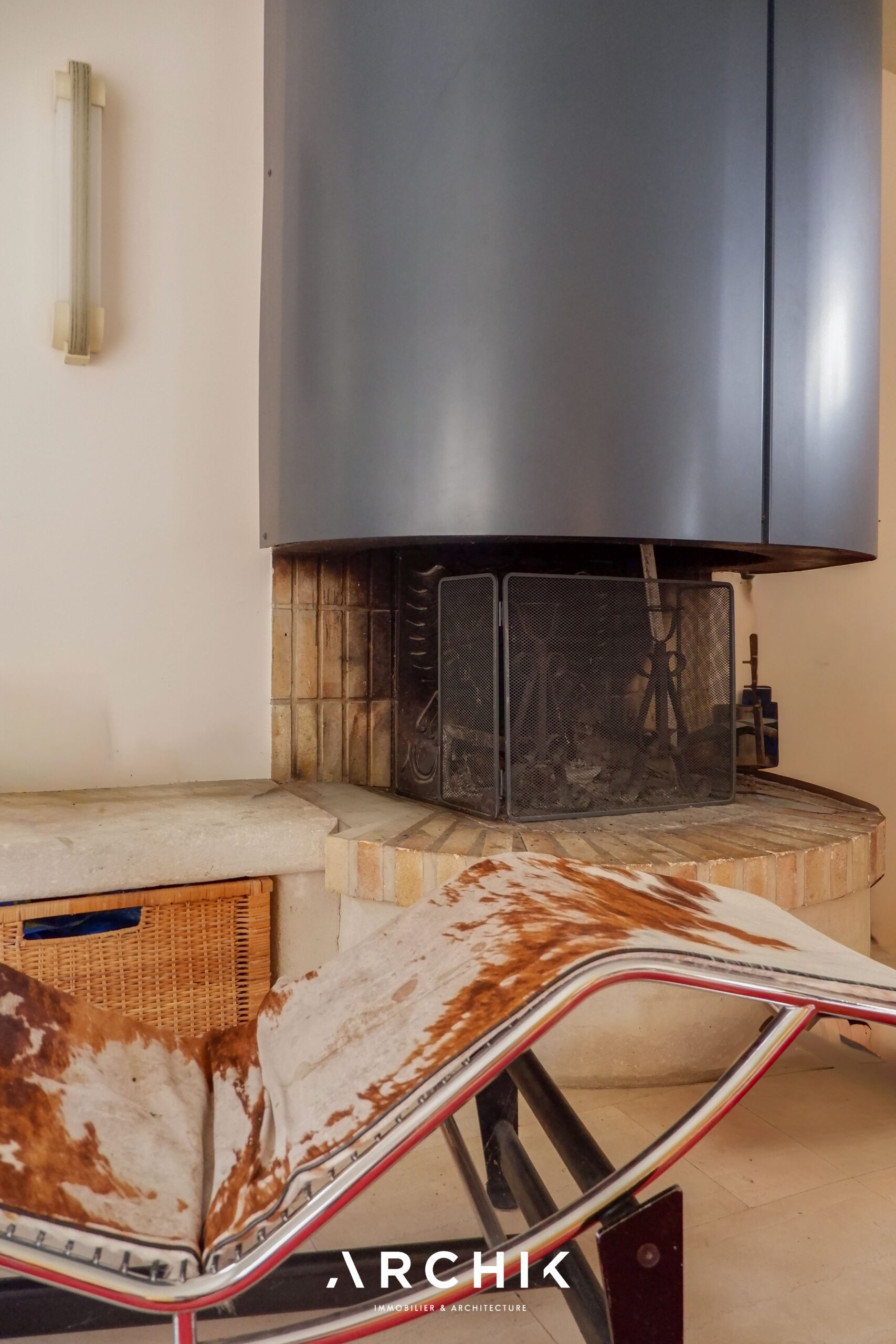 Designed by the Souverain architectural firm, it bears the hallmarks of the 1970s: the house doesn't impose itself, it anchors itself. It adopts low lines, plays of volumes, and that particular way of opening up the view to the landscape, a clear legacy of Frank Lloyd Wright. The three levels of the building nestle into the slope, like natural terraces. Each space finds its perfect orientation: to the east, the gentle warmth of the morning; to the south, the brilliance of daylight filtering through the forest edge; to the north, a panoramic view of the valley. Terraces, balconies, and a majestic rooftop extend this seamless connection with the outdoors. Nature permeates every corner, and light flows freely throughout. At the heart of the main level, the light-filled living room is defined by a custom-designed anthracite metal fireplace. The materials speak an organic language: travertine flooring, a lacquered ceiling, ivory walls, and white lacquered aluminum on all the woodwork. This level also houses a Bulthaup kitchen equipped with Gaggenau appliances and an office, creating a fluid whole where each space continues the dialogue with the landscape. In total, five bedrooms, complemented by three shower rooms and a bathroom, all bathed in light and finished with oak parquet flooring, comprise the sleeping quarters, offering a balance between the coolness of the garden level and views of nature from the upper floors. At the very top, the rooftop becomes a belvedere. The valley unfolds in all its depth, with the garden in the foreground. The garden surrounds the house and seems to protect it. A little further into the garden, hidden from view, a separate 48 m2 cottage, built in 1998, appears to watch over the property. With its own entrance and potential for a 60 m2 extension, it offers great promise: an artist's workshop, a studio, a place to welcome guests, share knowledge, create anything is possible. A two-car garage completes the property.
