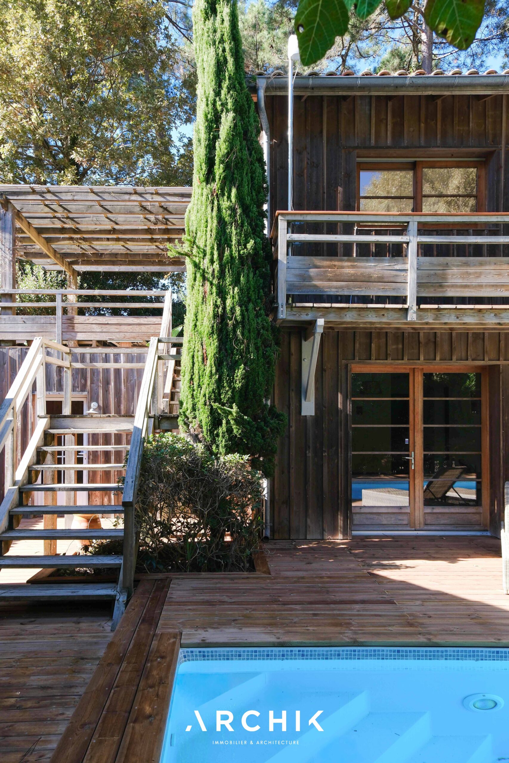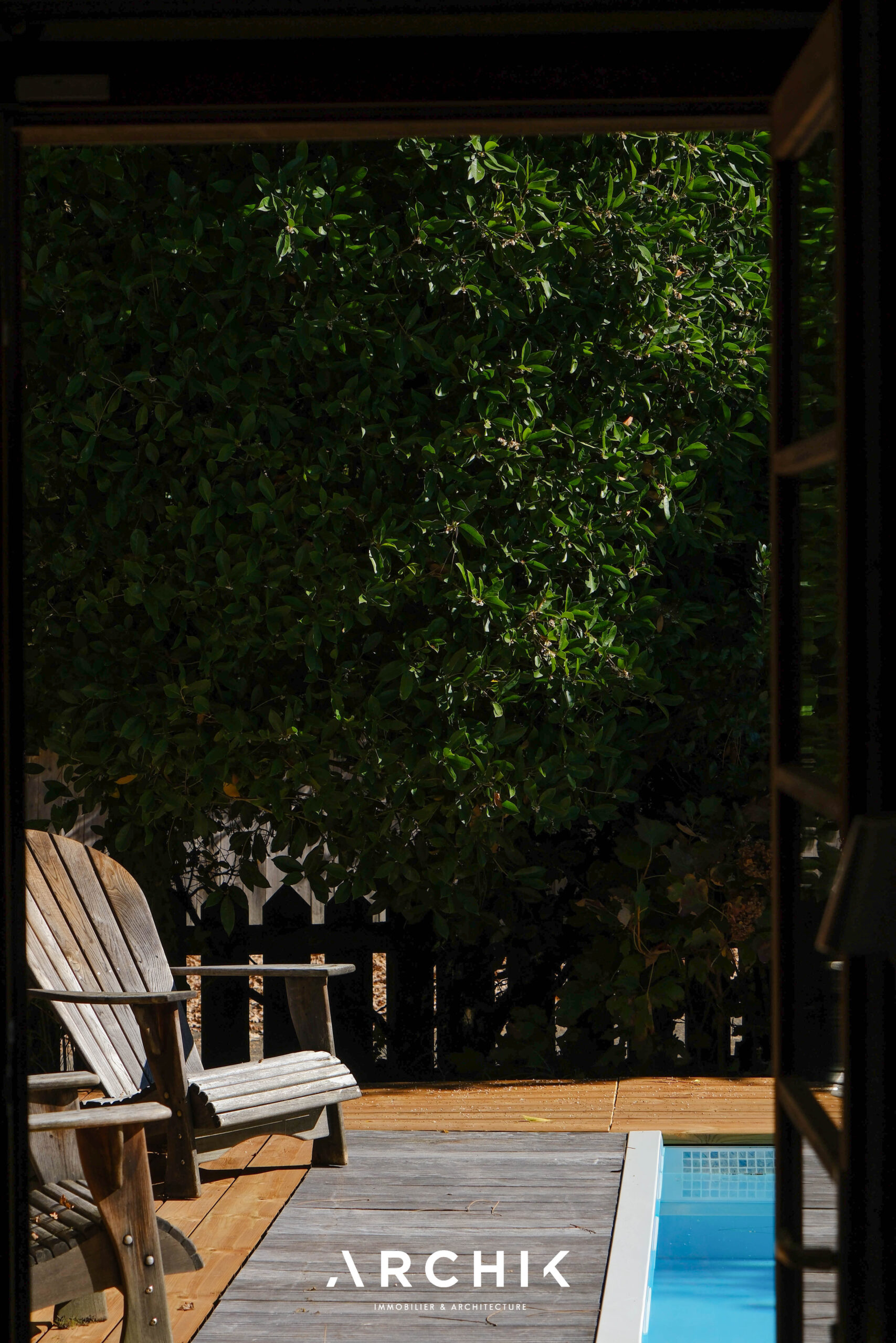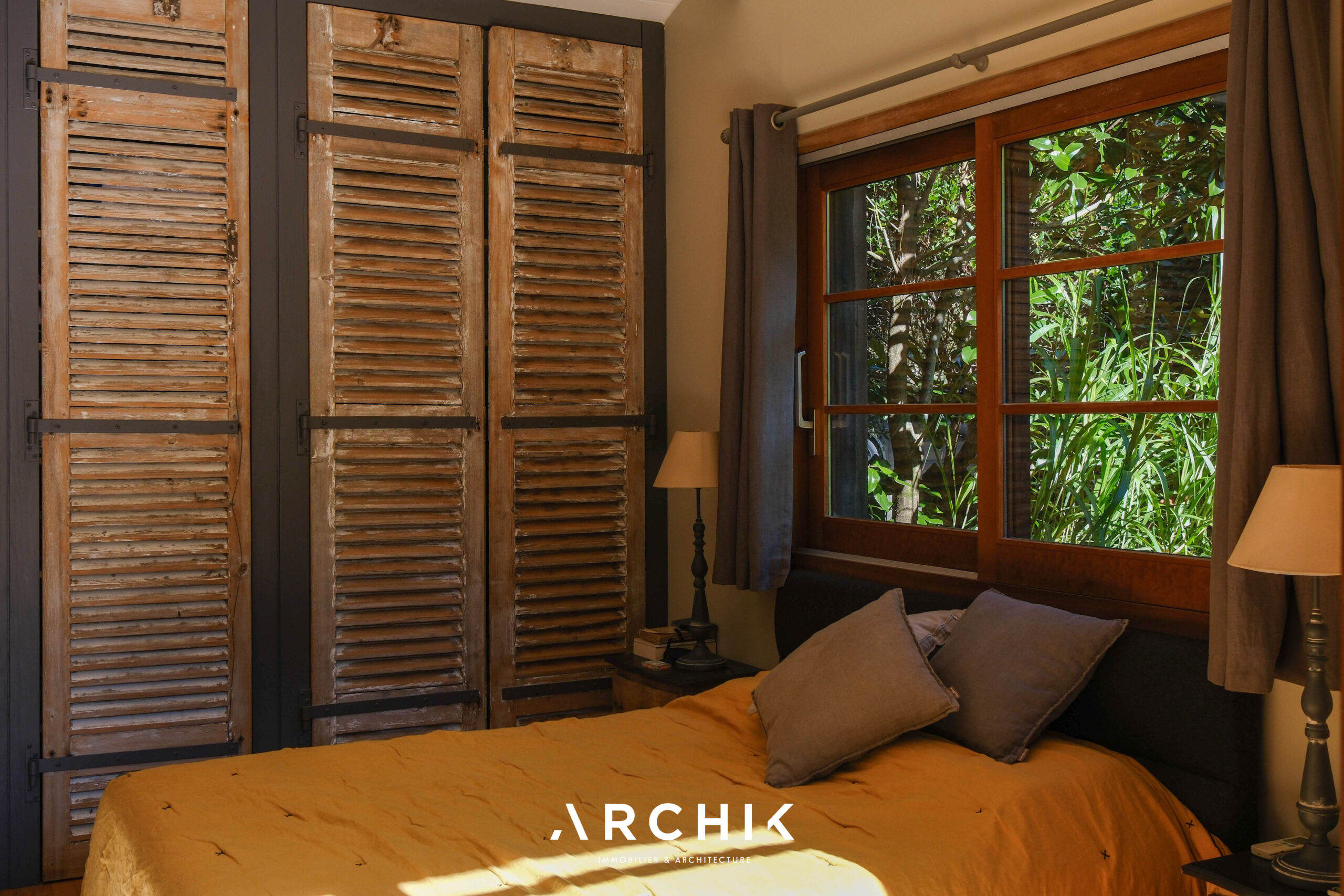 Built in 2012, it blends seamlessly into the wooded and natural surroundings of this protected area. Arranged over two levels, the house features an inverted floor plan in which a vast, high-ceilinged living room occupies the entire space and opens onto a shaded terrace. On the garden level, the four bedrooms, including two suites, overlook the heated swimming pool. The annex, attached to the house, provides a true guest house with two bedrooms, a bathroom, a living room, and a kitchen. Attractive wooden terraces surround the various living areas and the pool. The local vegetation and the wood of the terraces and cladding lend the property its unique charm. A laundry room, an outdoor shower, and a small garage complete the property.