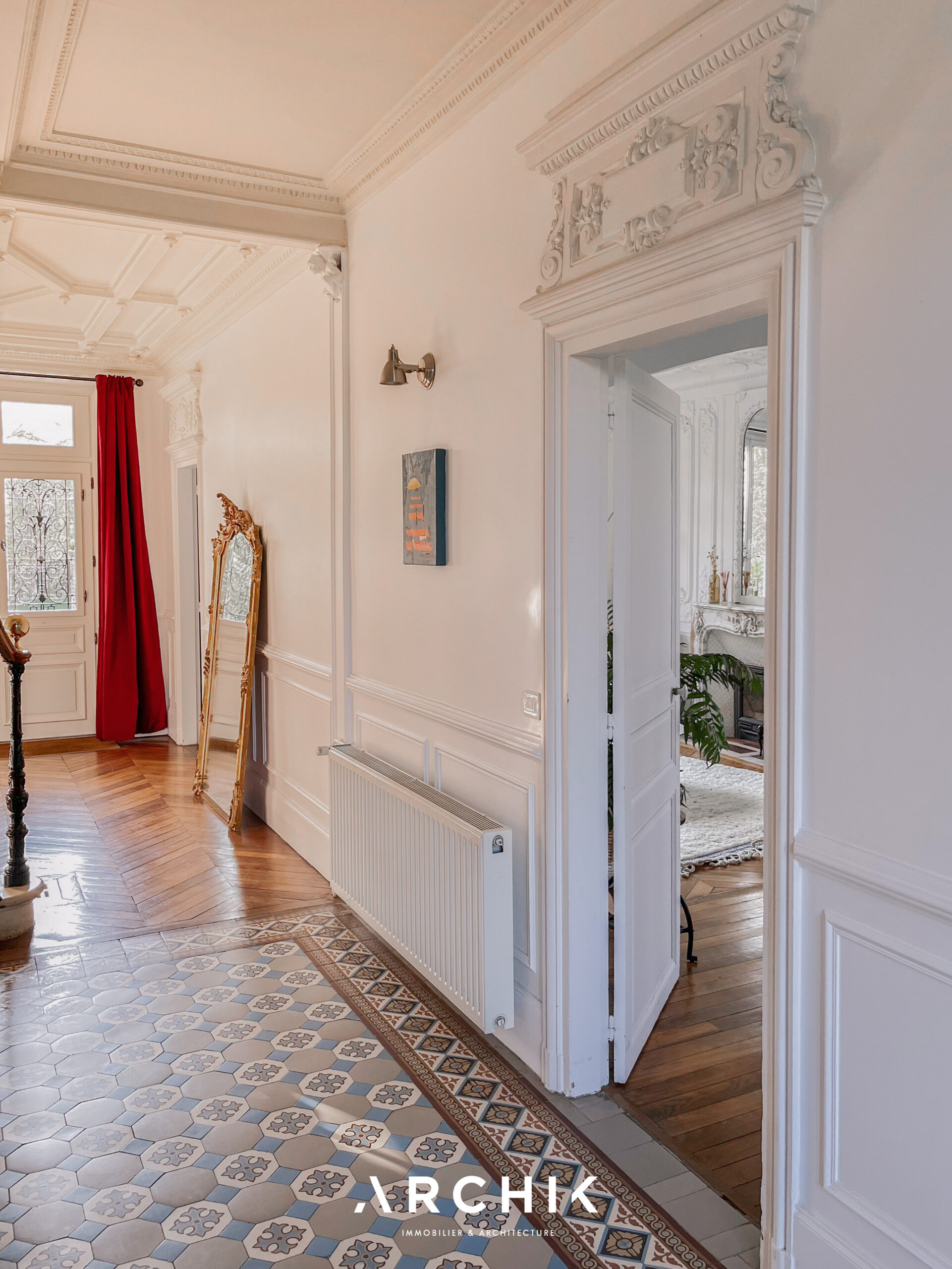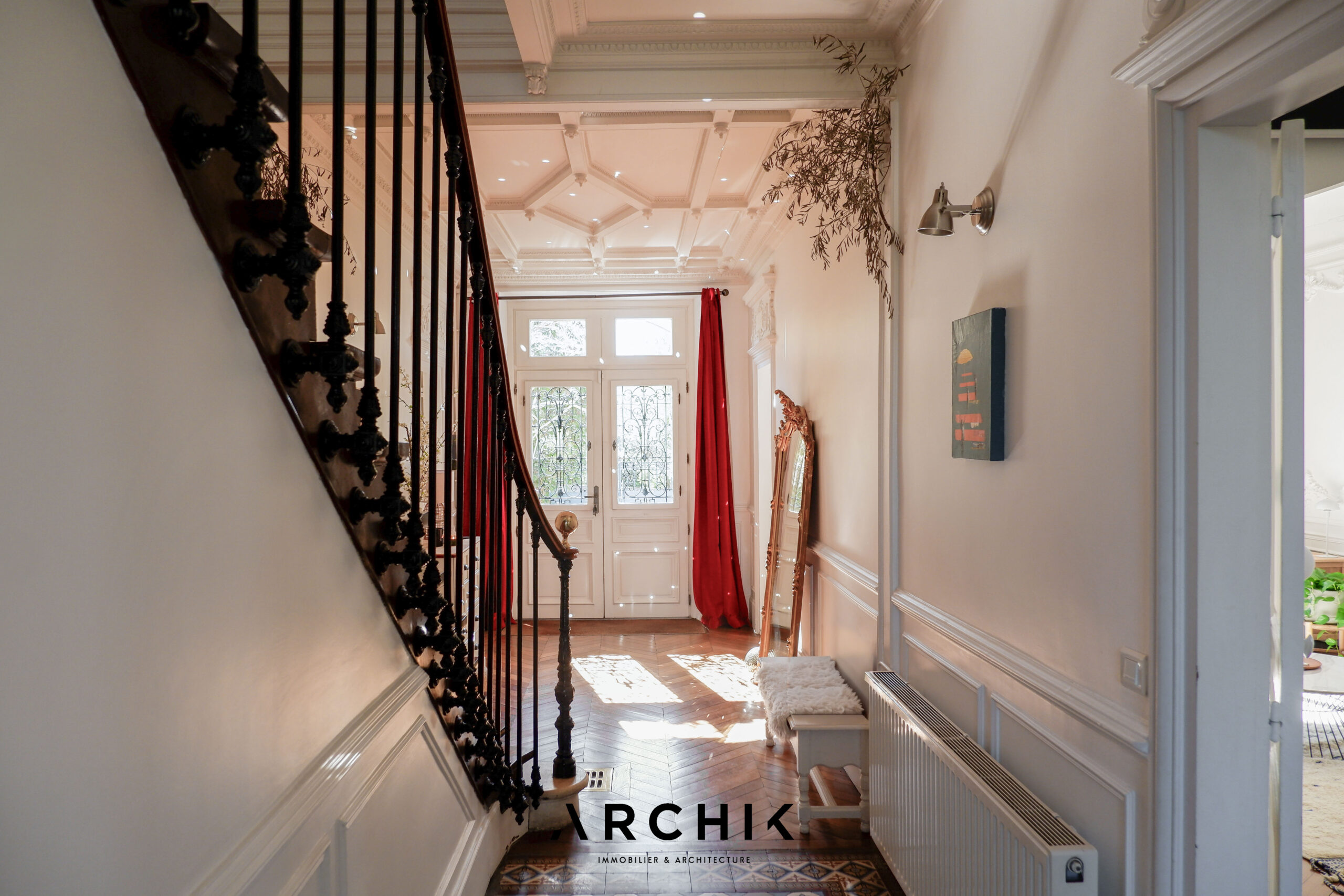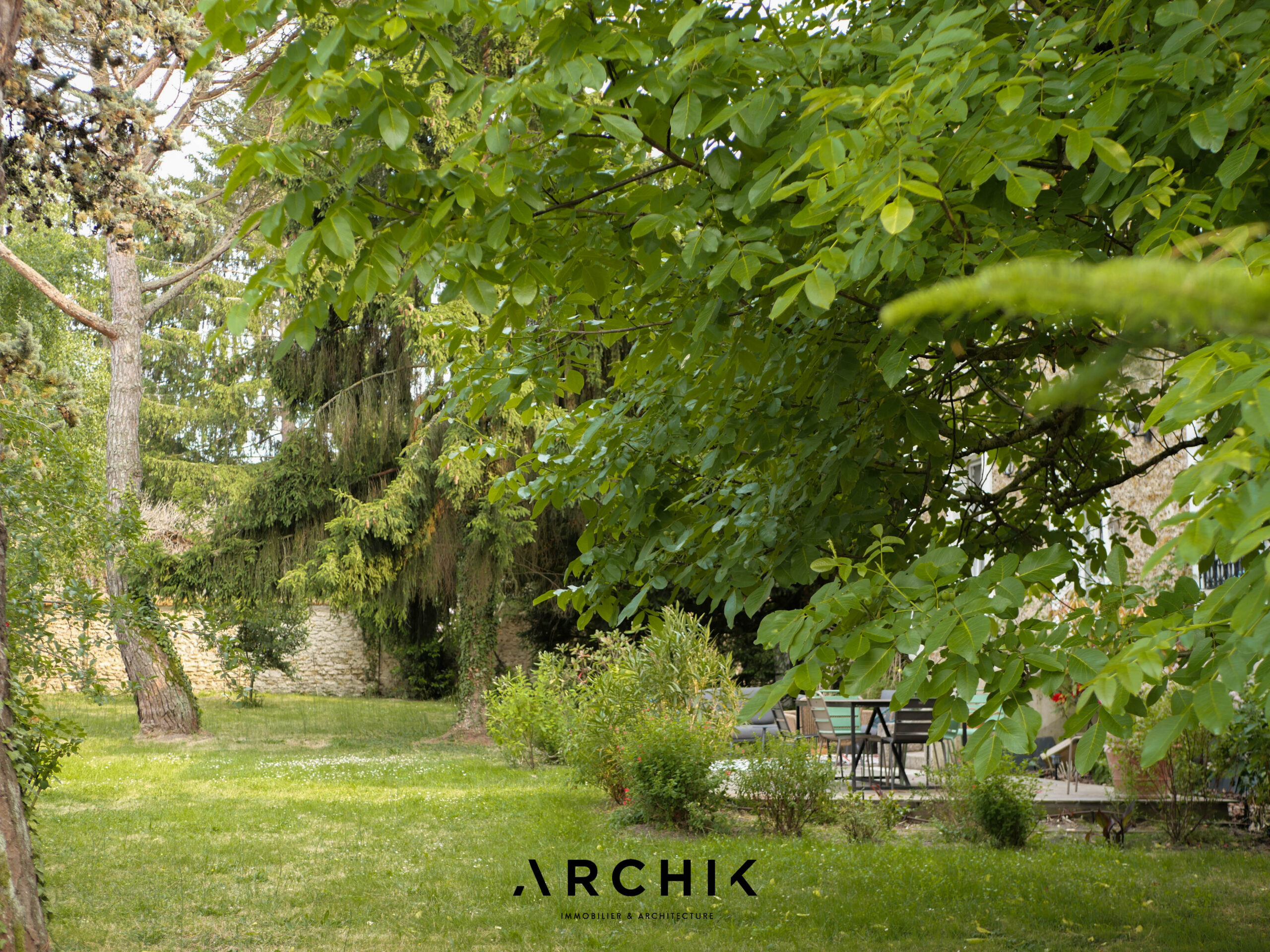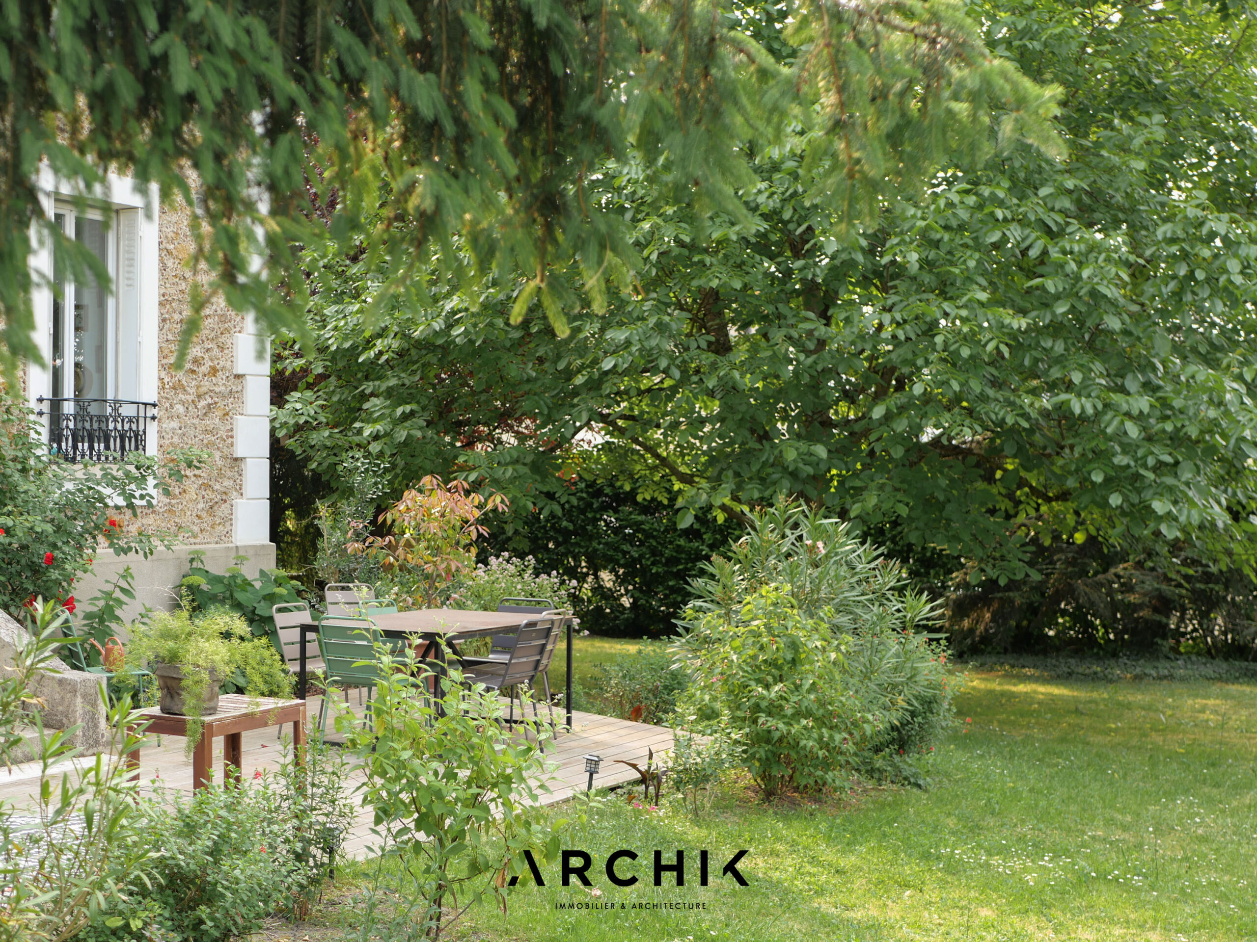 The house has been meticulously restored by an interior designer, respecting its architectural identity while incorporating modern comforts. Its family home atmosphere has been subtly preserved. Behind the perfectly symmetrical facade, the property opens onto a wooded garden, a spacious, secluded terrace, and majestic century-old trees, creating a haven of greenery and serenity in the heart of the town. Upon entering, a large, light-filled reception room reveals an original antique wooden and wrought-iron staircase, enhanced by stunning cement tiles. The heritage features have been meticulously preserved: herringbone parquet flooring, moldings, woodwork, ceiling roses, coffered ceilings, marble fireplaces, and high ceilings lend the property a timeless elegance. The garden level comprises two harmoniously proportioned living spaces: a bright reception room and dining room, as well as a family kitchen and an adjoining laundry room, creating a functional whole. The first floor houses the sleeping area, with two bedrooms and a bathroom on one side, and a small independent apartment on the other, including a kitchenette, bedroom, and sitting room, ideal for entertaining or working. On the top floor, beneath a sloping ceiling and exposed beams, unfolds a comfortable master suite with a bathroom, a private sitting room, and two separate offices, offering an entire floor dedicated to family life. Finally, the basement, perfectly divided into several spaces, reveals a cellar with a vaulted ceiling covered in herringbone brickwork. A courtyard provides parking for several vehicles.