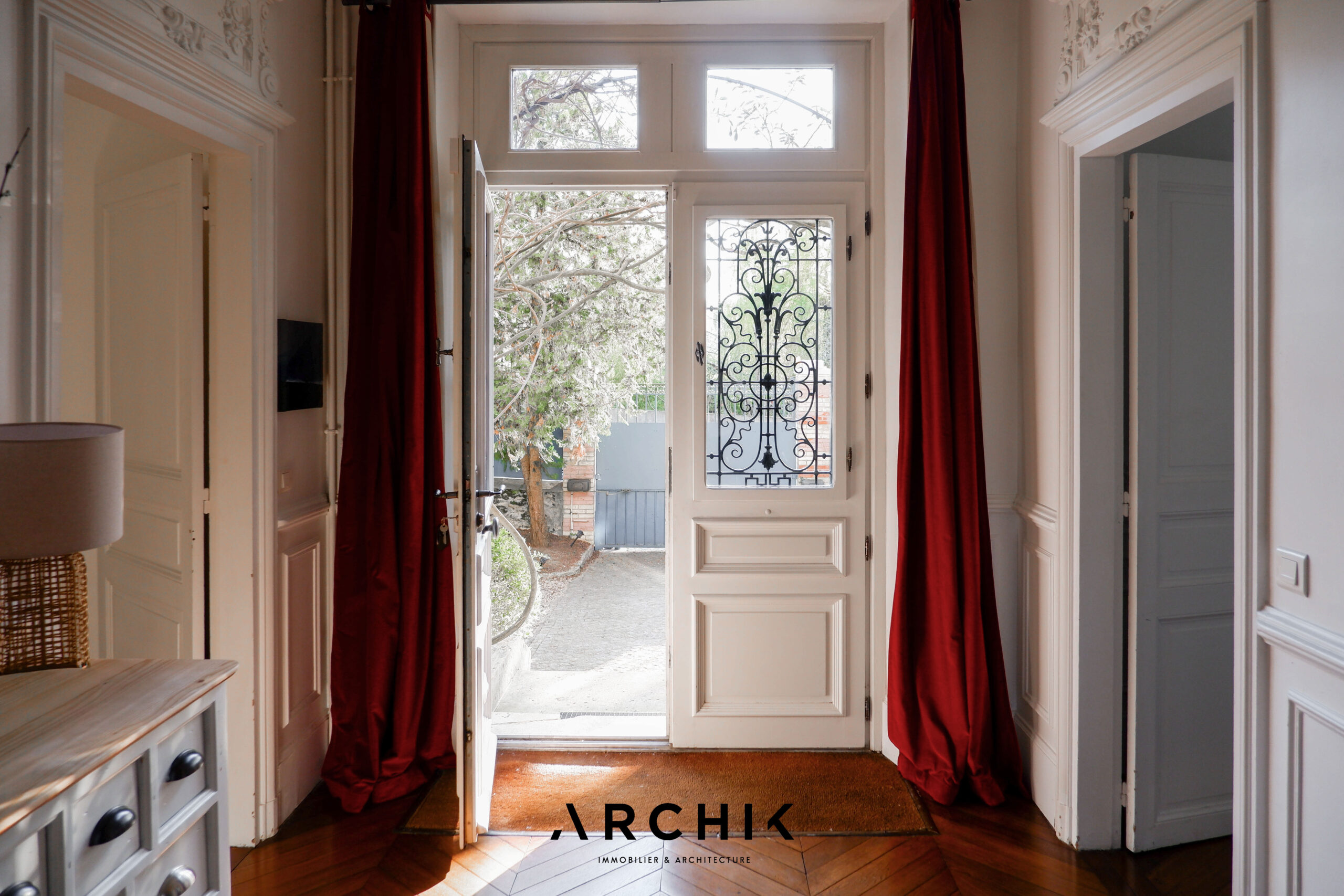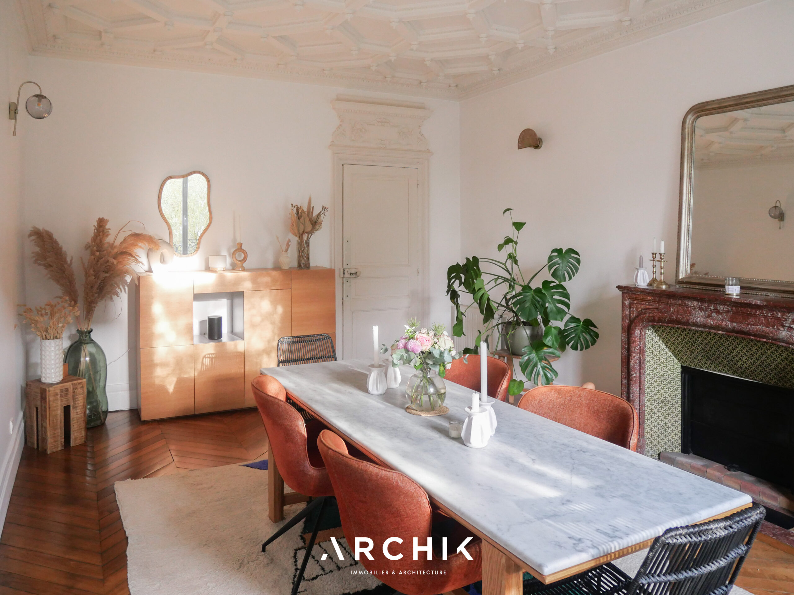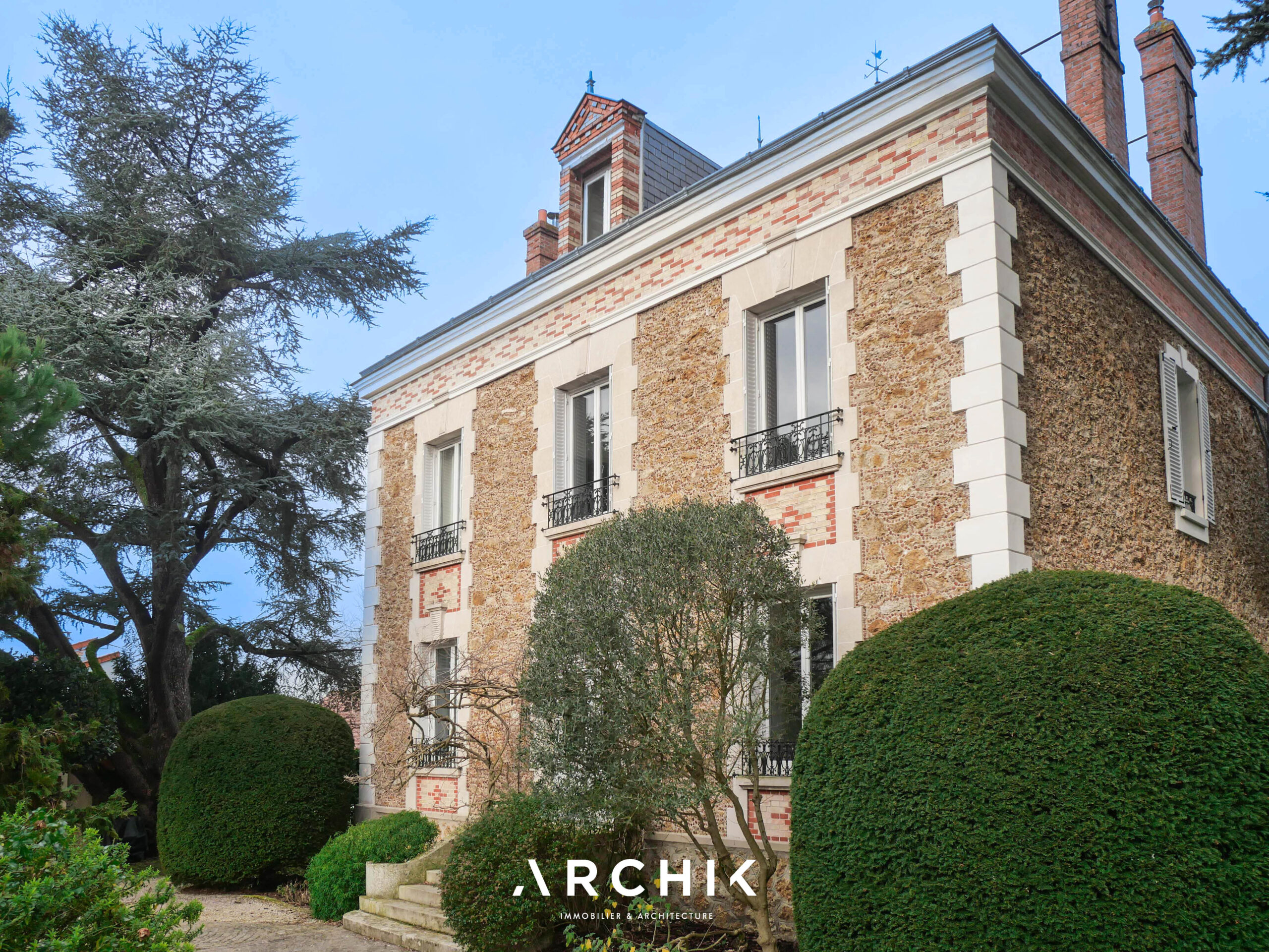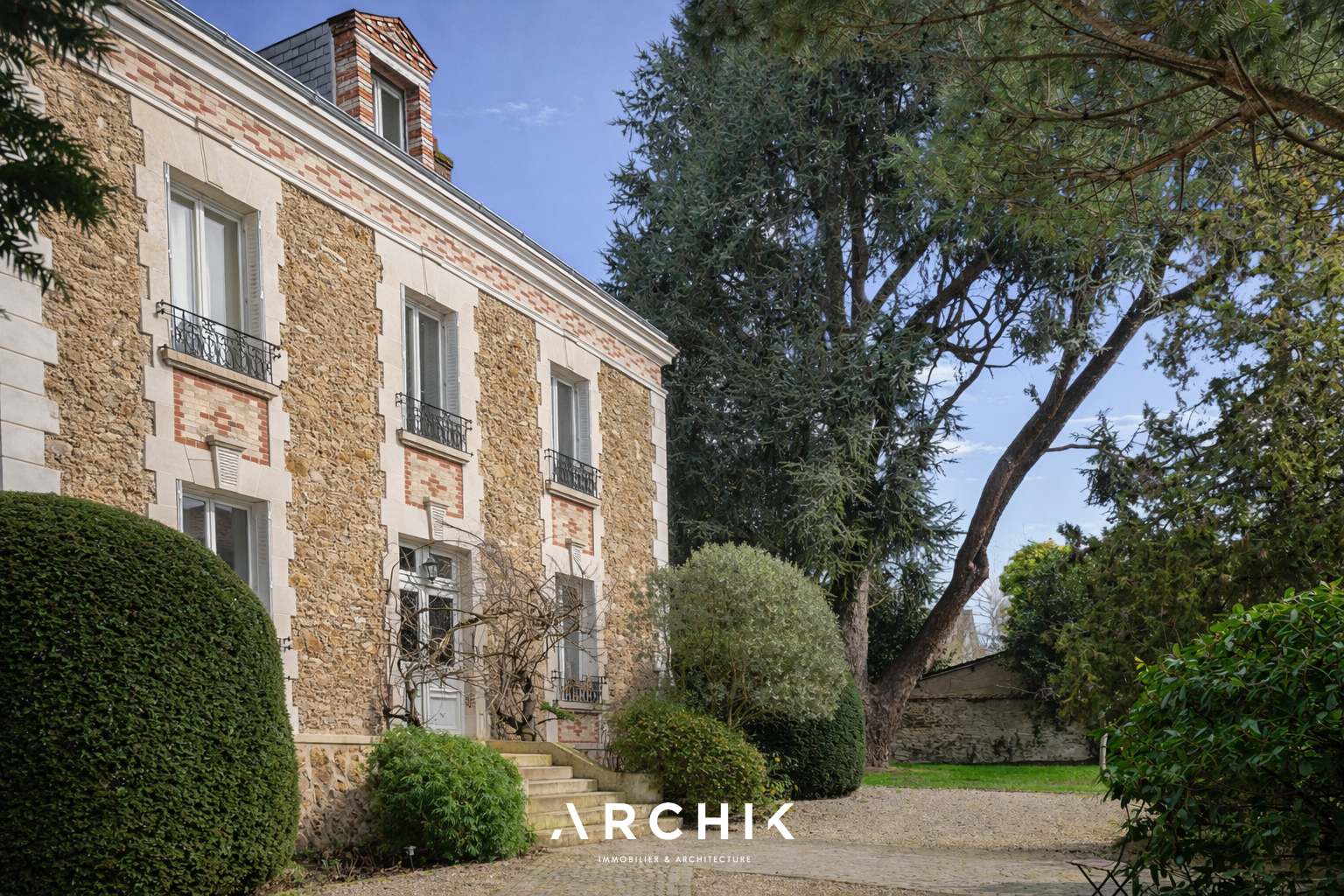 The house has been meticulously restored by an interior designer, respecting its architectural identity while incorporating modern comforts. Its family home atmosphere has been subtly preserved. Behind the perfectly symmetrical facade, the property opens onto a wooded garden, a spacious, secluded terrace, and majestic century-old trees, creating a haven of greenery and serenity in the heart of the town. Upon entering, a large, light-filled reception room reveals an original antique wooden and wrought-iron staircase, enhanced by stunning cement tiles. The heritage features have been meticulously preserved: herringbone parquet flooring, moldings, woodwork, ceiling roses, coffered ceilings, marble fireplaces, and high ceilings lend the property a timeless elegance. The garden level comprises two harmoniously proportioned living spaces: a bright reception room and dining room, as well as a family kitchen and an adjoining laundry room, creating a functional whole. The first floor houses the sleeping area, with two bedrooms and a bathroom on one side, and a small independent apartment on the other, including a kitchenette, bedroom, and sitting room, ideal for entertaining or working. On the top floor, beneath a sloping ceiling and exposed beams, unfolds a comfortable master suite with a bathroom, a private sitting room, and two separate offices, offering an entire floor dedicated to family life. Finally, the basement, perfectly divided into several spaces, reveals a cellar with a vaulted ceiling covered in herringbone brickwork. A courtyard provides parking for several vehicles.