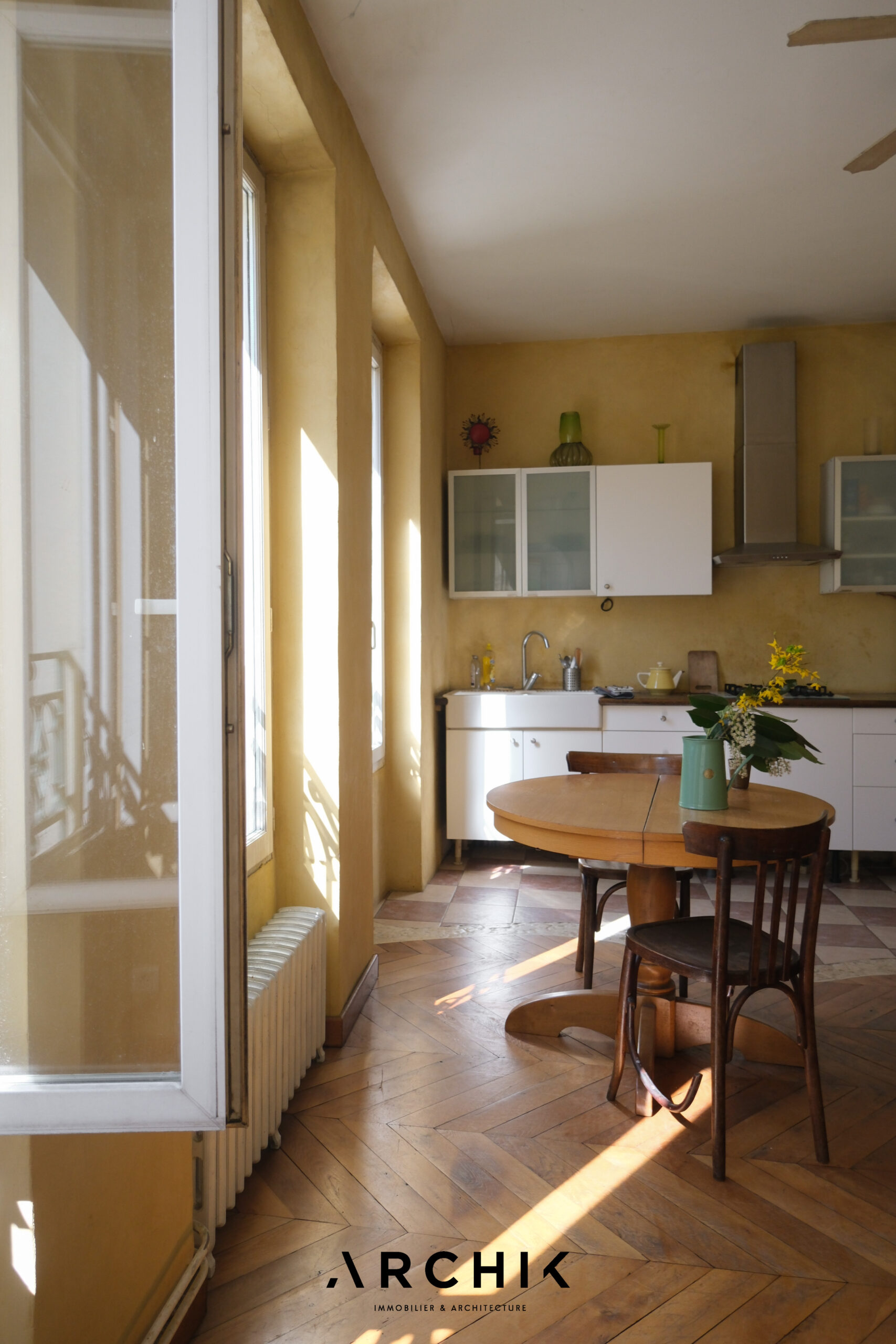 Refurbished by a cabinetmaker, the house is distinguished by its exceptionally meticulous woodwork and bespoke fittings. Combined with mosaic floors, these elements create a warm and handcrafted feel, where every detail contributes to the atmosphere. Facing east and west, the house benefits from a constantly changing natural light that illuminates the spaces throughout the day, highlighting textures, volumes, and perspectives. The ground floor features a spacious living room centered around a wood-burning stove. Extending from this, the open-plan kitchen connects seamlessly with the garden, creating a fluid transition between indoors and outdoors. An adjoining, light-filled workshop extends this space, offering a creative outlet directly connected to nature. A striking staircase leads to the first floor, where a second kitchen and two bedrooms create a more intimate atmosphere. A bathroom is also located on this floor. A 25 m2 suspended terrace, sheltered from view, unfolds like a space balanced between sky and nature. The top floor is entirely dedicated to the sleeping area, with three additional bedrooms and a second bathroom. A 65 m2 basement and a 25 m2 garage complete this property.