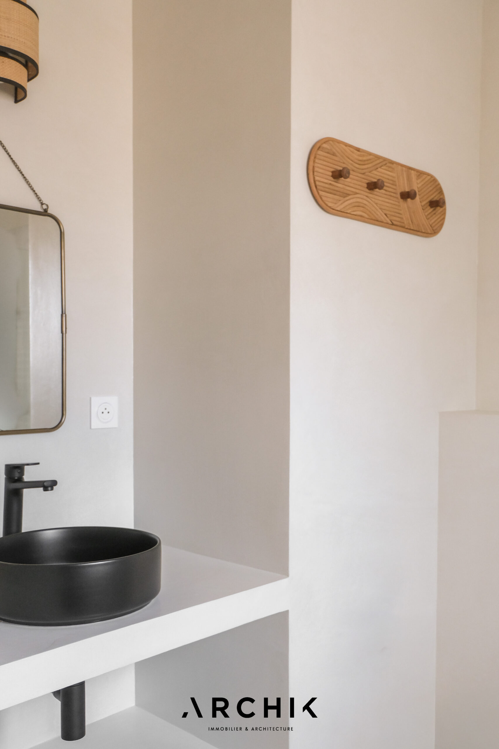 Decorated by renowned interior designer Philippe Puron, the house reveals a unique, bohemian and refined style. Designed as a turnkey living space, it is fully fitted and furnished, and spread over two levels with generous volumes. Here, every room, every object, and every material has been carefully chosen for this space, in a bohemian chic spirit that is warm, elegant, and timeless. On the ground floor, the living space is organized around a living room, a dining room, and an open kitchen, extended by a bathroom and a laundry area. The large cement gray tiles, combined with light tones, are subtly highlighted by black door and window frames, affirming a contemporary style. Two large bay windows offer direct access to the garden and create a permanent dialogue between the interior and exterior. The kitchen, the true centerpiece of the home, plays on the contrasts between sleek white cabinetry, warm wood, and deep marbled black. Upstairs, four bedrooms make up the sleeping area, including a master suite with a bathroom featuring terrazzo-style tiles and a built-in vanity. Each room has custom storage and its own unique atmosphere, combining chic, character, and comfort. A second bathroom, tiled in various shades of gray, is enhanced by a retro-style wooden vanity unit. Outside, a terrace naturally extends the living spaces and opens onto a landscaped garden, designed as a green oasis conducive to relaxation. Four parking spaces complete this rare property.