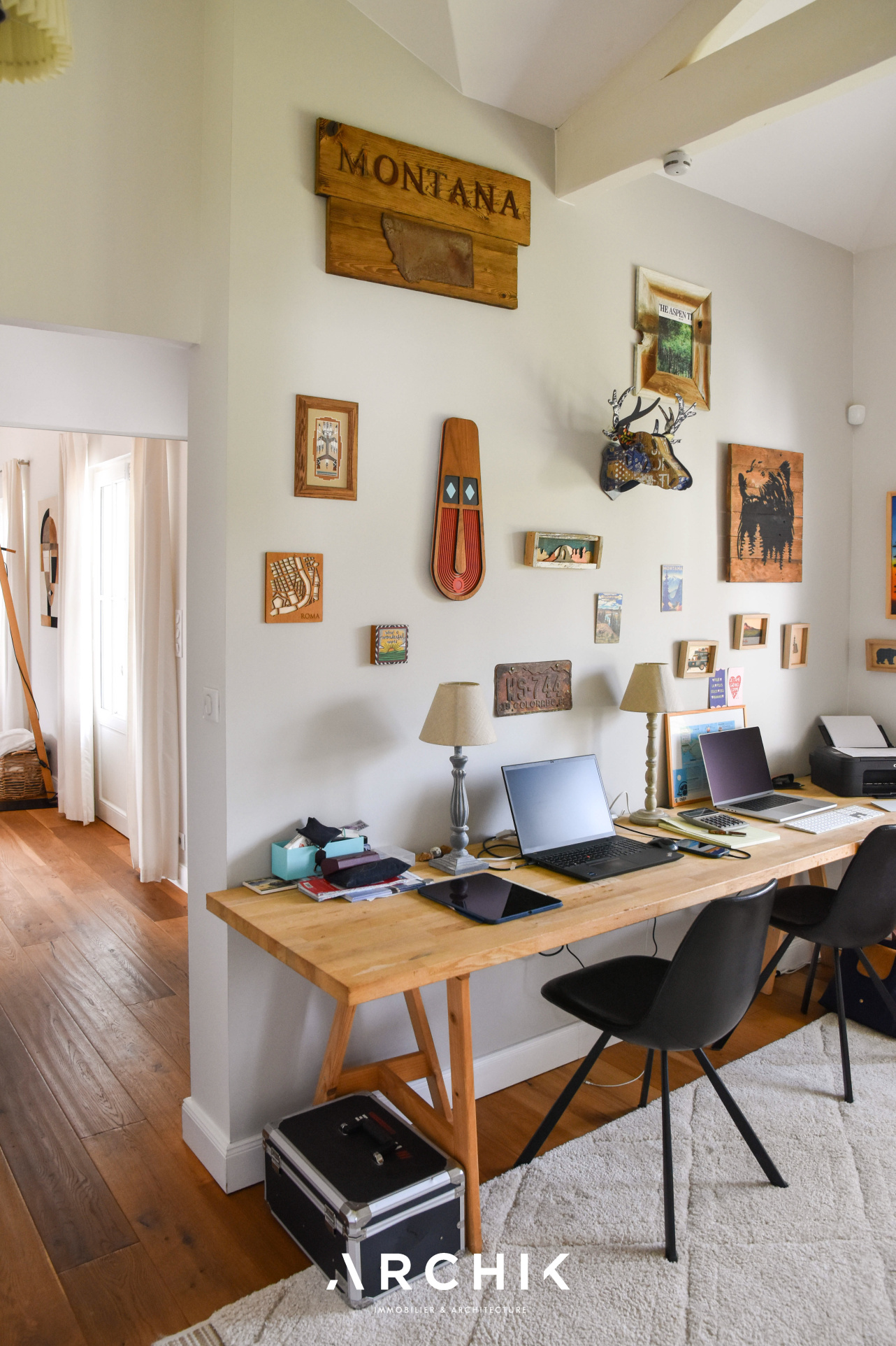On the ground floor, a proper entrance hall leads to a vast living space in neutral tones, warmed by solid oak parquet flooring. Beneath the cathedral ceiling, the various functions flow seamlessly into a single volume: the living room is centered around a contemporary fireplace, the dining area benefits from a glazed corner framing the treetops, while the fully equipped, white-clad kitchen and pantry are arranged around a welcoming solid wood island. Beyond this, a terrace with glass railings overlooks the swimming pool and extends the view to the surrounding landscape.