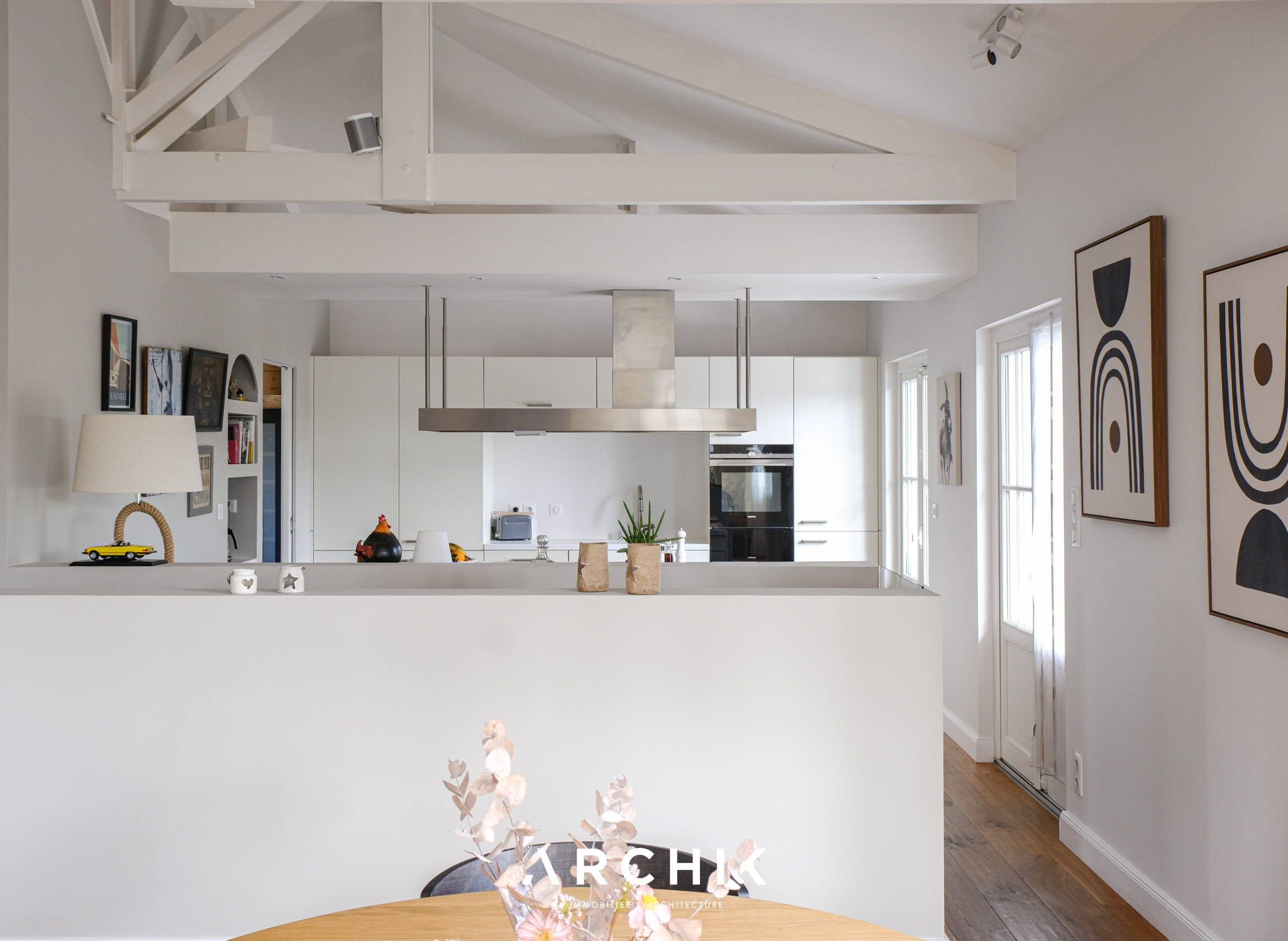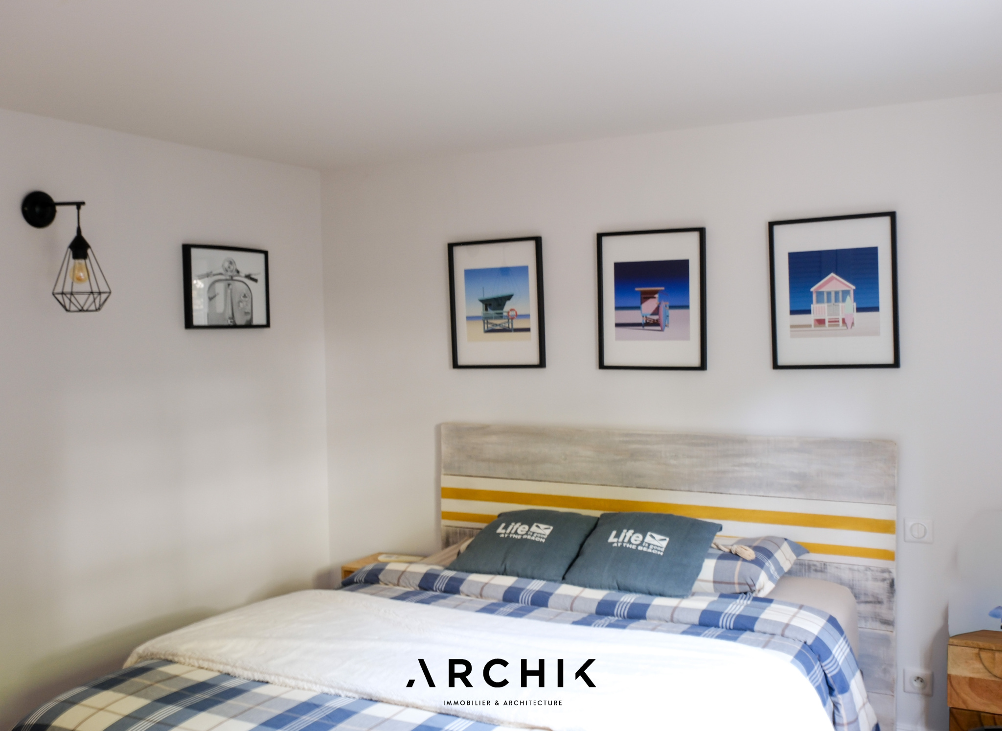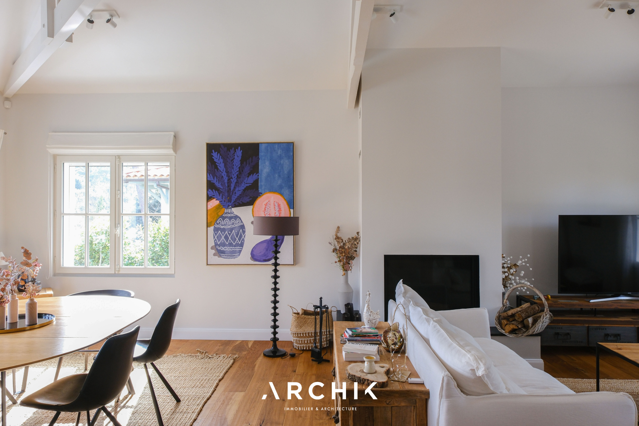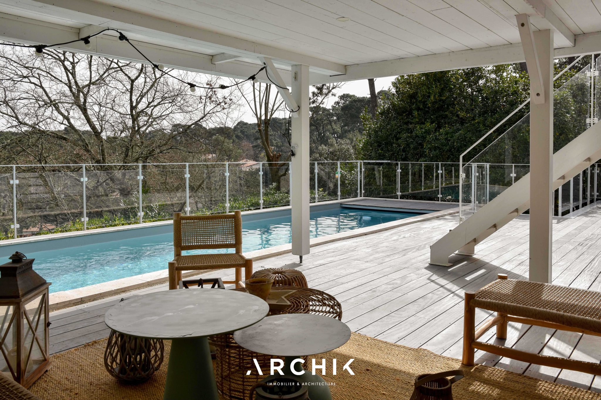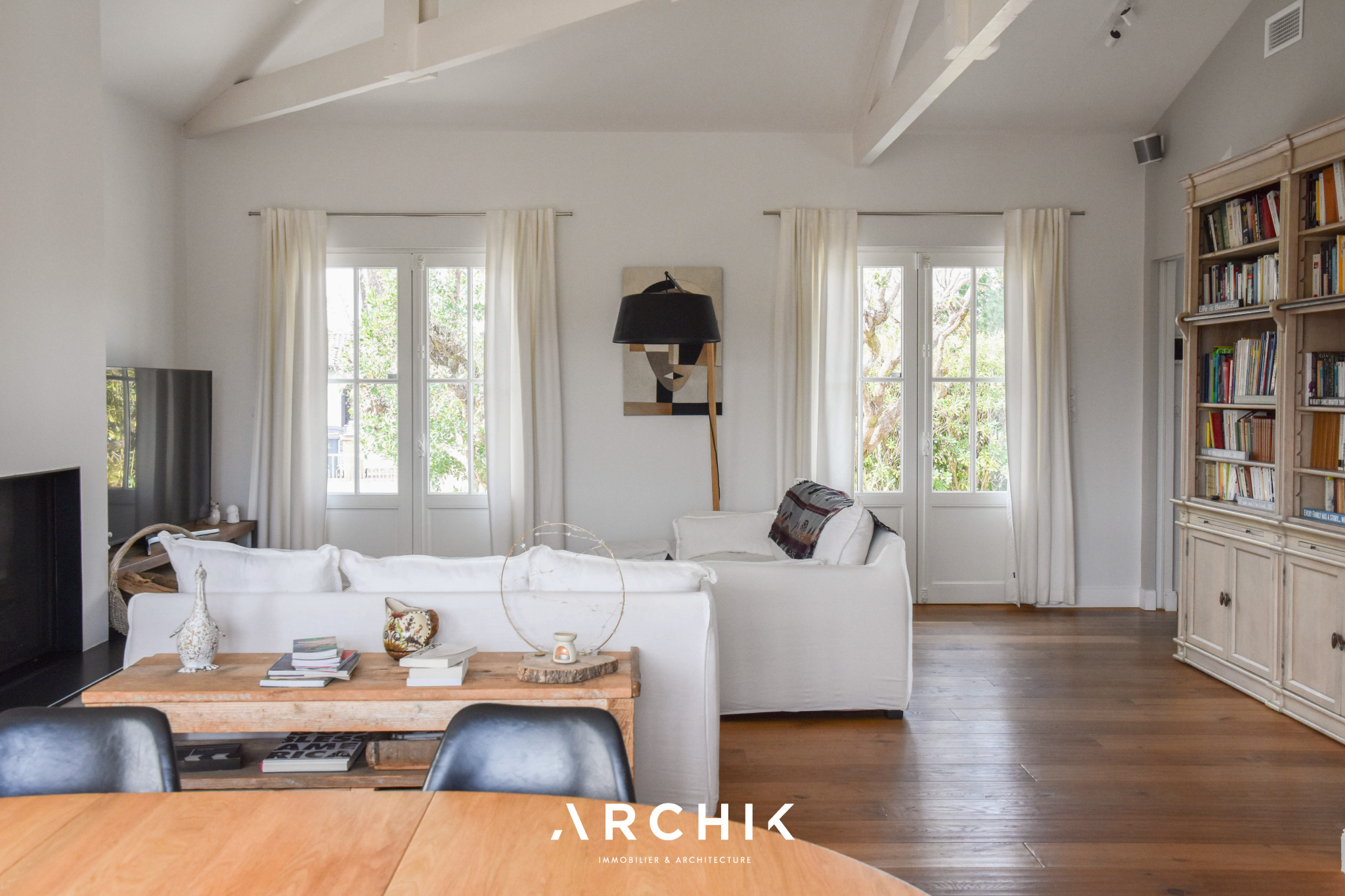 Renovated in 2015 by the Bordeaux-based architecture firm Goldfinger, the house features an inverted floor plan organized over two levels, following the natural slope of the land. This configuration allows for full enjoyment of natural light and open views of the forest.