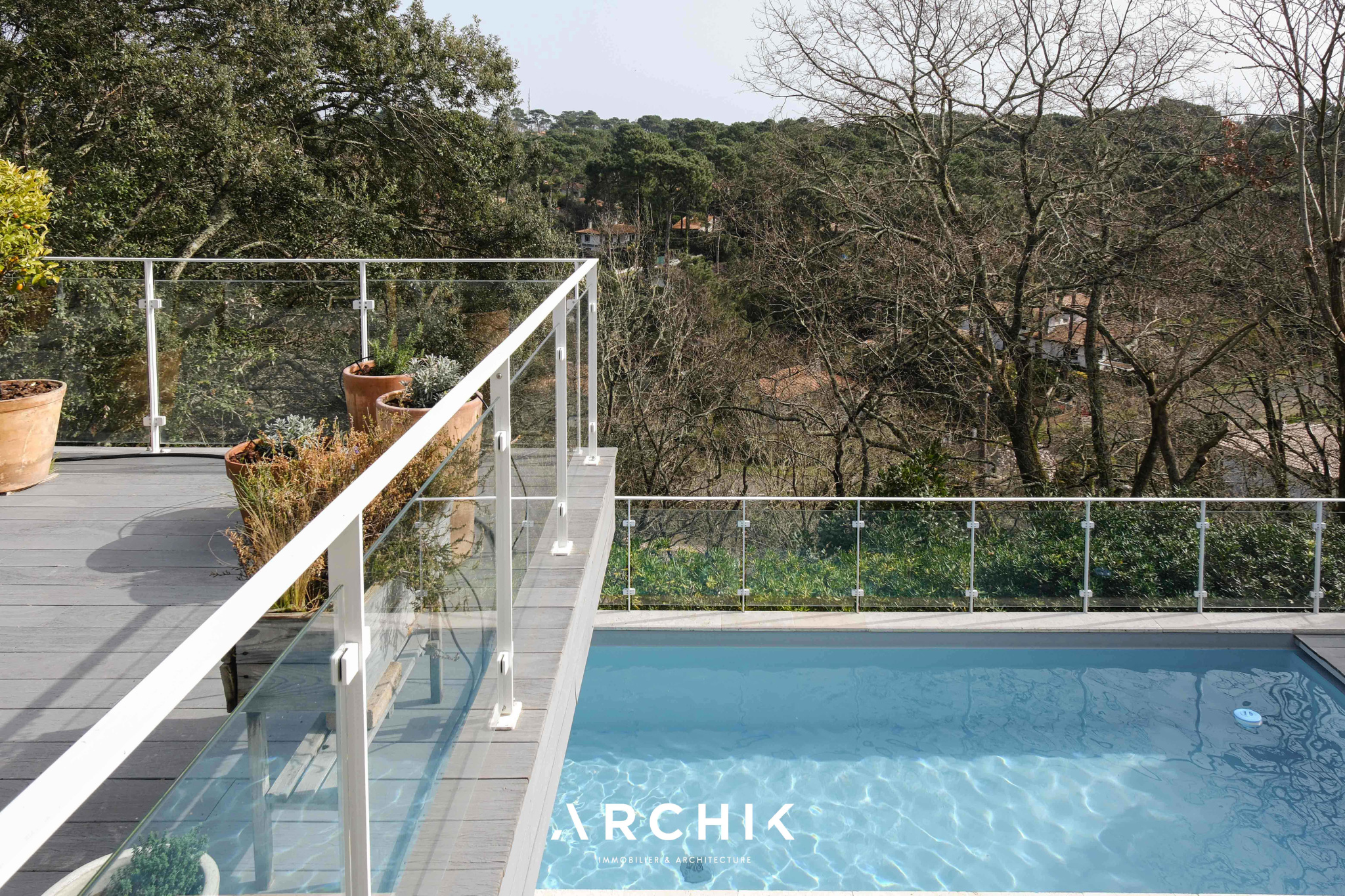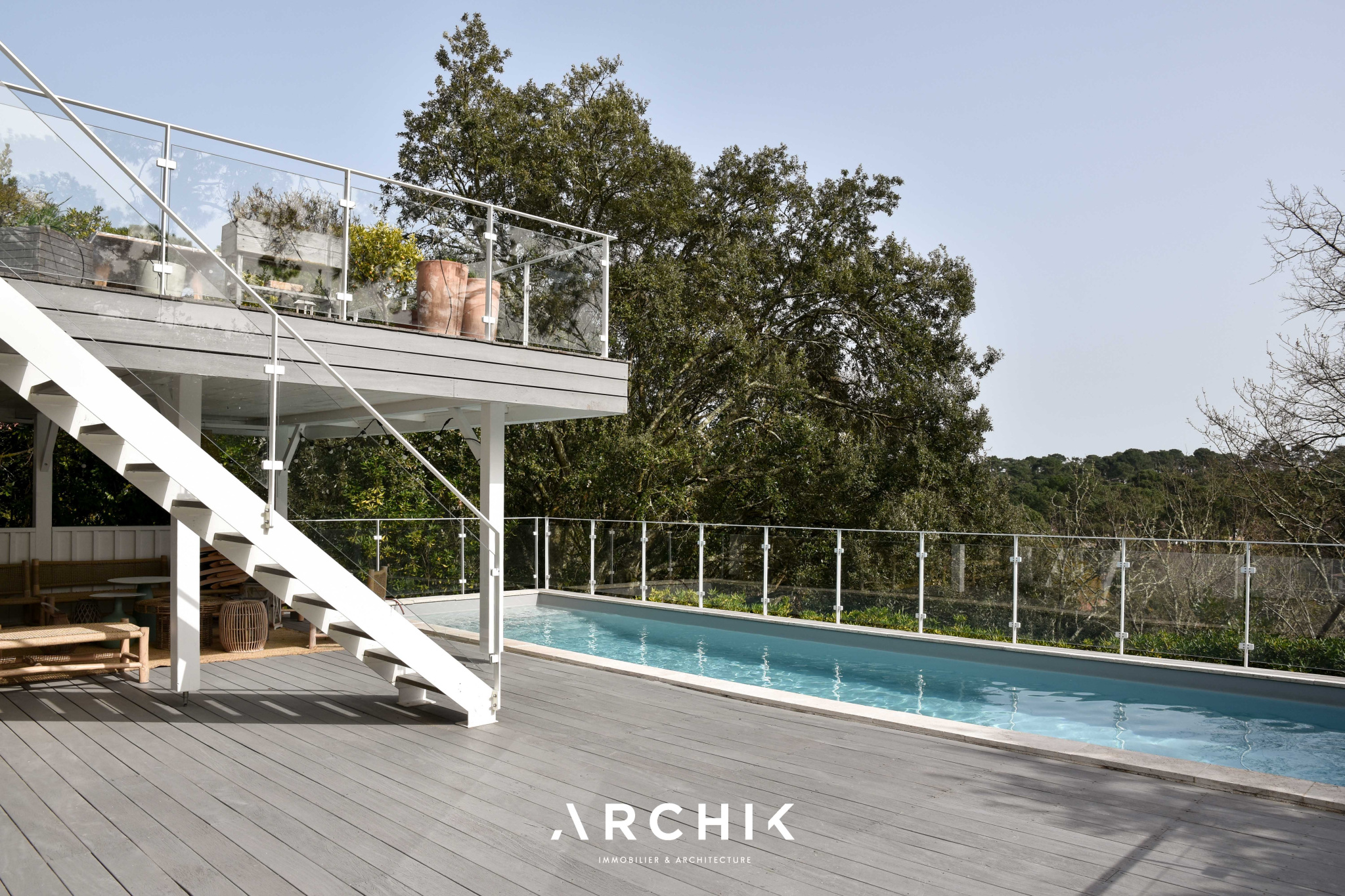 Partially sheltered, it becomes a true outdoor living space, ideal for enjoying the shade by the pool which seems suspended in the landscape.