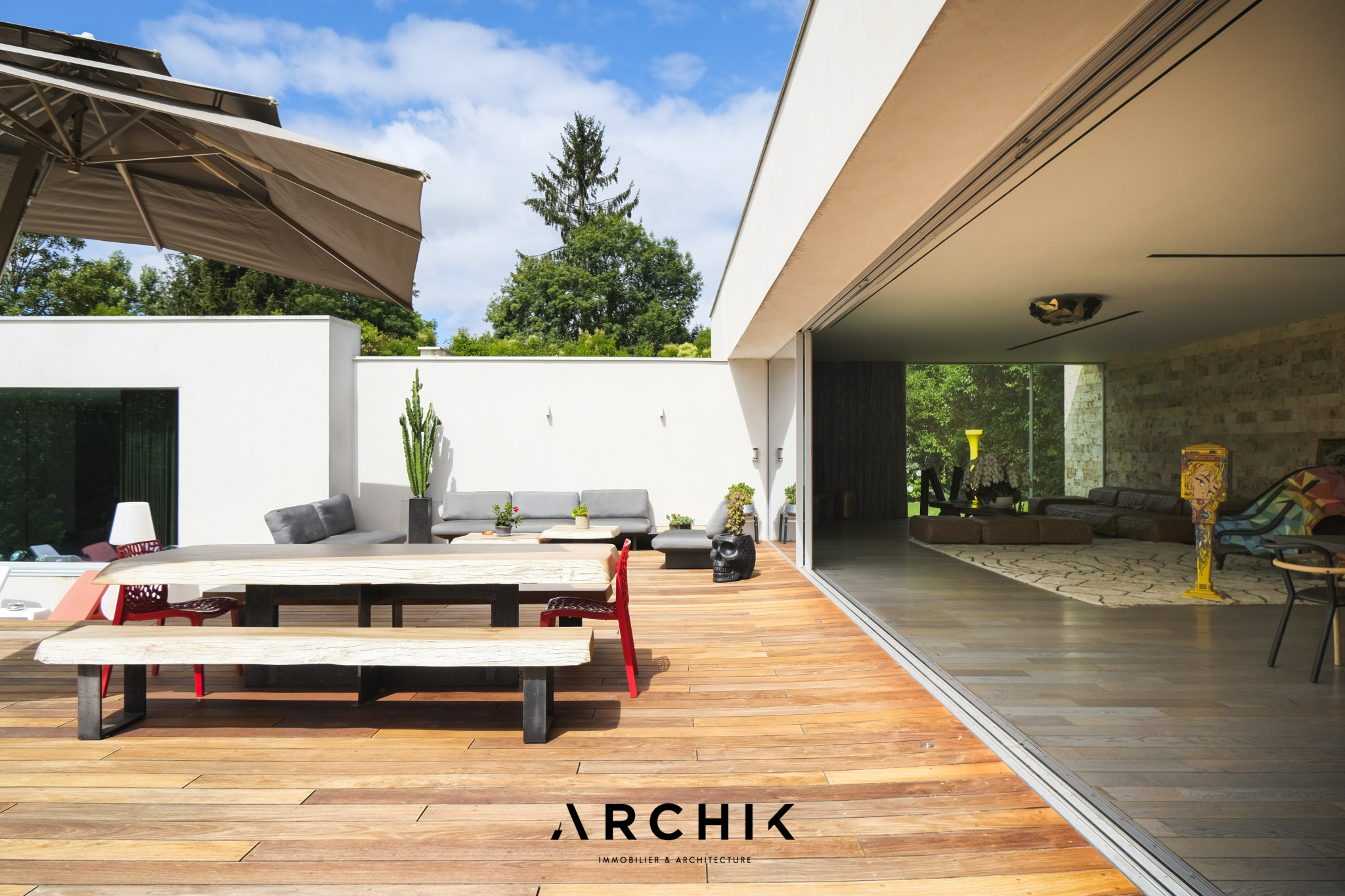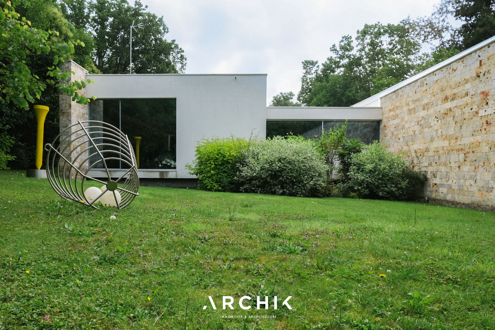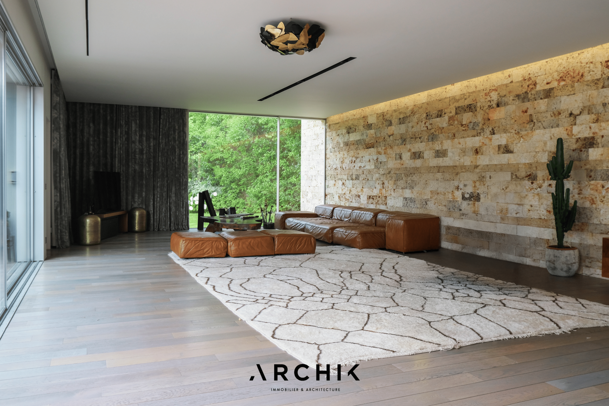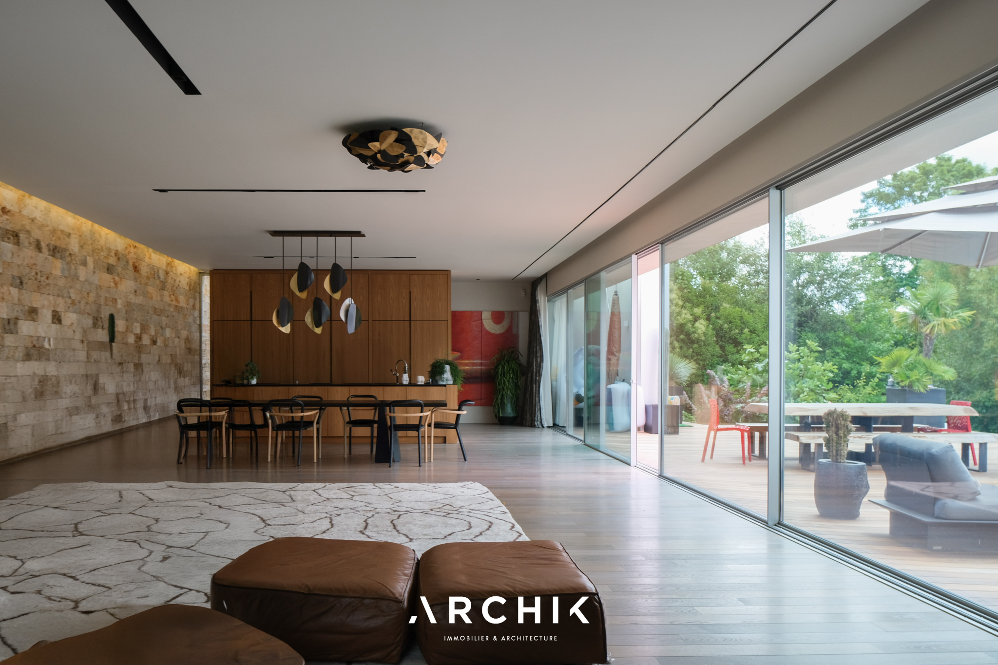 Built in 2013, the architecture of the villa combines tradition and modernity with clear lines and raw materials, such as reworked millstone, cut from the block to form a seamless facing. It becomes the signature of the place by lining the wall of its living room and creating a common thread with the exterior facade. From the entrance, the oriental inspiration and artisanal know-how are felt with a majestic door made by the Coubertin foundry. The spirit of the place, both refined and warm, is manifested in a living room of 110 m2, facing South and covered with raw oak parquet flooring, including a kitchen clad in wood and a wooden worktop. black granite from Zimbabwe. The volume opens with a monumental custom-designed bay window running along the entire room and at full height. Its horizontal aluminum alloy structure with an invisible threshold creates a space of light and freedom, blurring the architectural barrier between interior and exterior. Outside, the 80 m2 wooden terrace and its heated infinity pool offer a clear view of a landscaped green setting and a river at the back of the property. The night area has three large suites with marble bathrooms or tadelakt shower rooms, according to Moroccan tradition. Ochres, earth colors, wood and stone live in perfect harmony, offering numerous storage spaces, dressing rooms and corridors with graphic lines. Walls covered in matte black rubber lacquer contrast with the white and the light, creating new perspectives on the vegetal and intimate exterior. On the garden level, two additional bedrooms with private shower rooms recall the earthy color and authenticity of the place. A laundry area, a gym and a home cinema complete this level. An independent 30 m2 studio with integrated kitchenette that can be converted into a work space as well as a 30 m2 garage and six parking spaces complete the picture.