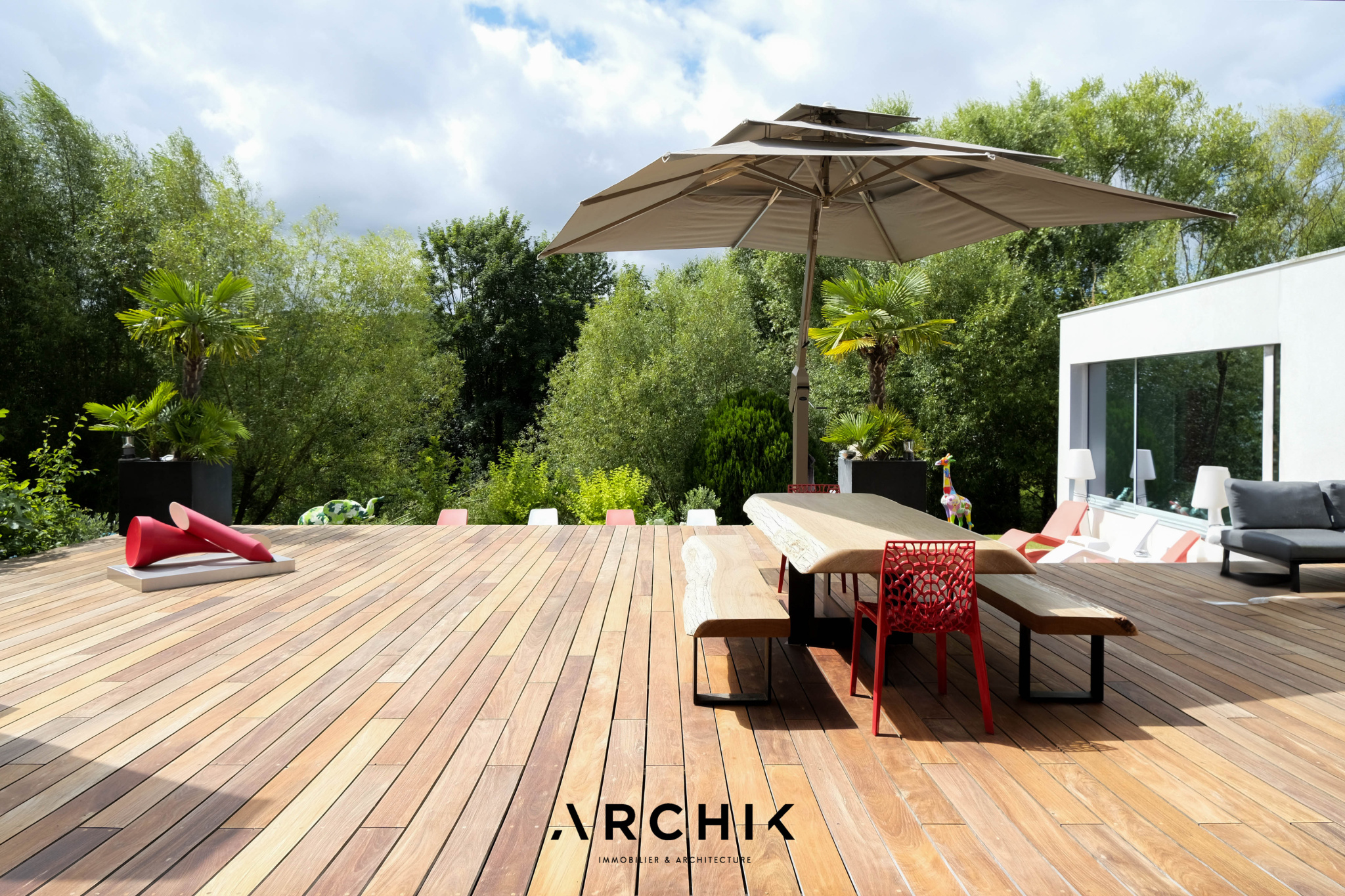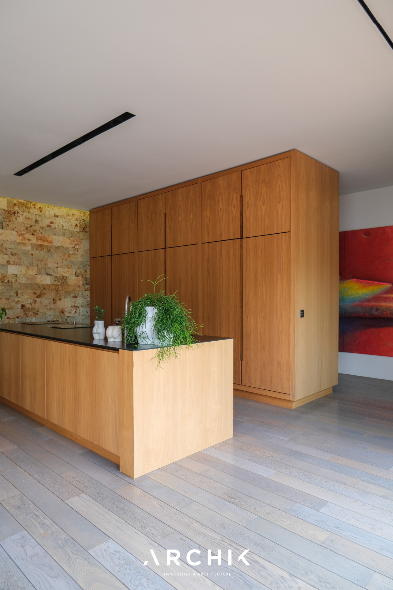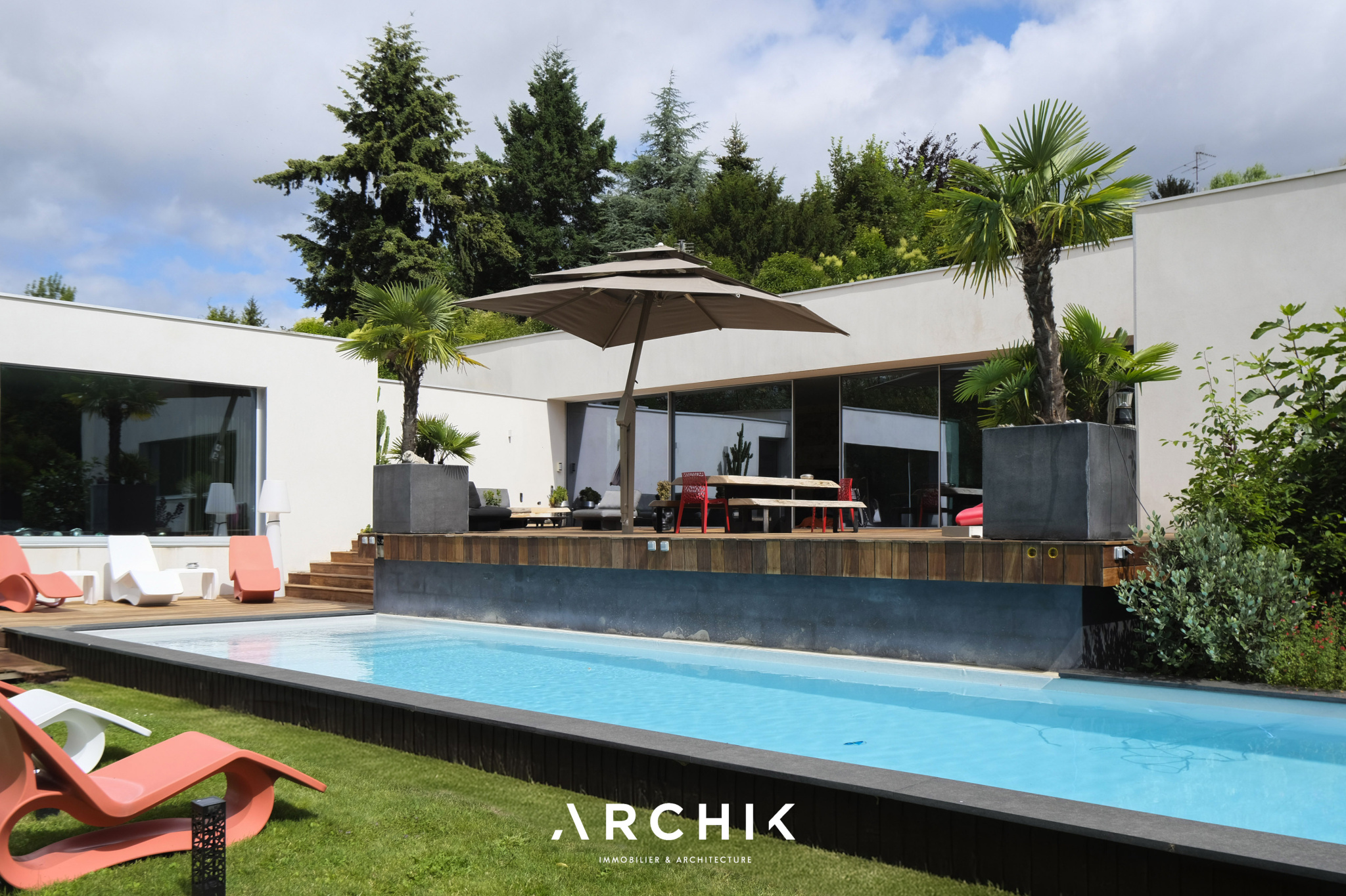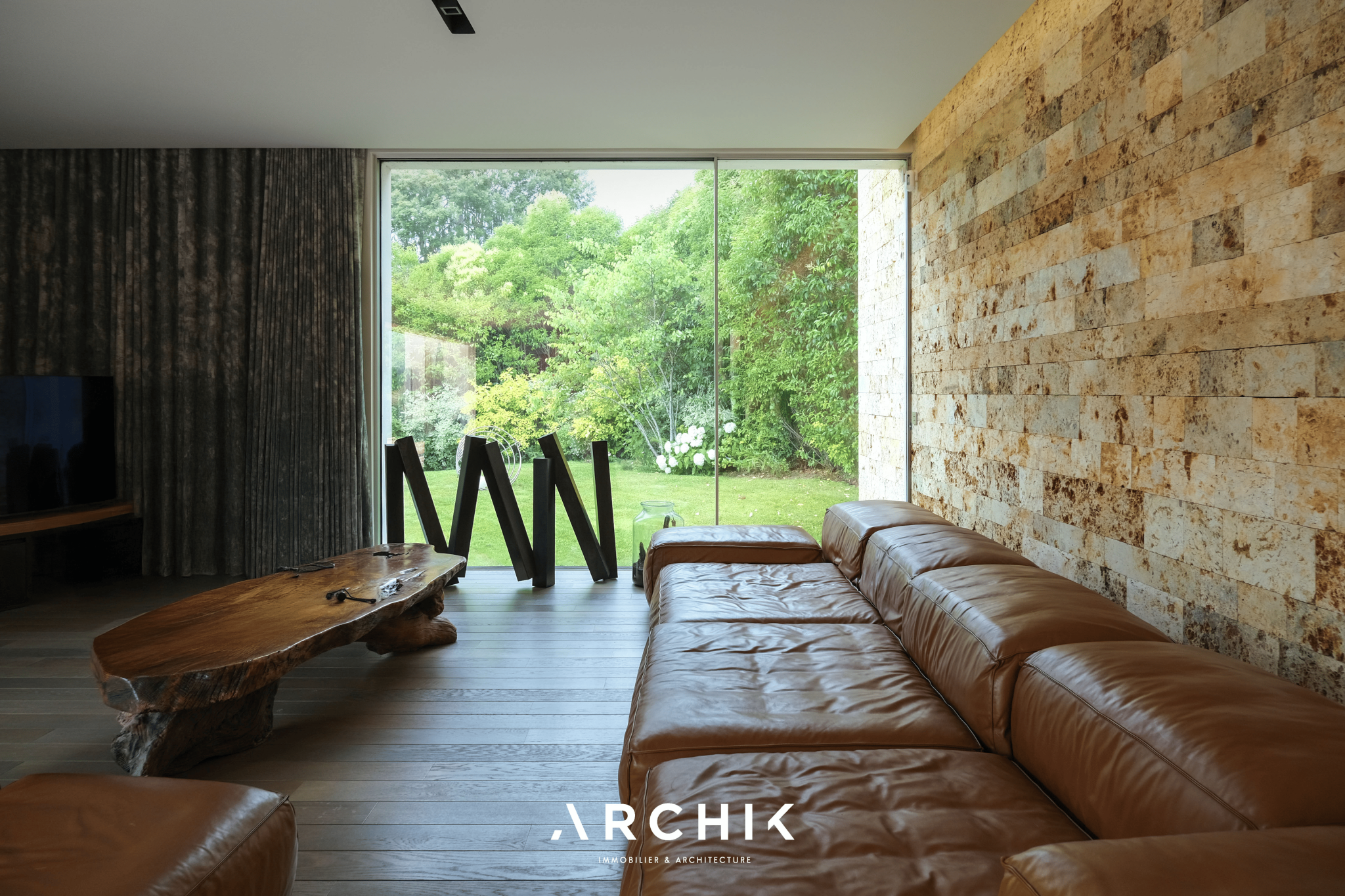 Built in 2013, the architecture of the villa combines tradition and modernity with clear lines and raw materials, such as reworked millstone, cut from the block to form a seamless facing. It becomes the signature of the place by lining the wall of its living room and creating a common thread with the exterior facade. From the entrance, the oriental inspiration and artisanal know-how are felt with a majestic door made by the Coubertin foundry. The spirit of the place, both refined and warm, is manifested in a living room of 110 m2, facing South and covered with raw oak parquet flooring, including a kitchen clad in wood and a wooden worktop. black granite from Zimbabwe. The volume opens with a monumental custom-designed bay window running along the entire room and at full height. Its horizontal aluminum alloy structure with an invisible threshold creates a space of light and freedom, blurring the architectural barrier between interior and exterior. Outside, the 80 m2 wooden terrace and its heated infinity pool offer a clear view of a landscaped green setting and a river at the back of the property. The night area has three large suites with marble bathrooms or tadelakt shower rooms, according to Moroccan tradition. Ochres, earth colors, wood and stone live in perfect harmony, offering numerous storage spaces, dressing rooms and corridors with graphic lines. Walls covered in matte black rubber lacquer contrast with the white and the light, creating new perspectives on the vegetal and intimate exterior. On the garden level, two additional bedrooms with private shower rooms recall the earthy color and authenticity of the place. A laundry area, a gym and a home cinema complete this level. An independent 30 m2 studio with integrated kitchenette that can be converted into a work space as well as a 30 m2 garage and six parking spaces complete the picture.