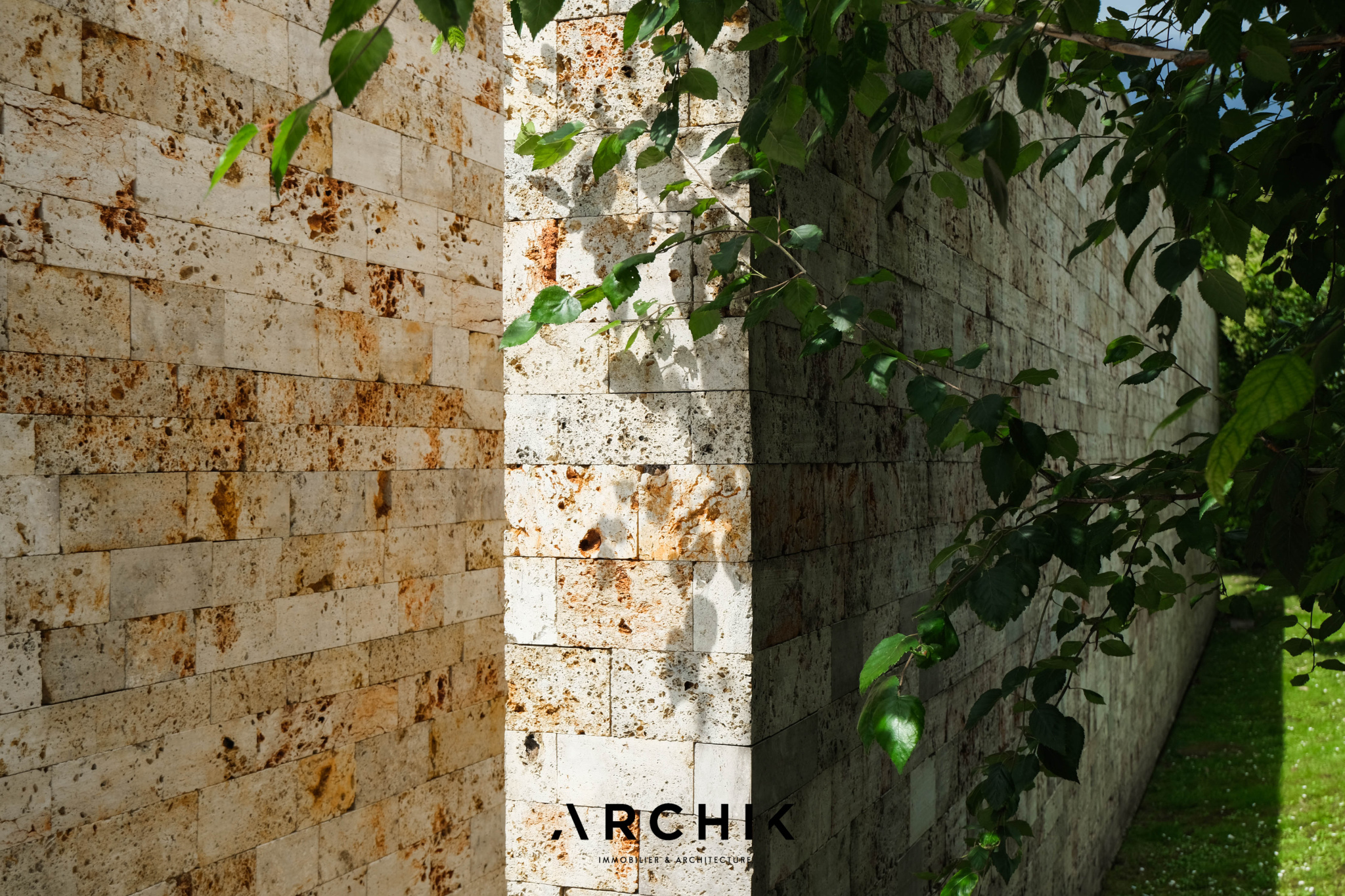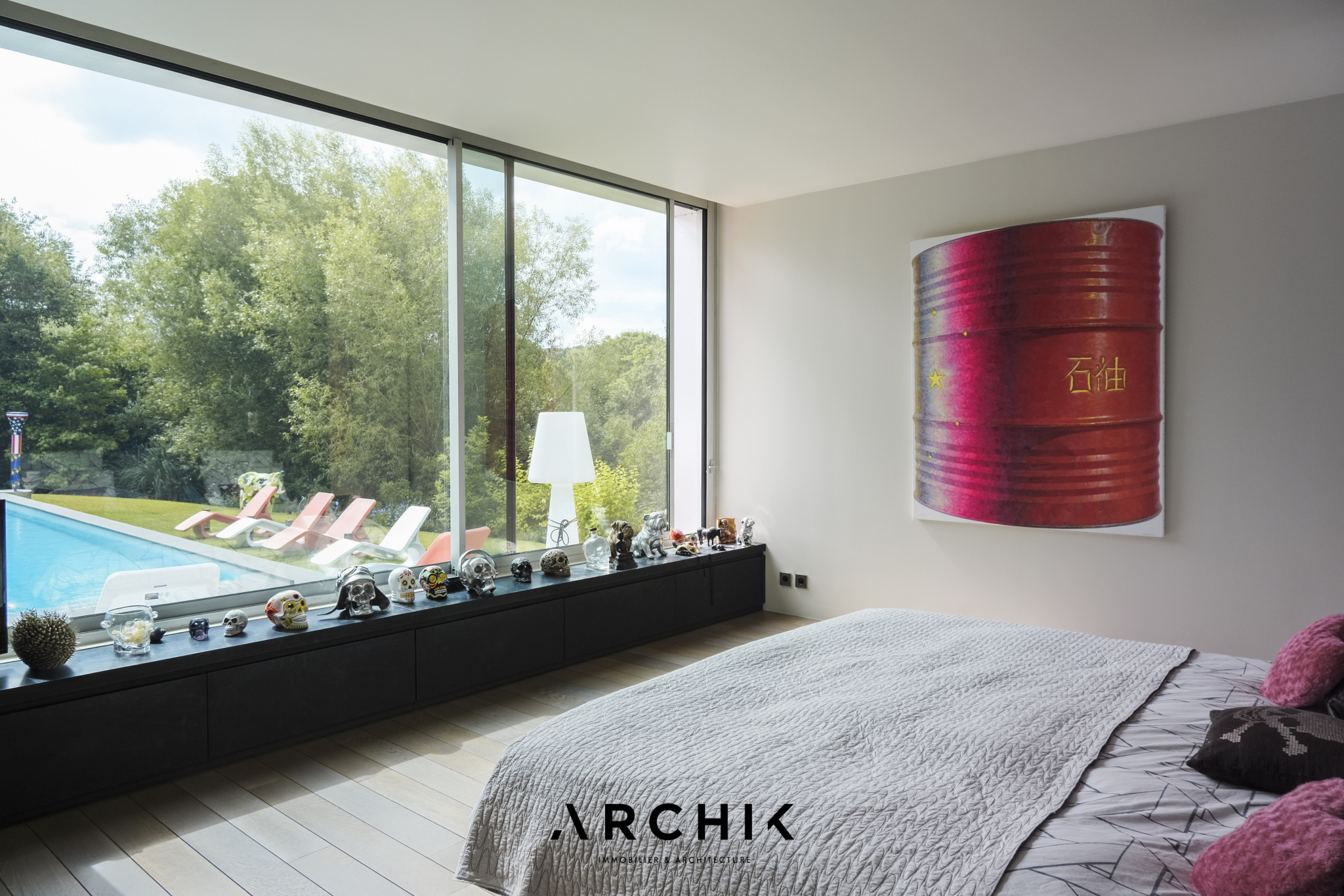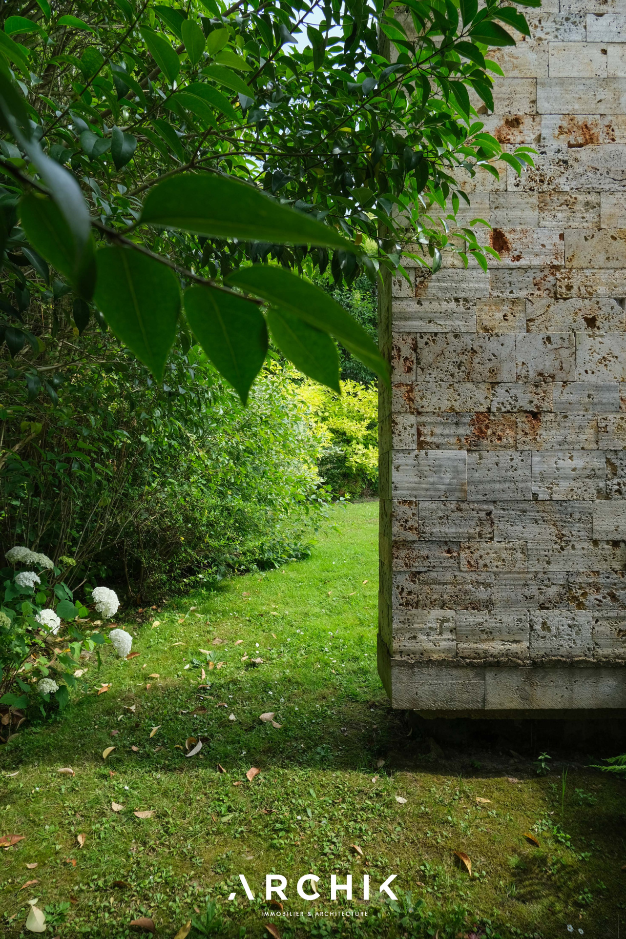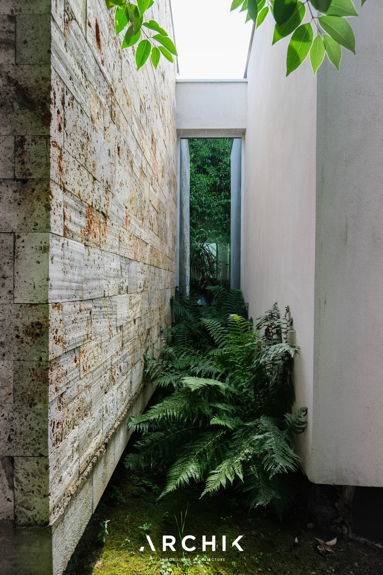 Built in 2013, the architecture of the villa combines tradition and modernity with clear lines and raw materials, such as reworked millstone, cut from the block to form a seamless facing. It becomes the signature of the place by lining the wall of its living room and creating a common thread with the exterior facade. From the entrance, the oriental inspiration and artisanal know-how are felt with a majestic door made by the Coubertin foundry. The spirit of the place, both refined and warm, is manifested in a living room of 110 m2, facing South and covered with raw oak parquet flooring, including a kitchen clad in wood and a wooden worktop. black granite from Zimbabwe. The volume opens with a monumental custom-designed bay window running along the entire room and at full height. Its horizontal aluminum alloy structure with an invisible threshold creates a space of light and freedom, blurring the architectural barrier between interior and exterior. Outside, the 80 m2 wooden terrace and its heated infinity pool offer a clear view of a landscaped green setting and a river at the back of the property. The night area has three large suites with marble bathrooms or tadelakt shower rooms, according to Moroccan tradition. Ochres, earth colors, wood and stone live in perfect harmony, offering numerous storage spaces, dressing rooms and corridors with graphic lines. Walls covered in matte black rubber lacquer contrast with the white and the light, creating new perspectives on the vegetal and intimate exterior. On the garden level, two additional bedrooms with private shower rooms recall the earthy color and authenticity of the place. A laundry area, a gym and a home cinema complete this level. An independent 30 m2 studio with integrated kitchenette that can be converted into a work space as well as a 30 m2 garage and six parking spaces complete the picture.