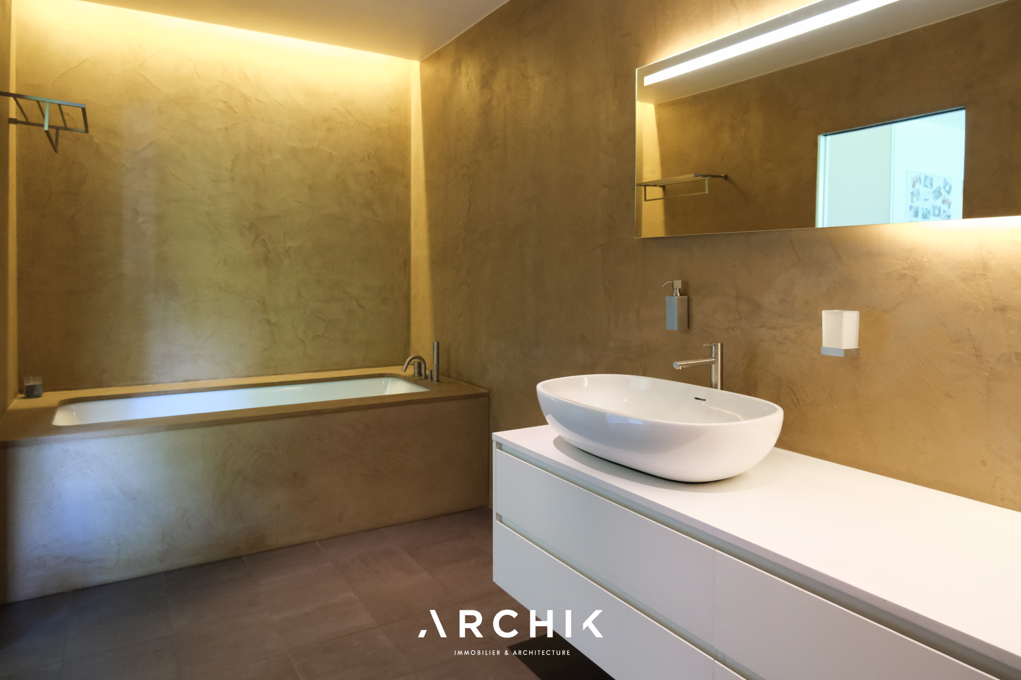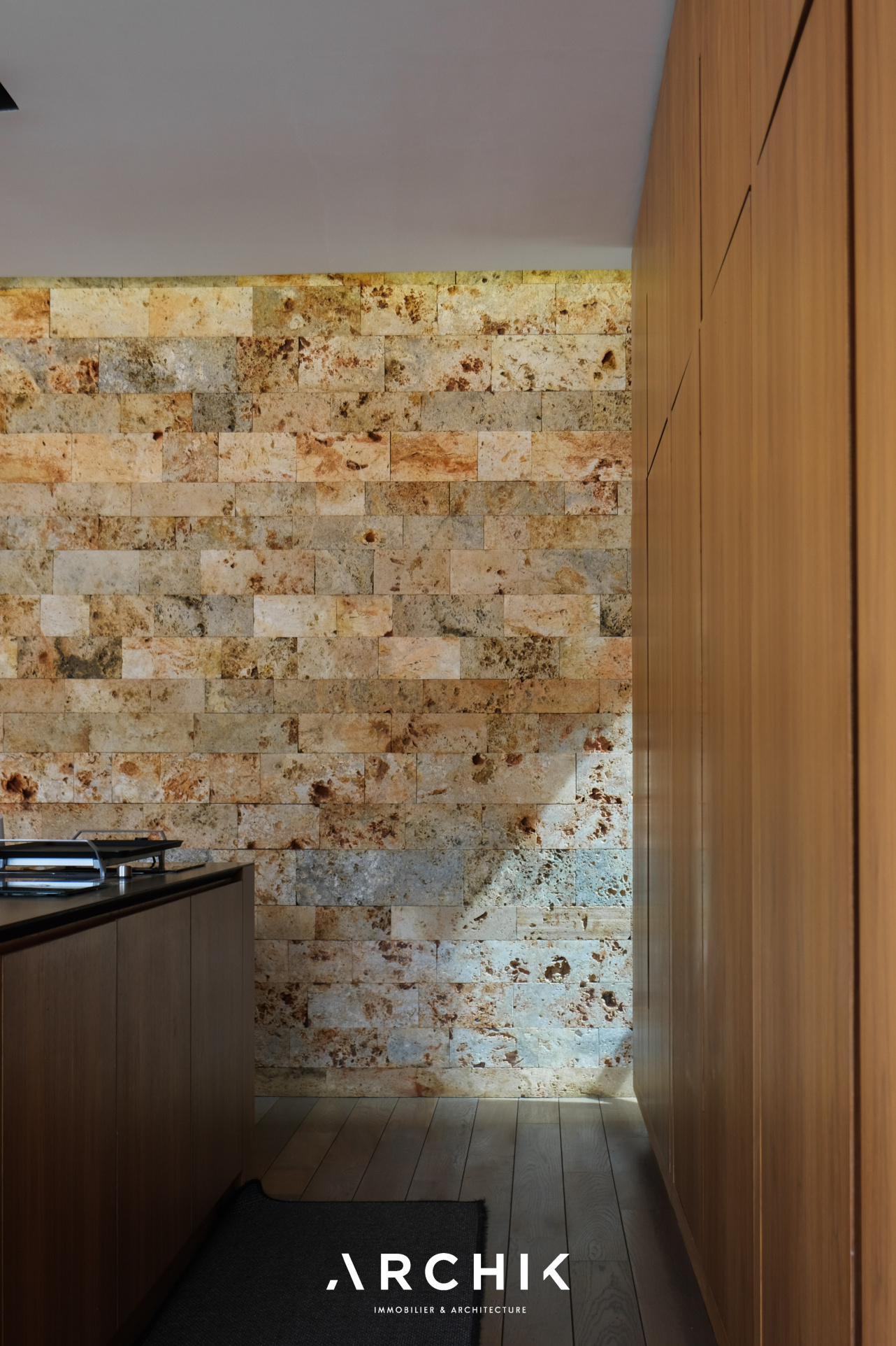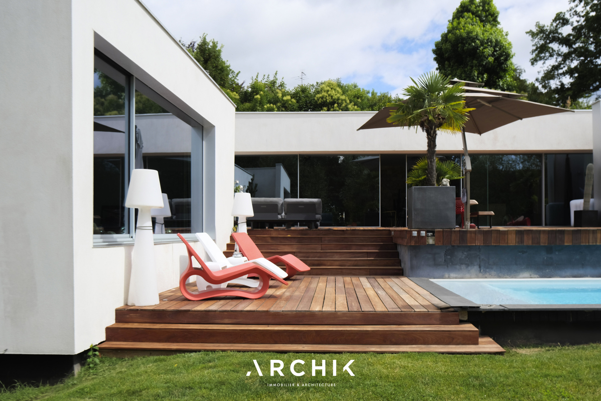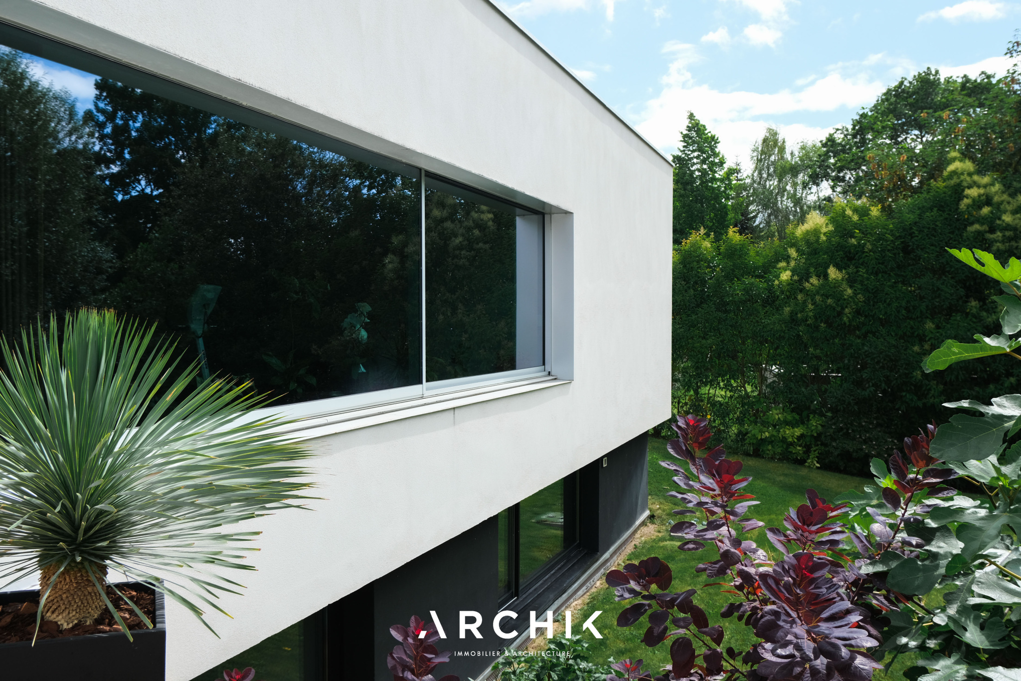 Built in 2013, the architecture of the villa combines tradition and modernity with clear lines and raw materials, such as reworked millstone, cut from the block to form a seamless facing. It becomes the signature of the place by lining the wall of its living room and creating a common thread with the exterior facade. From the entrance, the oriental inspiration and artisanal know-how are felt with a majestic door made by the Coubertin foundry. The spirit of the place, both refined and warm, is manifested in a living room of 110 m2, facing South and covered with raw oak parquet flooring, including a kitchen clad in wood and a wooden worktop. black granite from Zimbabwe. The volume opens with a monumental custom-designed bay window running along the entire room and at full height. Its horizontal aluminum alloy structure with an invisible threshold creates a space of light and freedom, blurring the architectural barrier between interior and exterior. Outside, the 80 m2 wooden terrace and its heated infinity pool offer a clear view of a landscaped green setting and a river at the back of the property. The night area has three large suites with marble bathrooms or tadelakt shower rooms, according to Moroccan tradition. Ochres, earth colors, wood and stone live in perfect harmony, offering numerous storage spaces, dressing rooms and corridors with graphic lines. Walls covered in matte black rubber lacquer contrast with the white and the light, creating new perspectives on the vegetal and intimate exterior. On the garden level, two additional bedrooms with private shower rooms recall the earthy color and authenticity of the place. A laundry area, a gym and a home cinema complete this level. An independent 30 m2 studio with integrated kitchenette that can be converted into a work space as well as a 30 m2 garage and six parking spaces complete the picture.