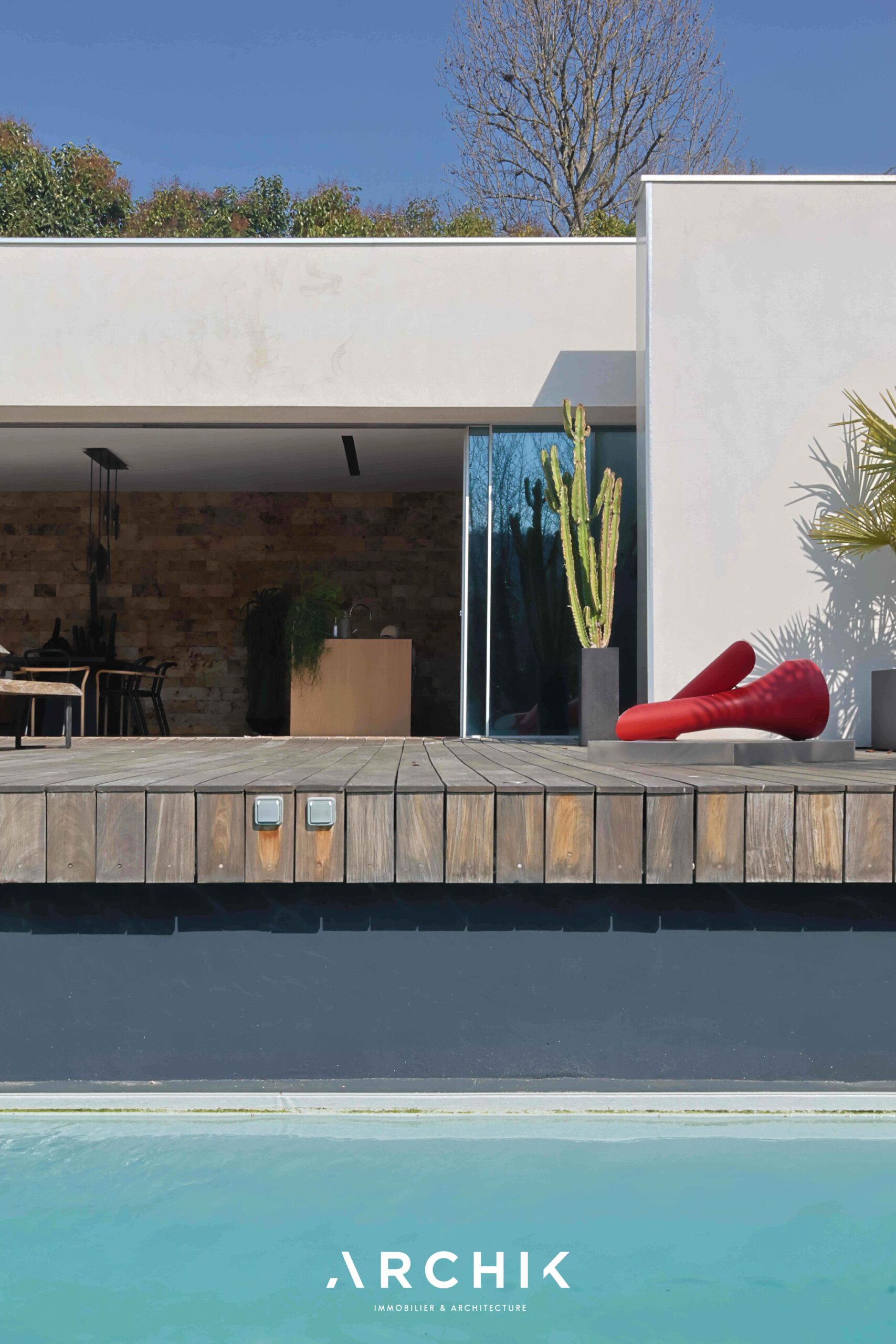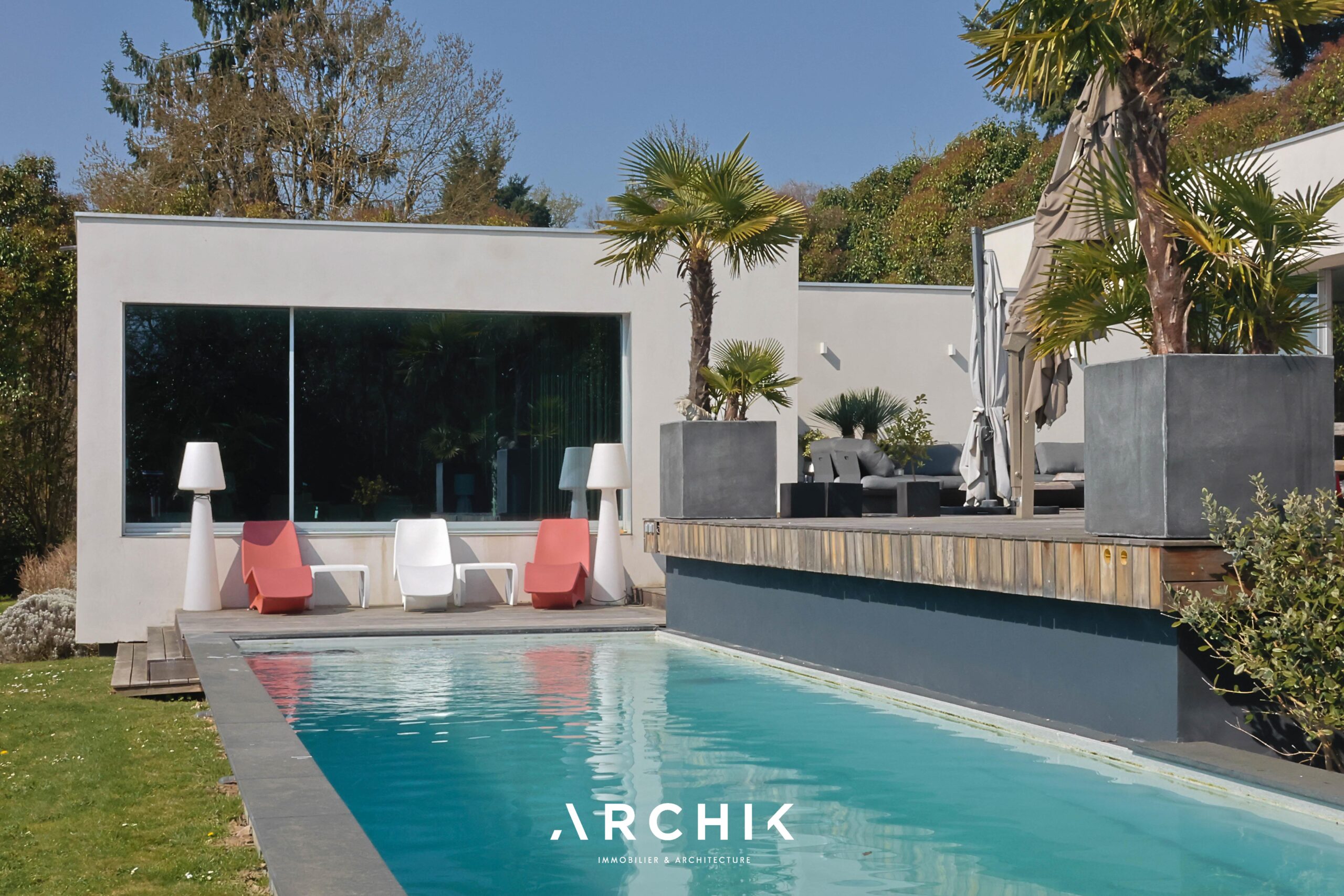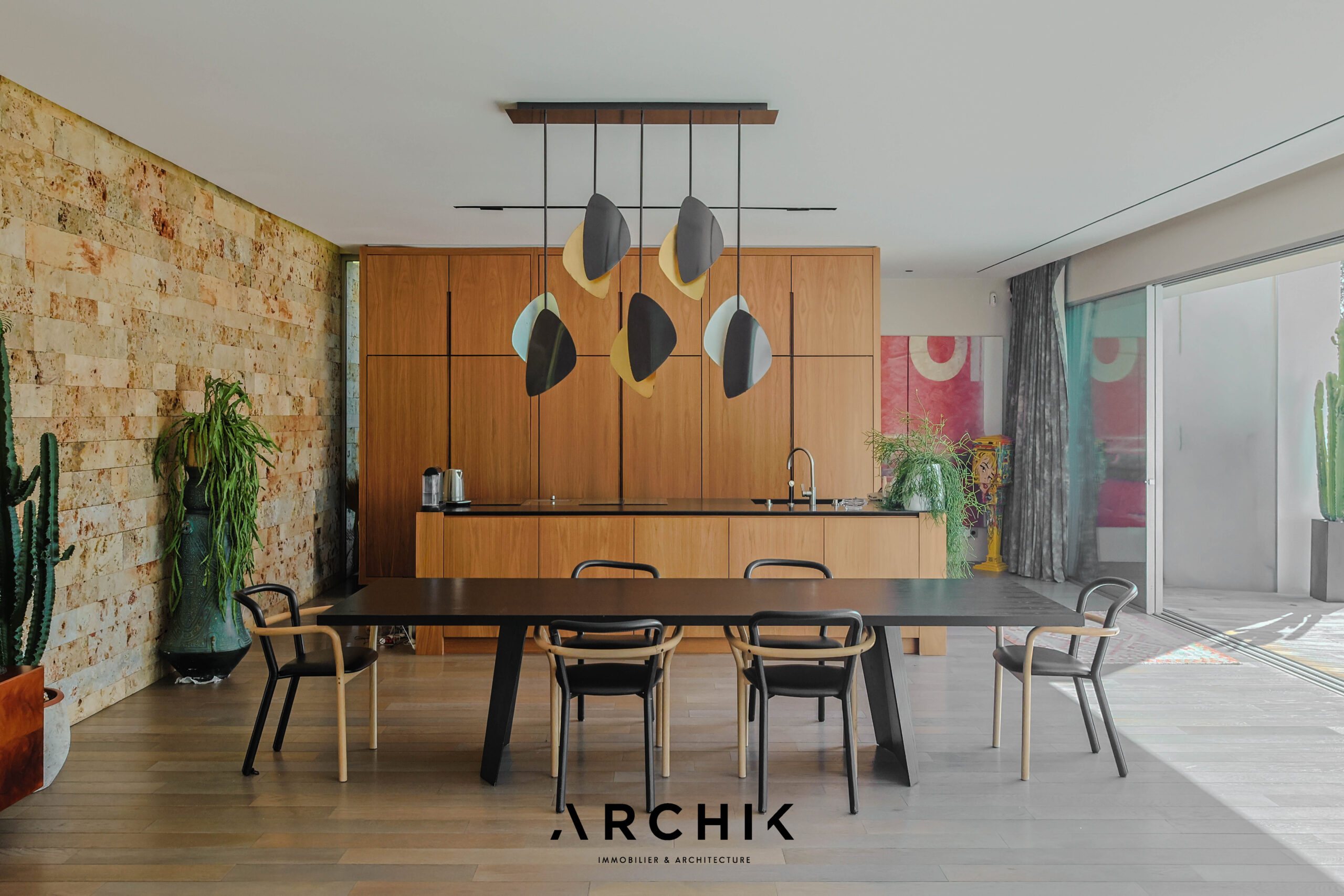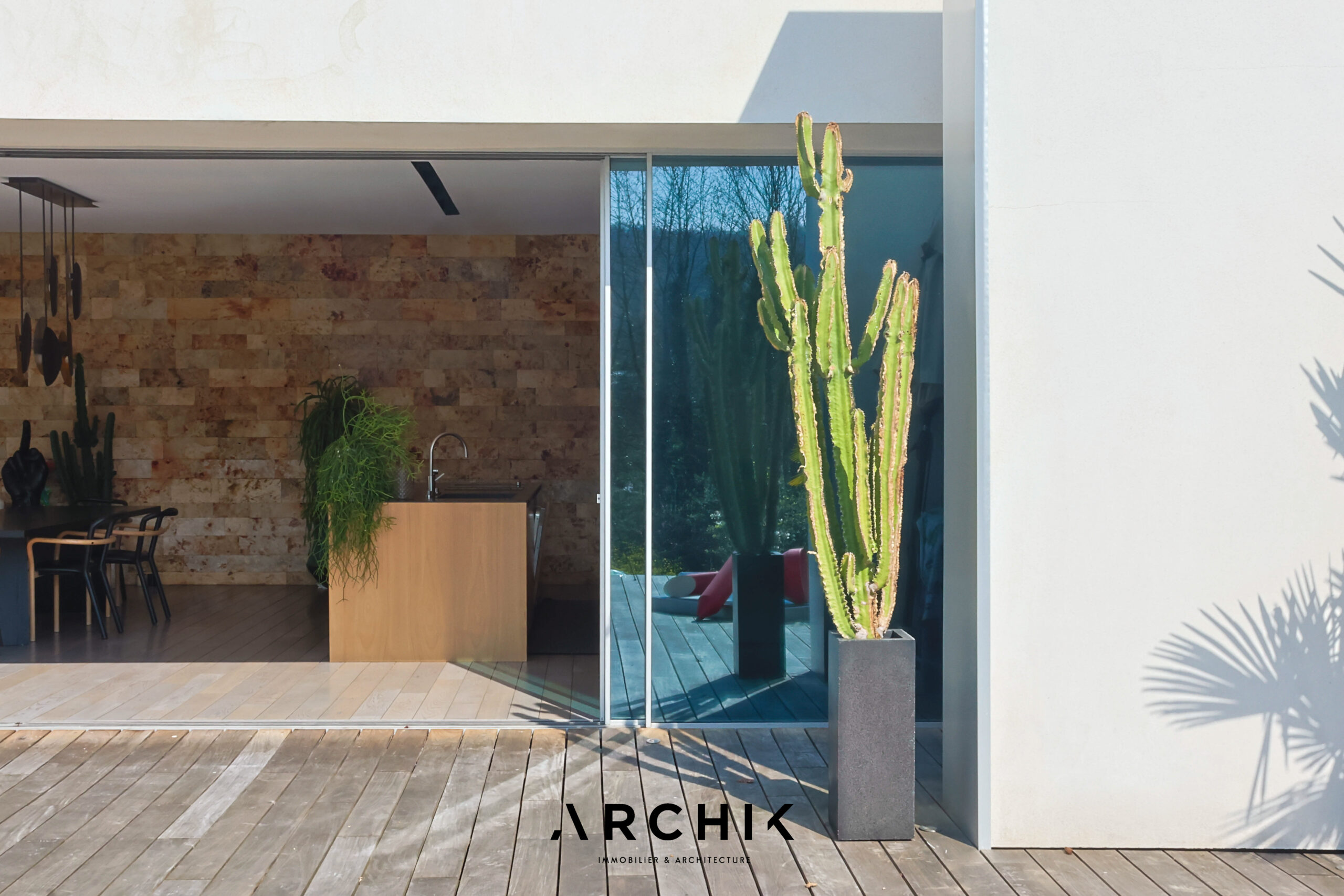 Built in 2013, the architecture of the villa combines tradition and modernity with clear lines and raw materials, such as reworked millstone, cut from the block to form a seamless facing. It becomes the signature of the place by lining the wall of its living room and creating a common thread with the exterior facade. From the entrance, the oriental inspiration and artisanal know-how are felt with a majestic door made by the Coubertin foundry. The spirit of the place, both refined and warm, is manifested in a living room of 110 m2, facing South and covered with raw oak parquet flooring, including a kitchen clad in wood and a wooden worktop. black granite from Zimbabwe. The volume opens with a monumental custom-designed bay window running along the entire room and at full height. Its horizontal aluminum alloy structure with an invisible threshold creates a space of light and freedom, blurring the architectural barrier between interior and exterior. Outside, the 80 m2 wooden terrace and its heated infinity pool offer a clear view of a landscaped green setting and a river at the back of the property. The night area has three large suites with marble bathrooms or tadelakt shower rooms, according to Moroccan tradition. Ochres, earth colors, wood and stone live in perfect harmony, offering numerous storage spaces, dressing rooms and corridors with graphic lines. Walls covered in matte black rubber lacquer contrast with the white and the light, creating new perspectives on the vegetal and intimate exterior. On the garden level, two additional bedrooms with private shower rooms recall the earthy color and authenticity of the place. A laundry area, a gym and a home cinema complete this level. An independent 30 m2 studio with integrated kitchenette that can be converted into a work space as well as a 30 m2 garage and six parking spaces complete the picture.