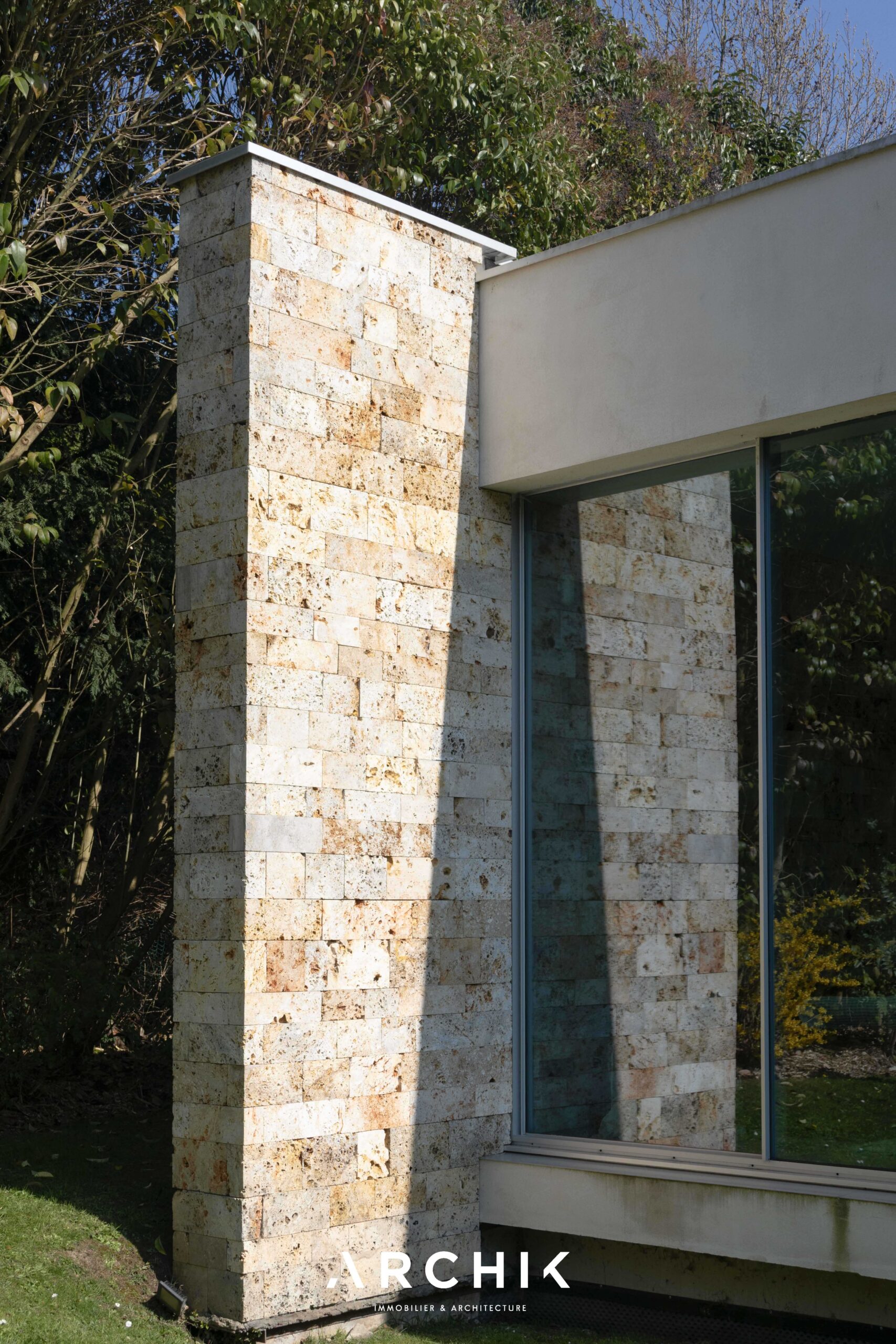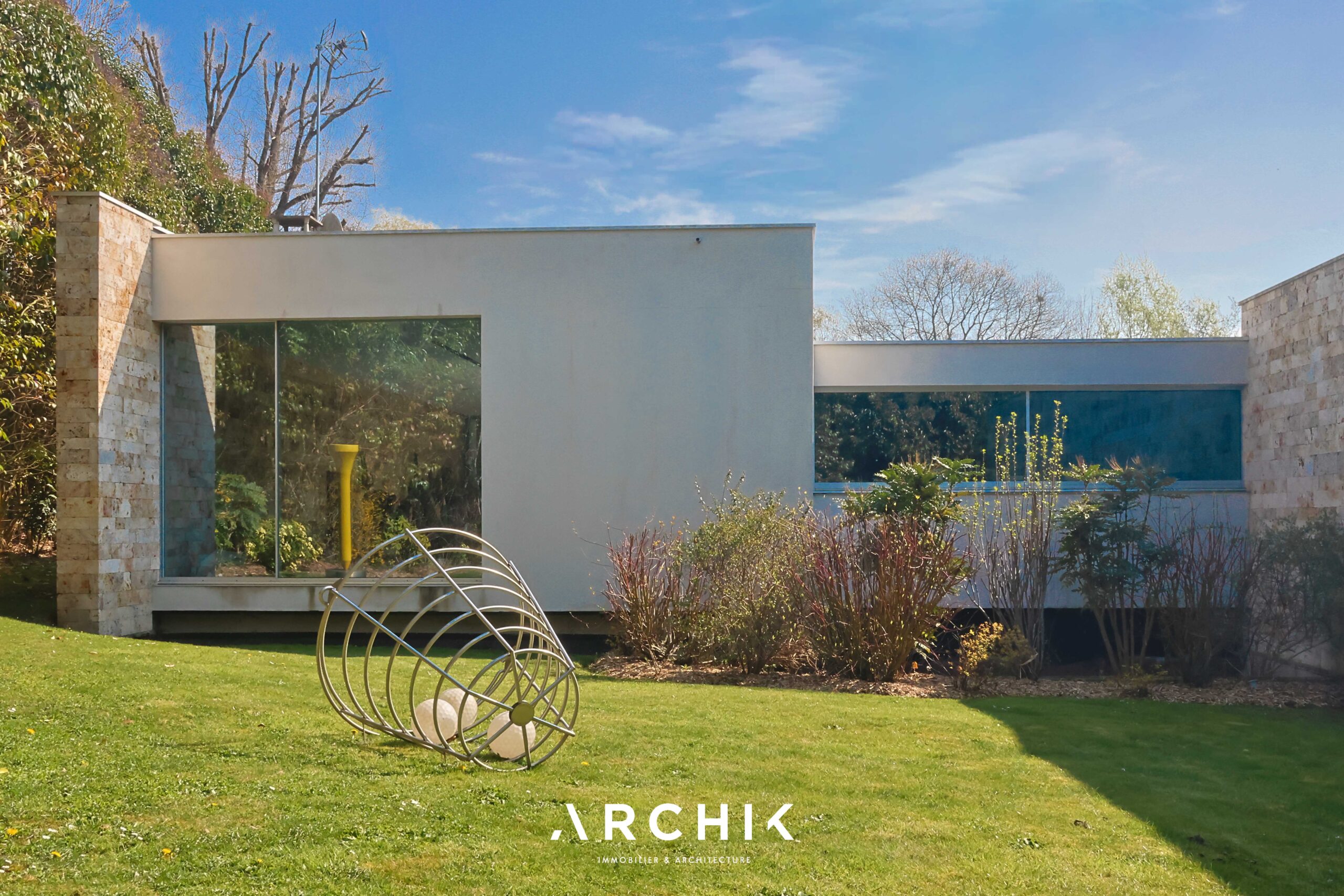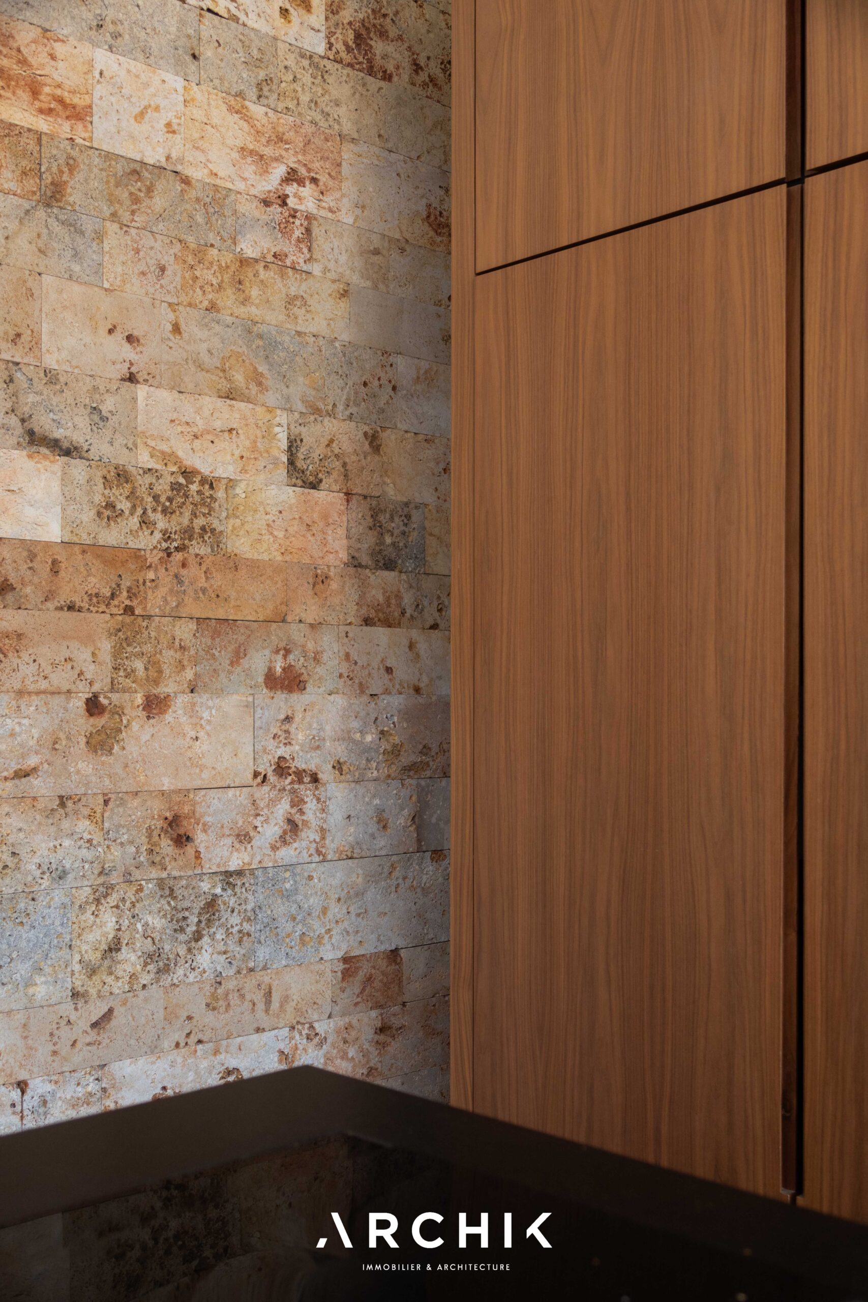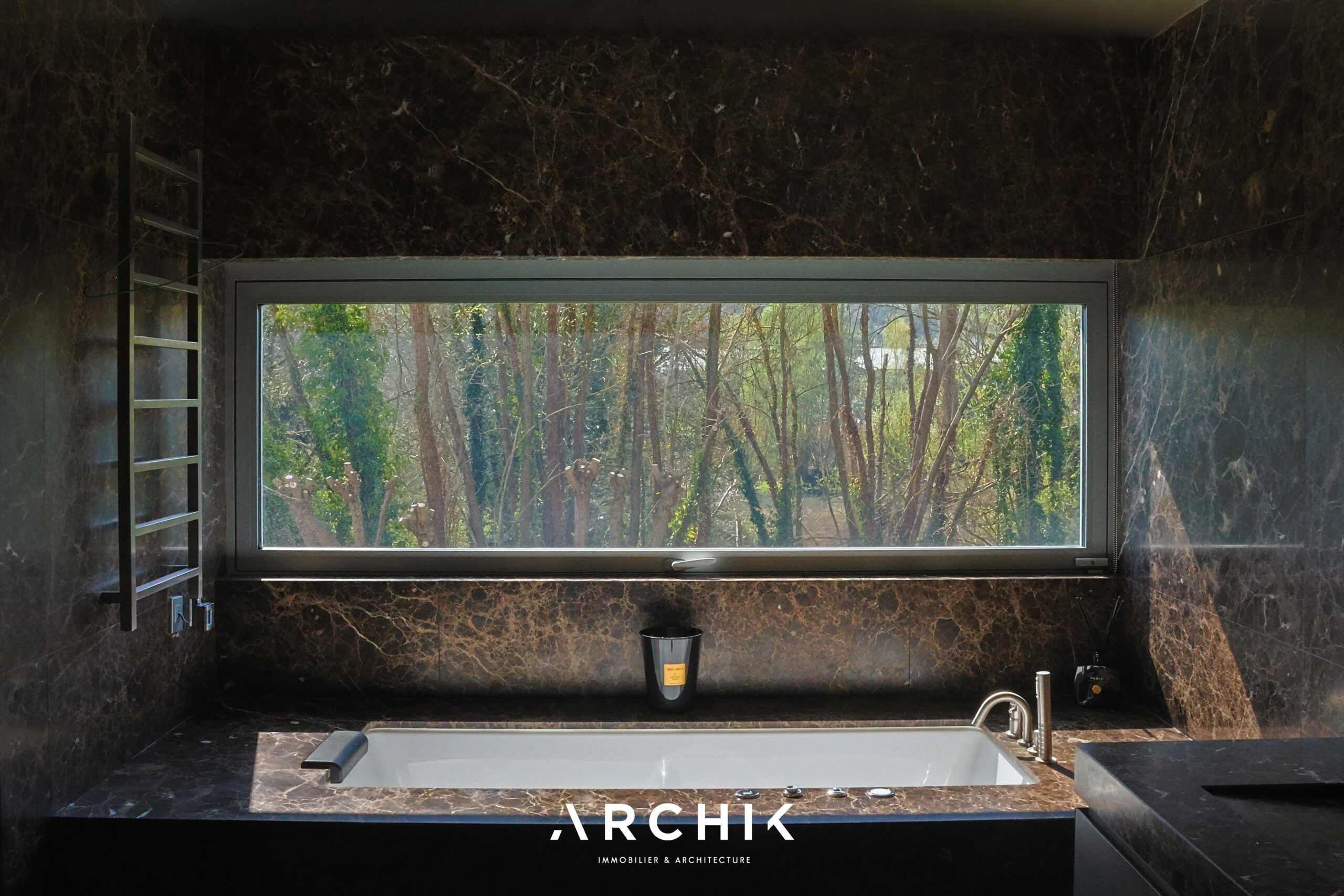 Built in 2013, the architecture of the villa combines tradition and modernity with clear lines and raw materials, such as reworked millstone, cut from the block to form a seamless facing. It becomes the signature of the place by lining the wall of its living room and creating a common thread with the exterior facade. From the entrance, the oriental inspiration and artisanal know-how are felt with a majestic door made by the Coubertin foundry. The spirit of the place, both refined and warm, is manifested in a living room of 110 m2, facing South and covered with raw oak parquet flooring, including a kitchen clad in wood and a wooden worktop. black granite from Zimbabwe. The volume opens with a monumental custom-designed bay window running along the entire room and at full height. Its horizontal aluminum alloy structure with an invisible threshold creates a space of light and freedom, blurring the architectural barrier between interior and exterior. Outside, the 80 m2 wooden terrace and its heated infinity pool offer a clear view of a landscaped green setting and a river at the back of the property. The night area has three large suites with marble bathrooms or tadelakt shower rooms, according to Moroccan tradition. Ochres, earth colors, wood and stone live in perfect harmony, offering numerous storage spaces, dressing rooms and corridors with graphic lines. Walls covered in matte black rubber lacquer contrast with the white and the light, creating new perspectives on the vegetal and intimate exterior. On the garden level, two additional bedrooms with private shower rooms recall the earthy color and authenticity of the place. A laundry area, a gym and a home cinema complete this level. An independent 30 m2 studio with integrated kitchenette that can be converted into a work space as well as a 30 m2 garage and six parking spaces complete the picture.