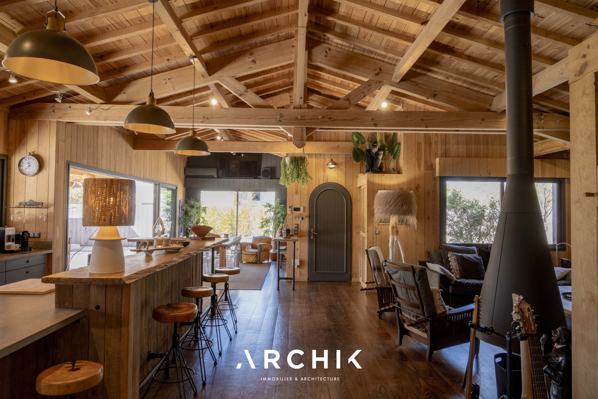 Construite en 2021, elle a été réalisée en pin des Landes par des Compagnons du Devoir. Dès l'entrée, la spectaculaire pièce à vivre offre un volume hors du commun qui laisse apparaitre la charpente et par l'intermédiaire de vastes baies à galandage permet de profiter de l'extérieur. Cette pièce en L permet de distinguer chaque espace avec un poêle central coté salon, une cuisine entièrement équipée avec bar et une grande table pour dix convives qui longe les baies vitrées, ouvrant sur la terrasse couverte avec son salon extérieur, son babyfoot et l'espace repas à l'ombre des Lilas des Indes centenaires. Les trois chambres de la maison dont une suite avec dressing ont toutes leur salle d'eau privative, et une des chambres est dotée de 4 couchages avec un lit double en bas et un lit double sur mezzanine. Une buanderie complète le bien.