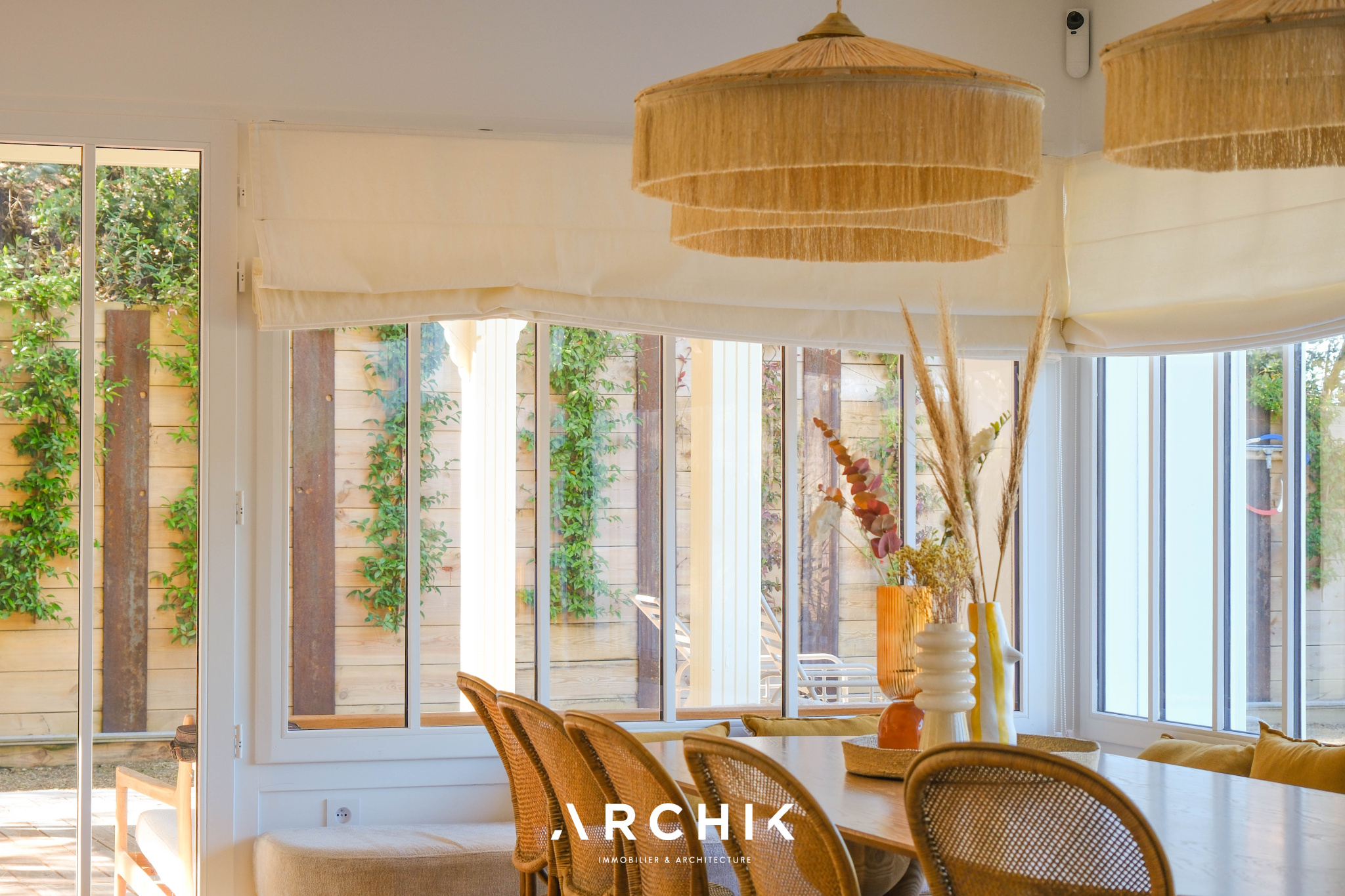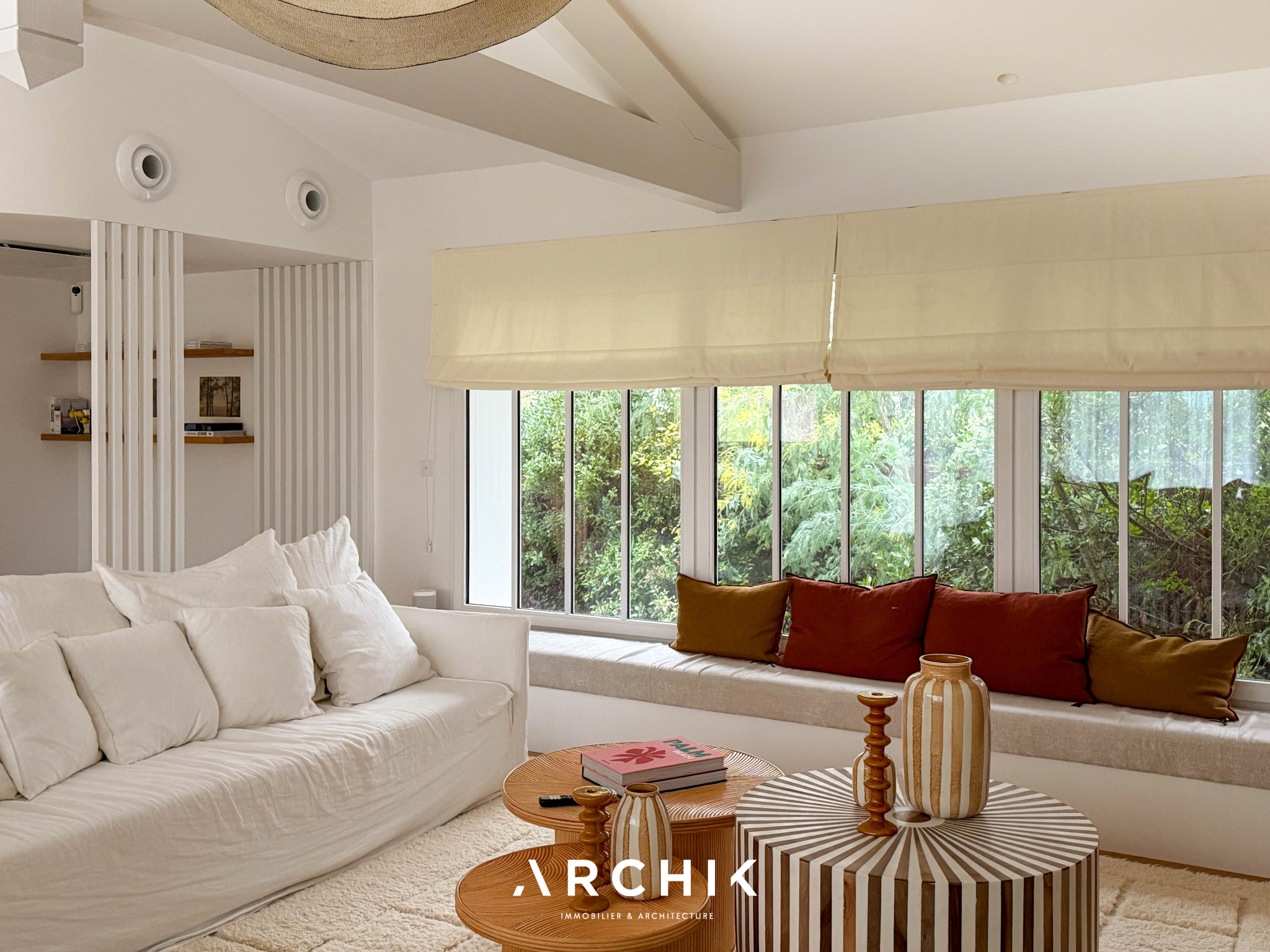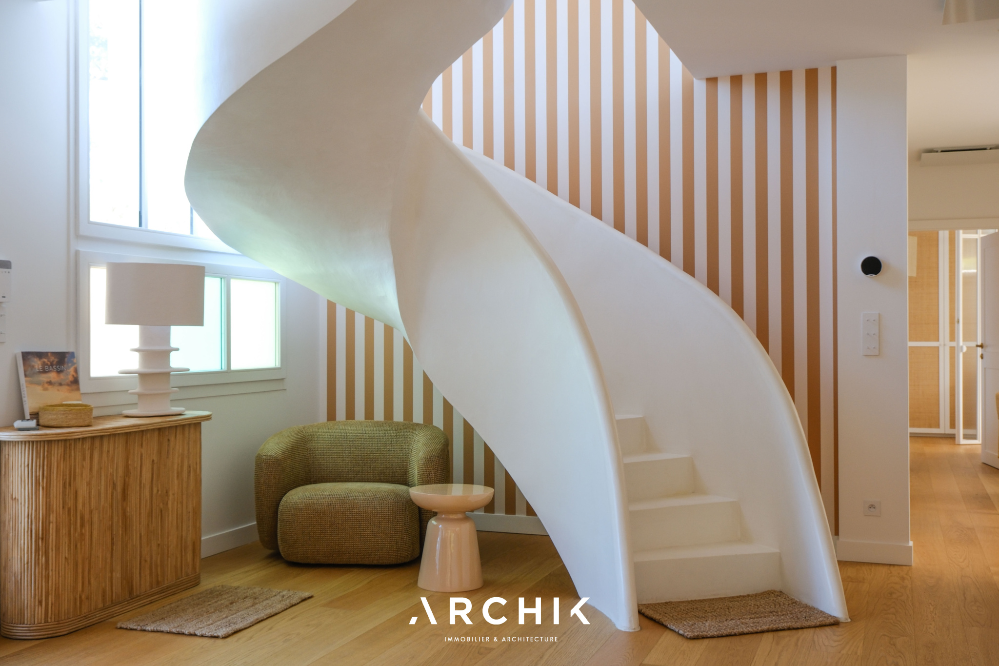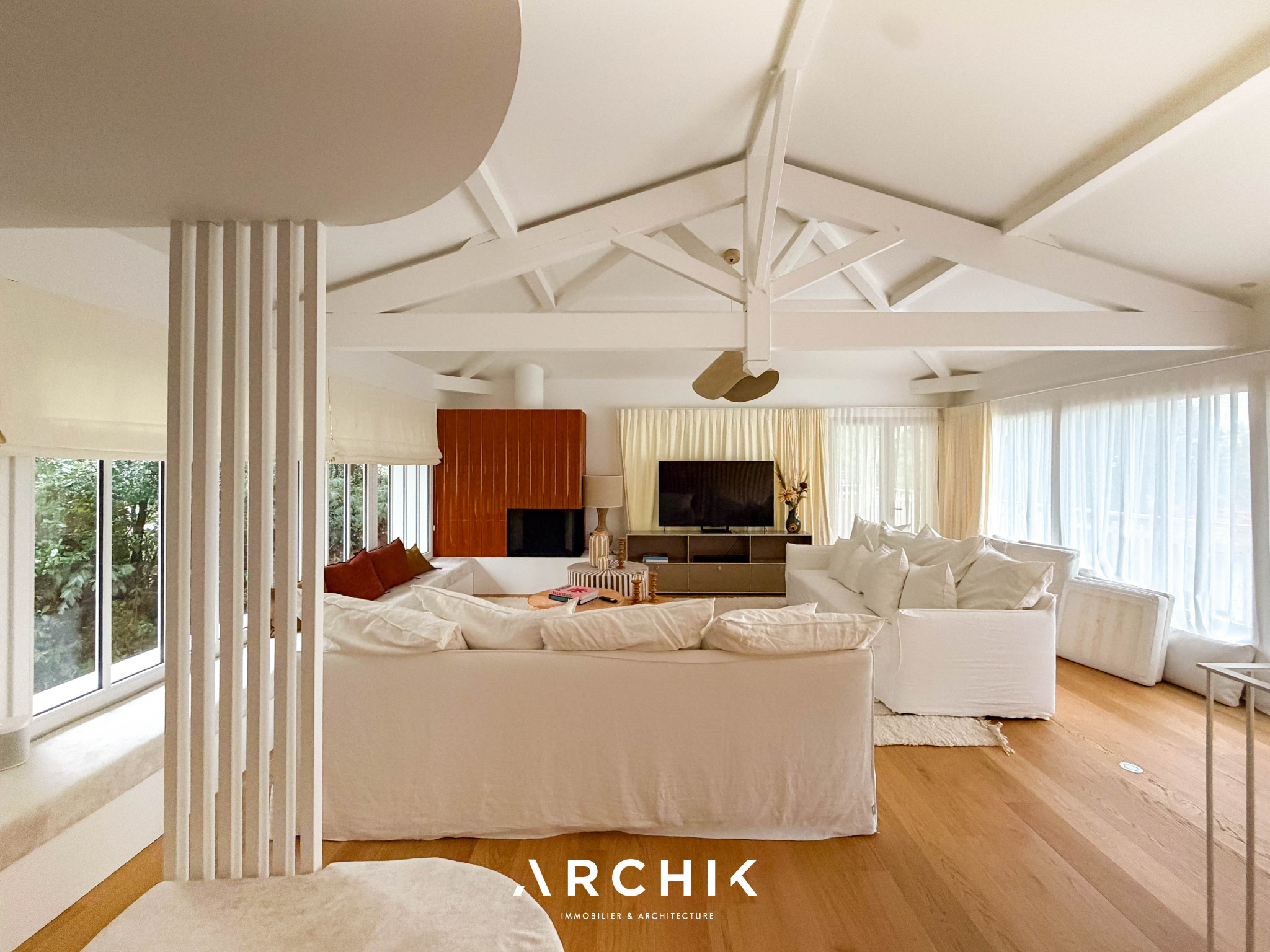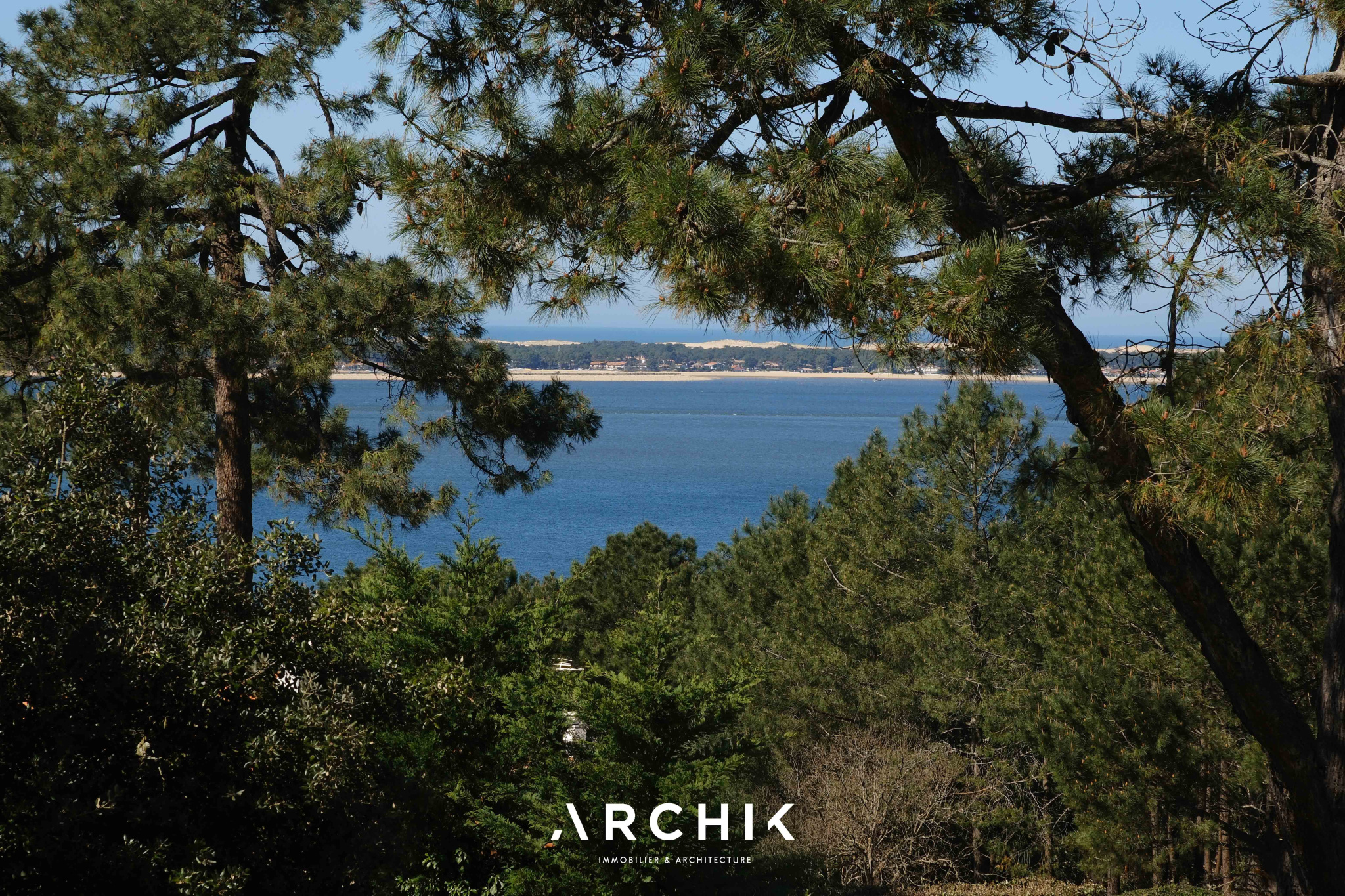 Au rez-de-chaussée, une cuisine ouverte aux lignes arrondies s'intègre harmonieusement à une salle à manger entièrement vitrée, prolongée par une terrasse couverte qui dirige vers la cuisine extérieur, la piscine chauffée et le terrain de pétanque entourés d'une végétation locale. Un escalier hélicoïdal blanc, véritable pièce sculpturale, mène à l'étage où se dévoile un salon au plafond cathédral. De larges bandeaux vitrés façon atelier inonde la pièce de lumière et offre une vue dominante sur les pins. Un coin cheminée, aux teintes ocre, crée une atmosphère chaleureuse en demi-saison, tandis que la terrasse couverte accessible depuis le salon invite à la détente face au paysage. Sur ce même niveau, une suite parentale avec terrasse privative dispose d'une baignoire extérieure offrant une vue jusqu'à l'eau.