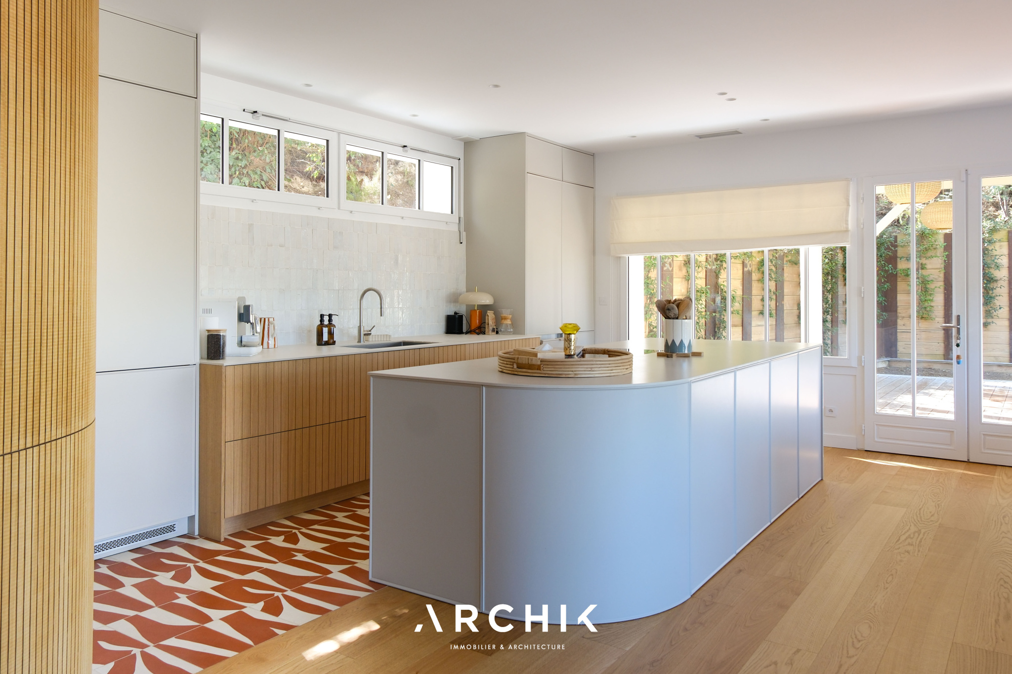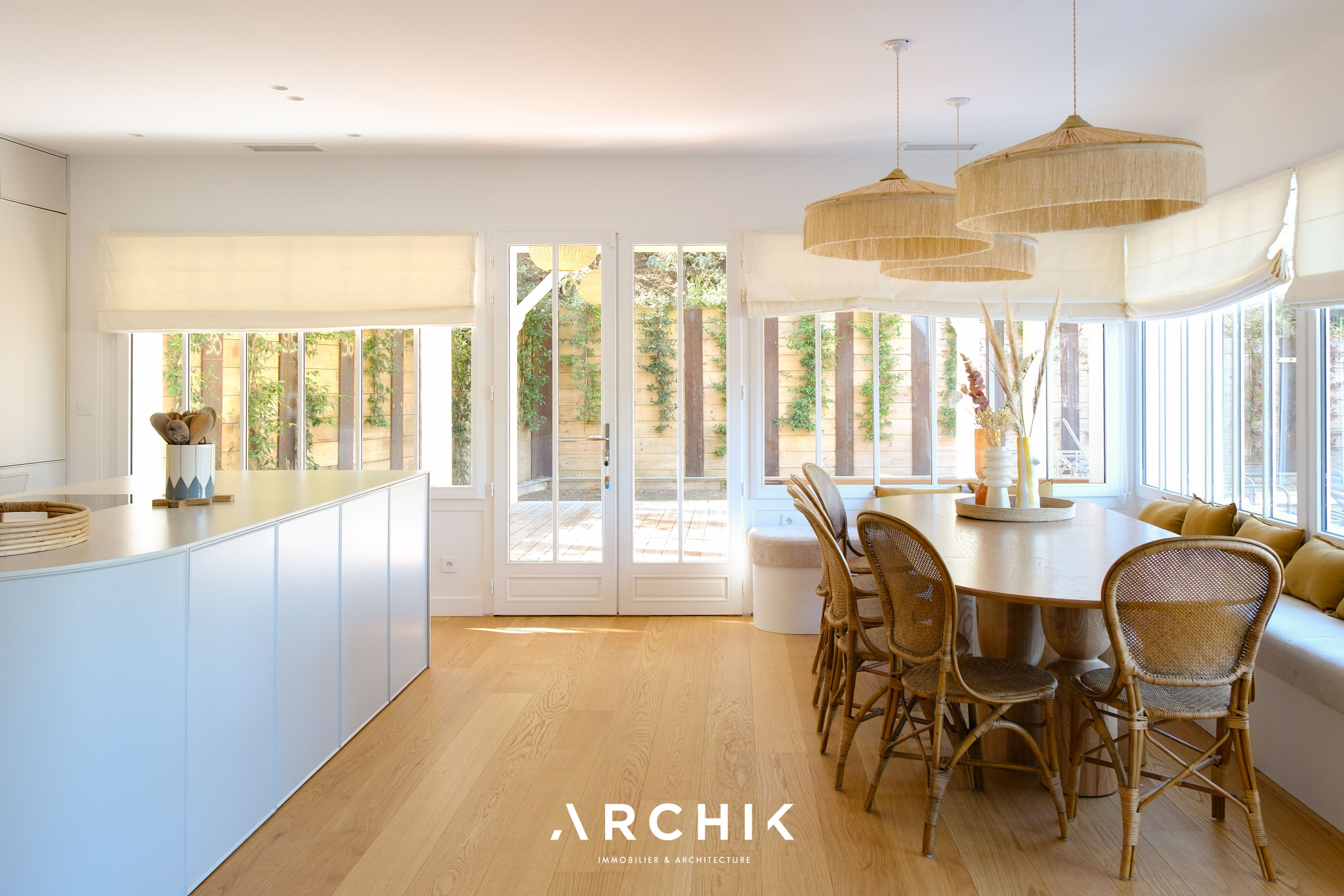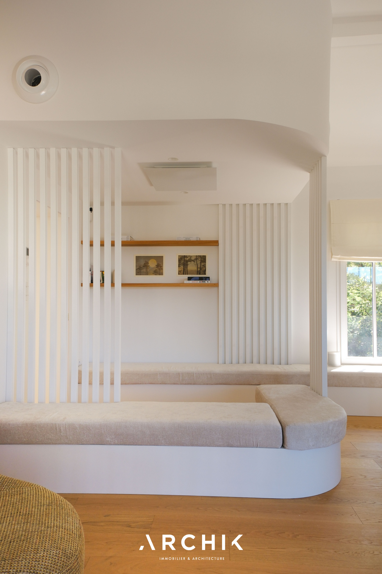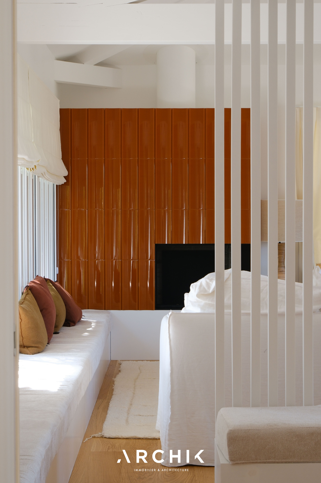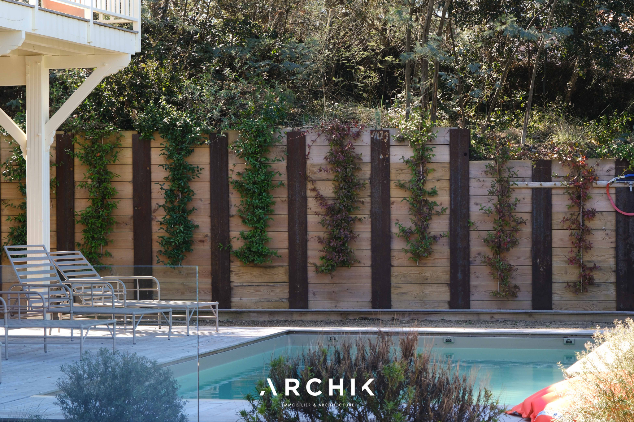 Au rez-de-chaussée, une cuisine ouverte aux lignes arrondies s'intègre harmonieusement à une salle à manger entièrement vitrée, prolongée par une terrasse couverte qui dirige vers la cuisine extérieur, la piscine chauffée et le terrain de pétanque entourés d'une végétation locale. Un escalier hélicoïdal blanc, véritable pièce sculpturale, mène à l'étage où se dévoile un salon au plafond cathédral. De larges bandeaux vitrés façon atelier inonde la pièce de lumière et offre une vue dominante sur les pins. Un coin cheminée, aux teintes ocre, crée une atmosphère chaleureuse en demi-saison, tandis que la terrasse couverte accessible depuis le salon invite à la détente face au paysage. Sur ce même niveau, une suite parentale avec terrasse privative dispose d'une baignoire extérieure offrant une vue jusqu'à l'eau.