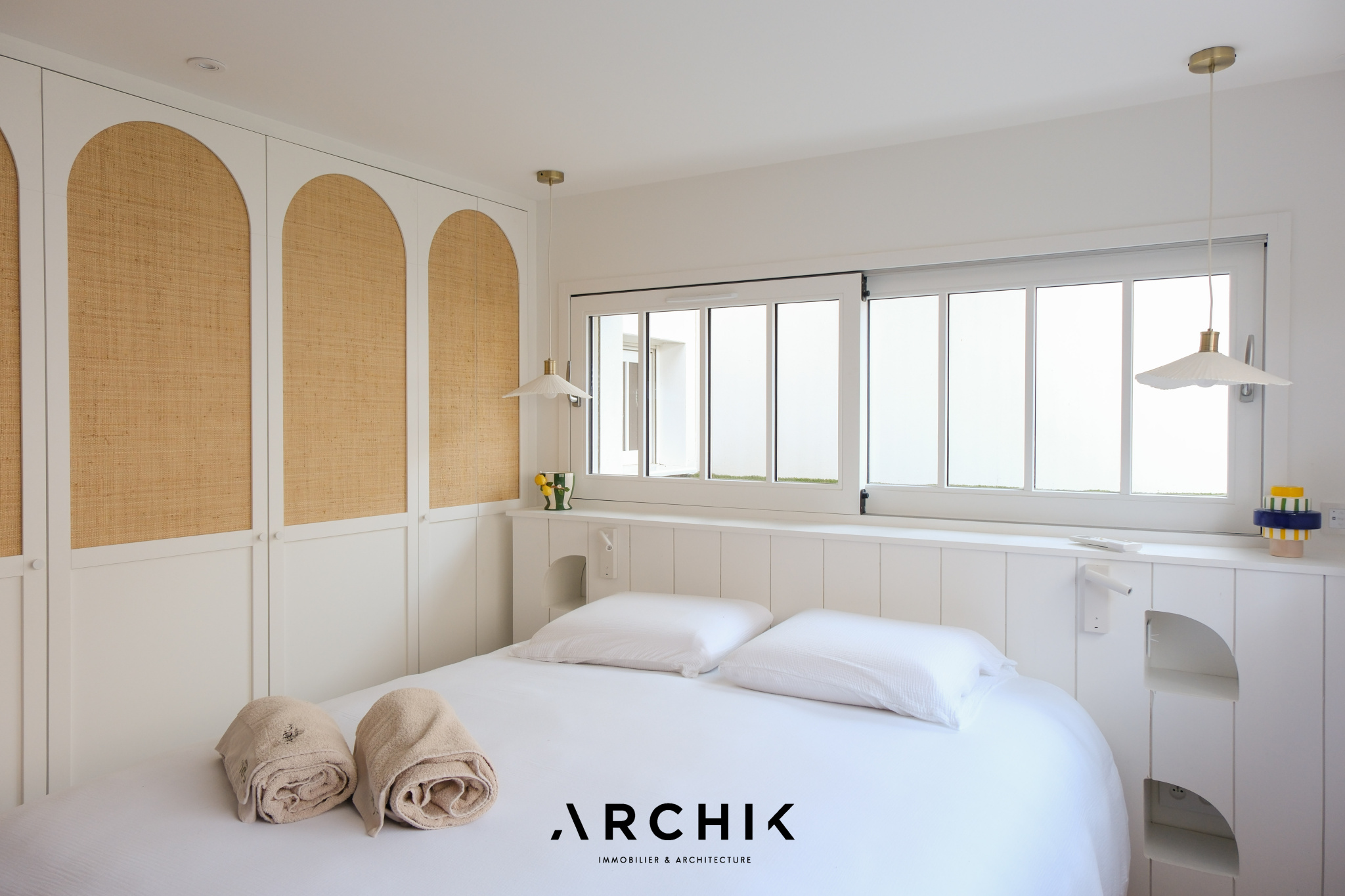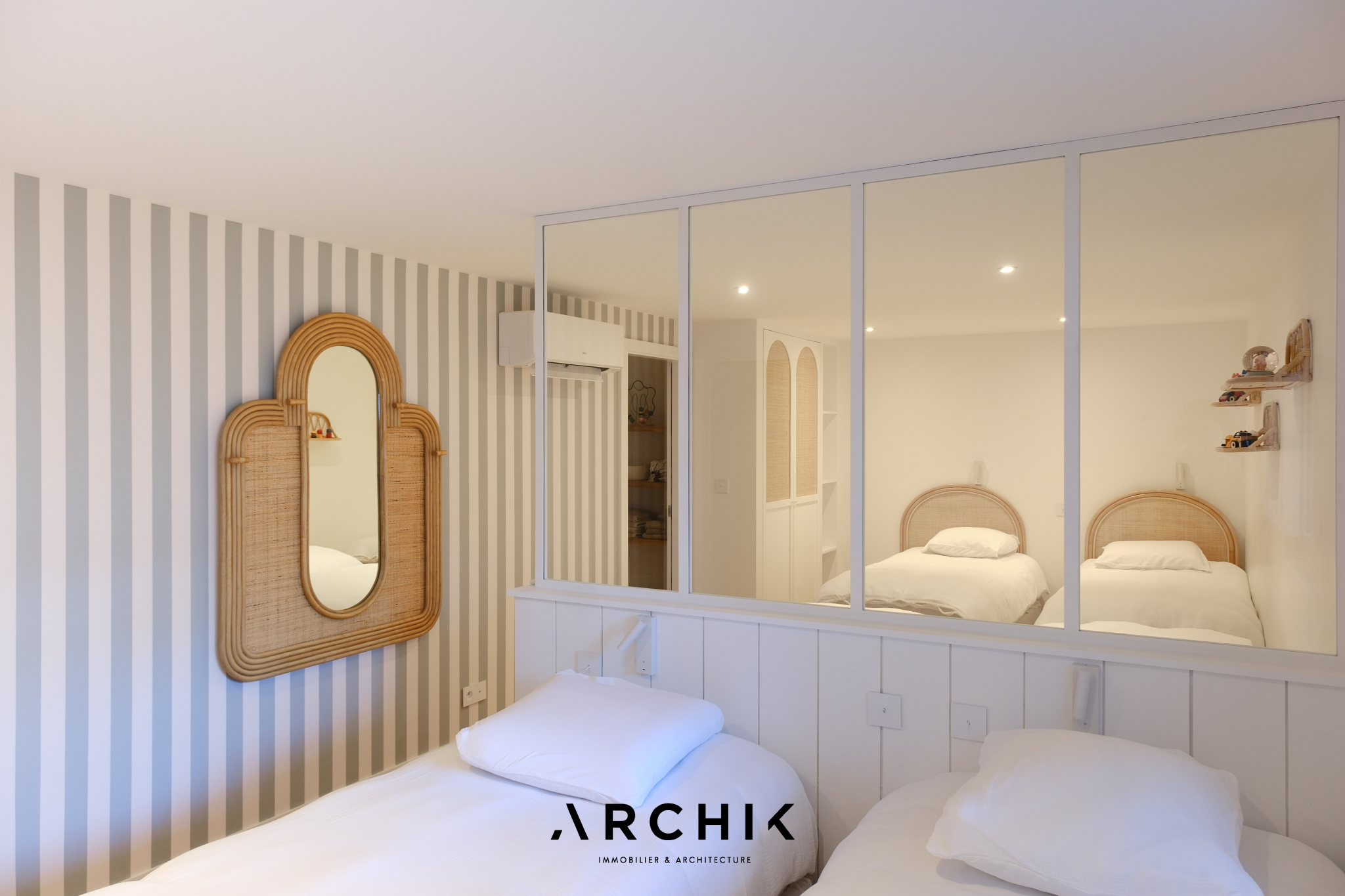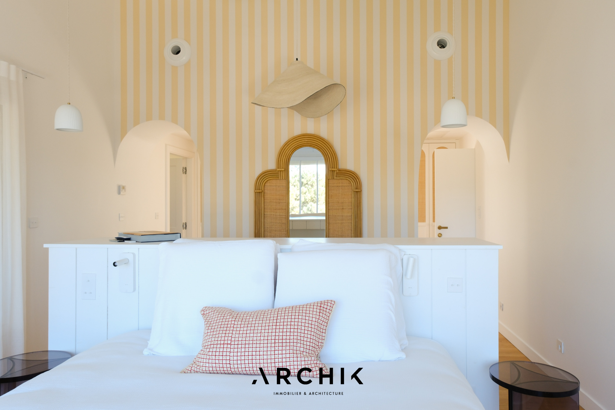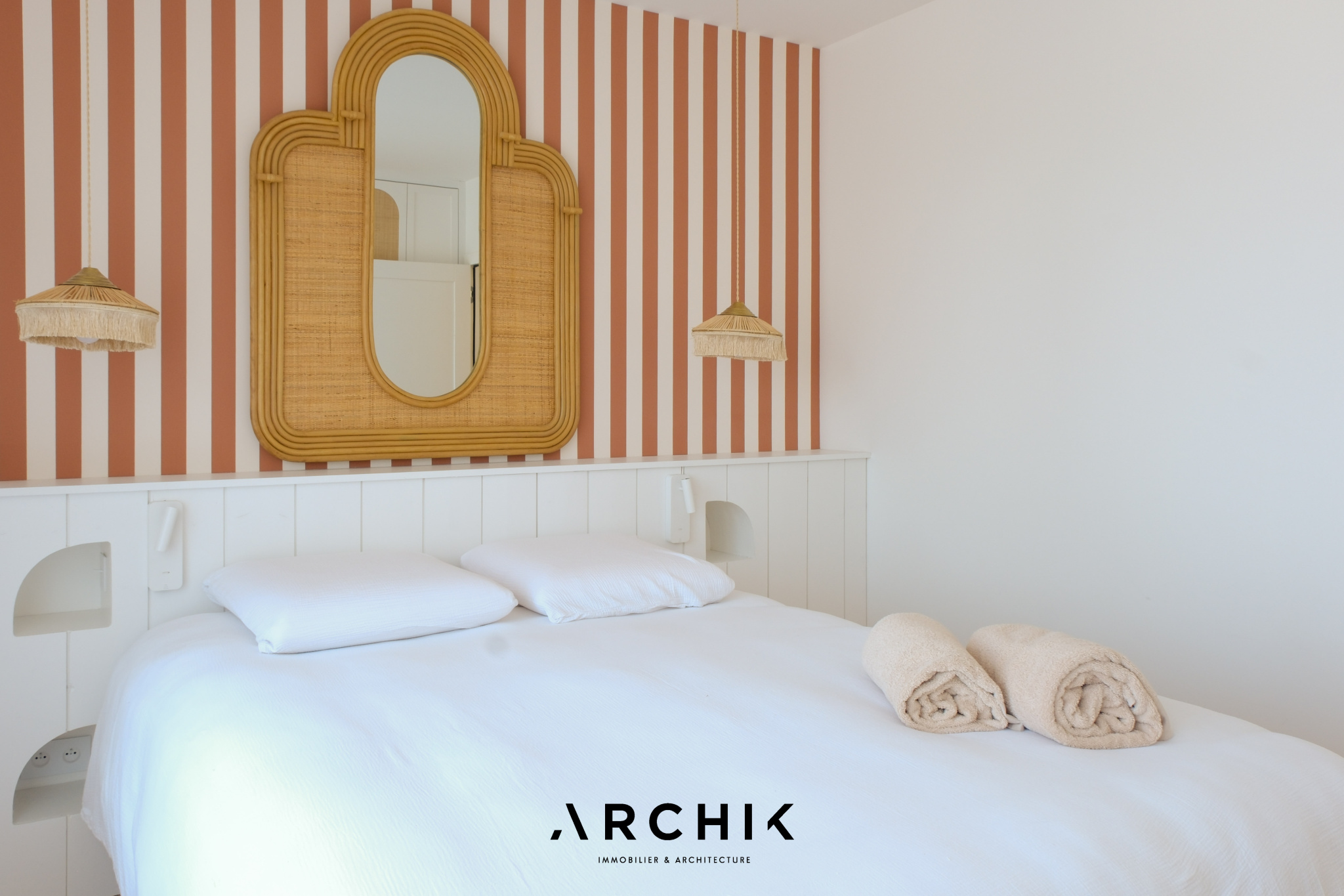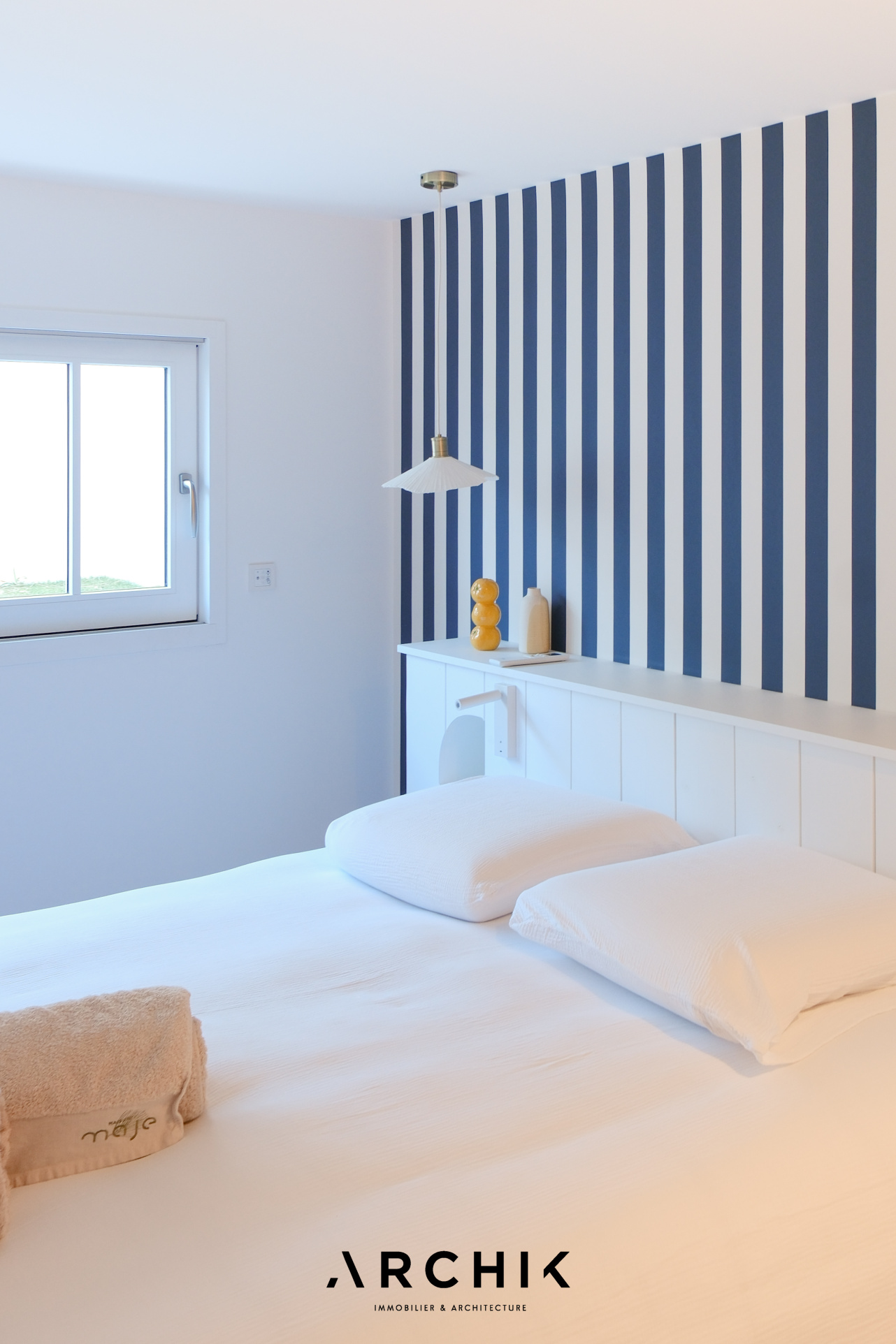 L'espace nuit comprend quatre chambres supplémentaires, dont deux suites ainsi qu'un dortoir, idéal pour les enfants, permettant d'accueillir de 12 à 14 personnes. Chaque chambre est décorée dans un esprit estival, mêlant teintes douces et rayures.
