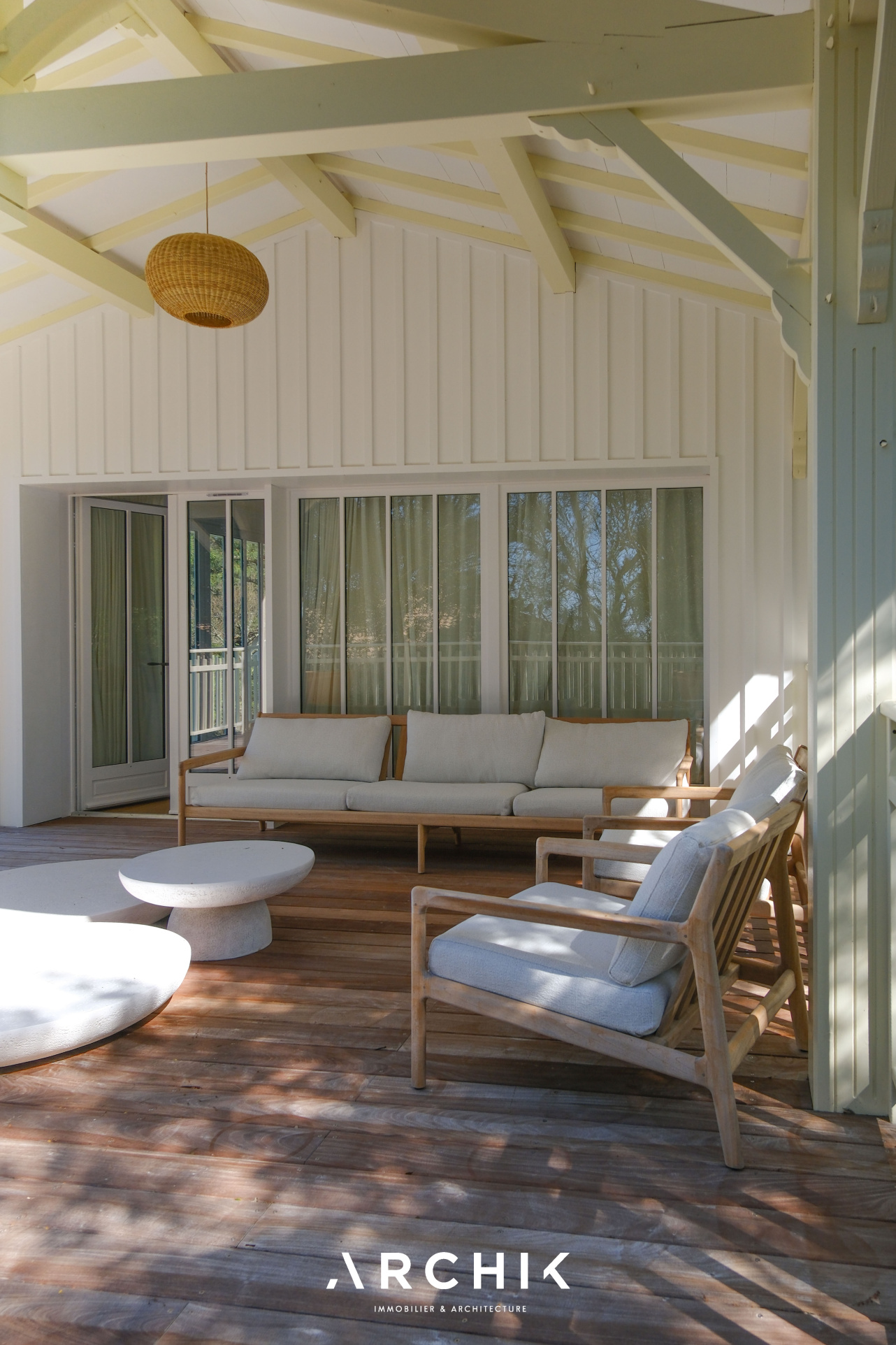 Édifiée en 2025 par l'Atelier Maisons BMC, elle s'inspire des codes des cabanes ostréicoles. Entièrement habillée d'un bardage blanc, elle offre un cadre privilégié où de beaux volumes et des matériaux haut de gamme composent un lieu idéal pour séjourner et profiter du Bassin. Les différents niveaux accueillent plusieurs espaces de vie, pensés pour alterner entre convivialité et intimité.