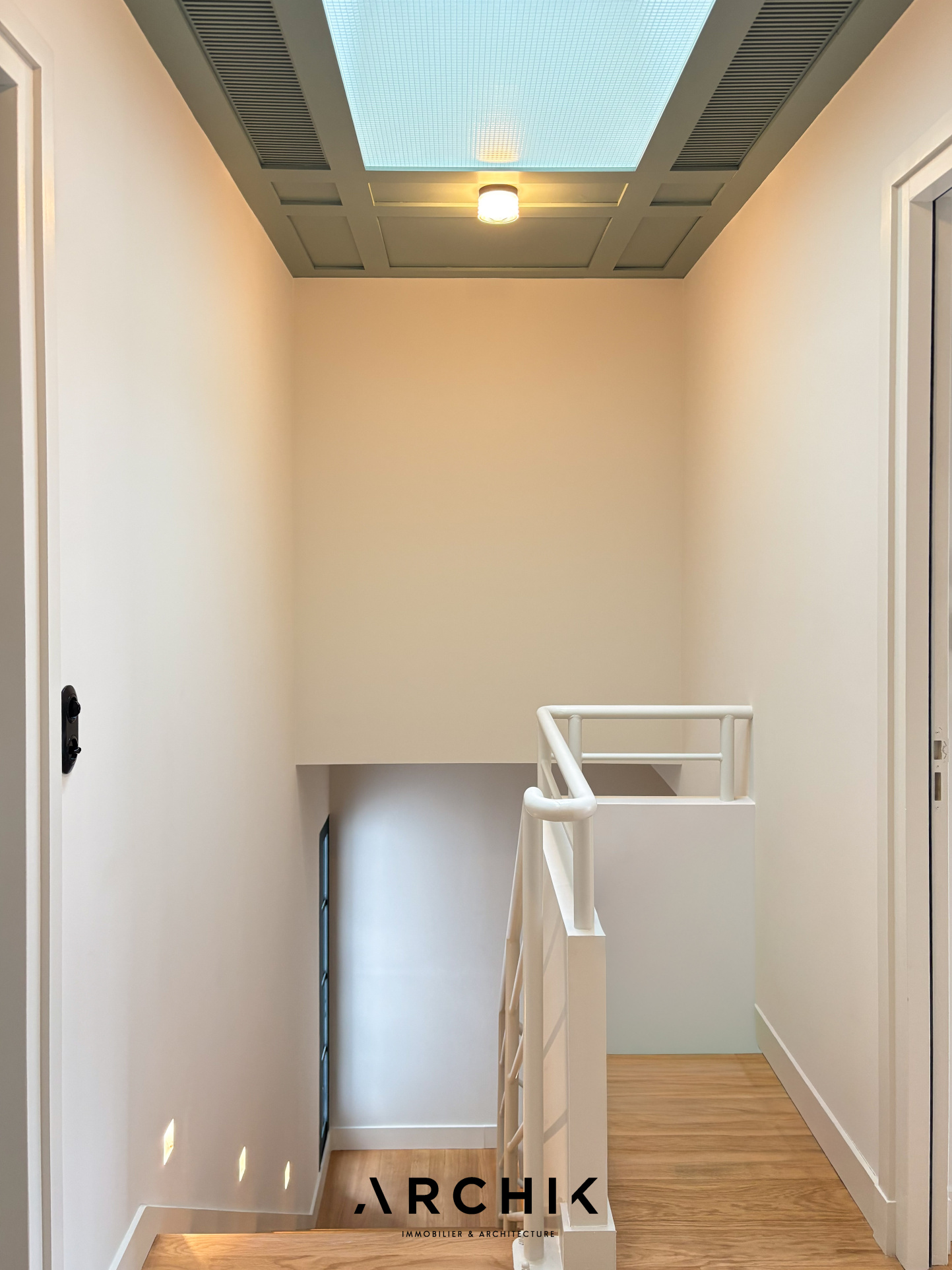 L'espace nuit à l'étage s'articule autour d'un palier et son plafond en verrière apportant une lumière naturelle. Une suite ouvrant sur un balcon et offrant une vue dégagée sur les arbres ainsi que deux chambres se partageant une salle d'eau occupent l'espace. Le parquet en chêne, les carreaux colorés et les larges ouvertures renforcent le caractère de la maison.