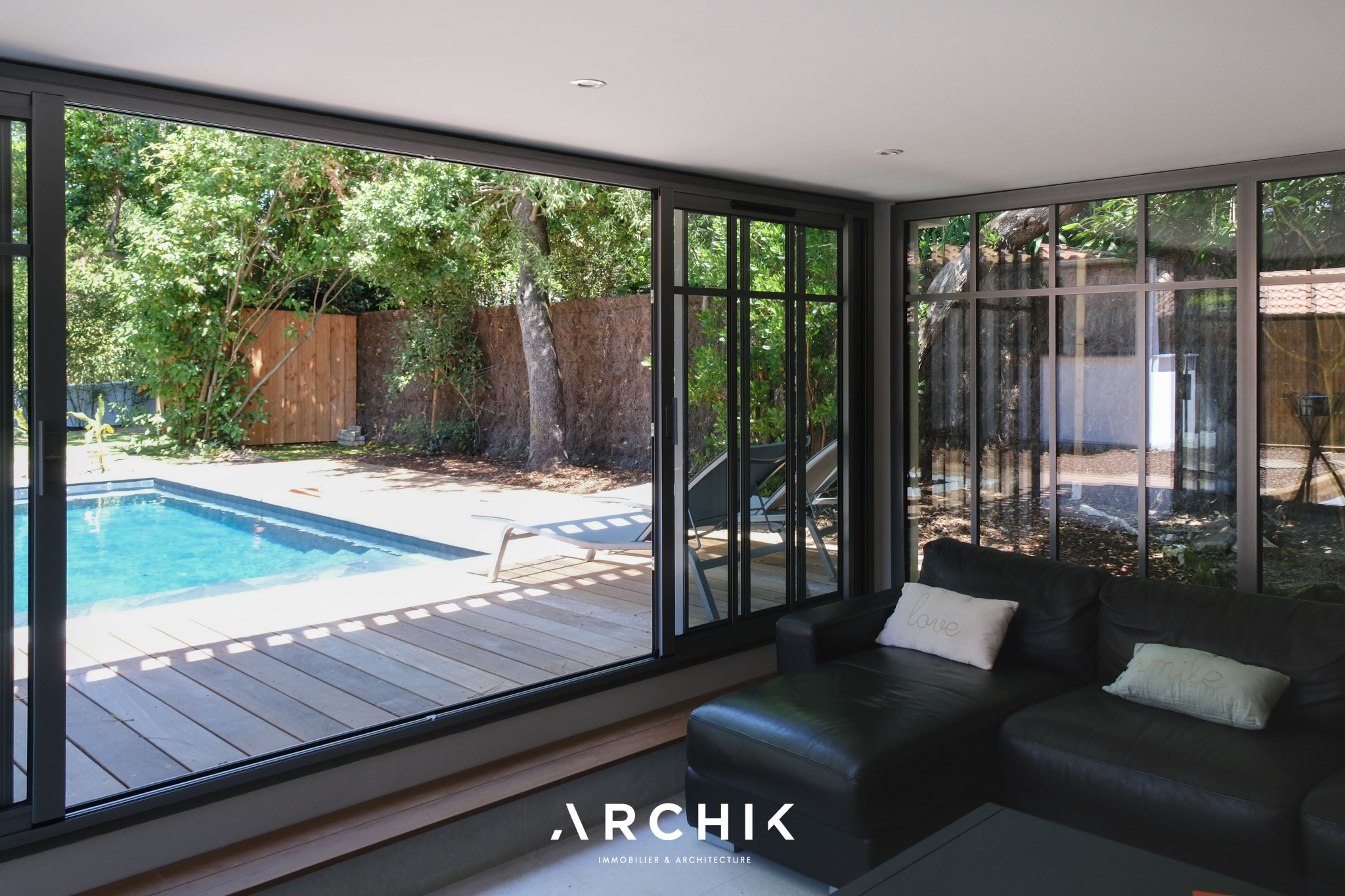 Le rez-de-jardin est accessible depuis le salon par un escalier entouré d'un garde-corps en verre. Ce niveau est composé de trois chambres qui partagent une salle d'eau et une véranda accueillant un salon TV et un babyfoot Bonzini ouvrant sur la terrasse et la piscine.