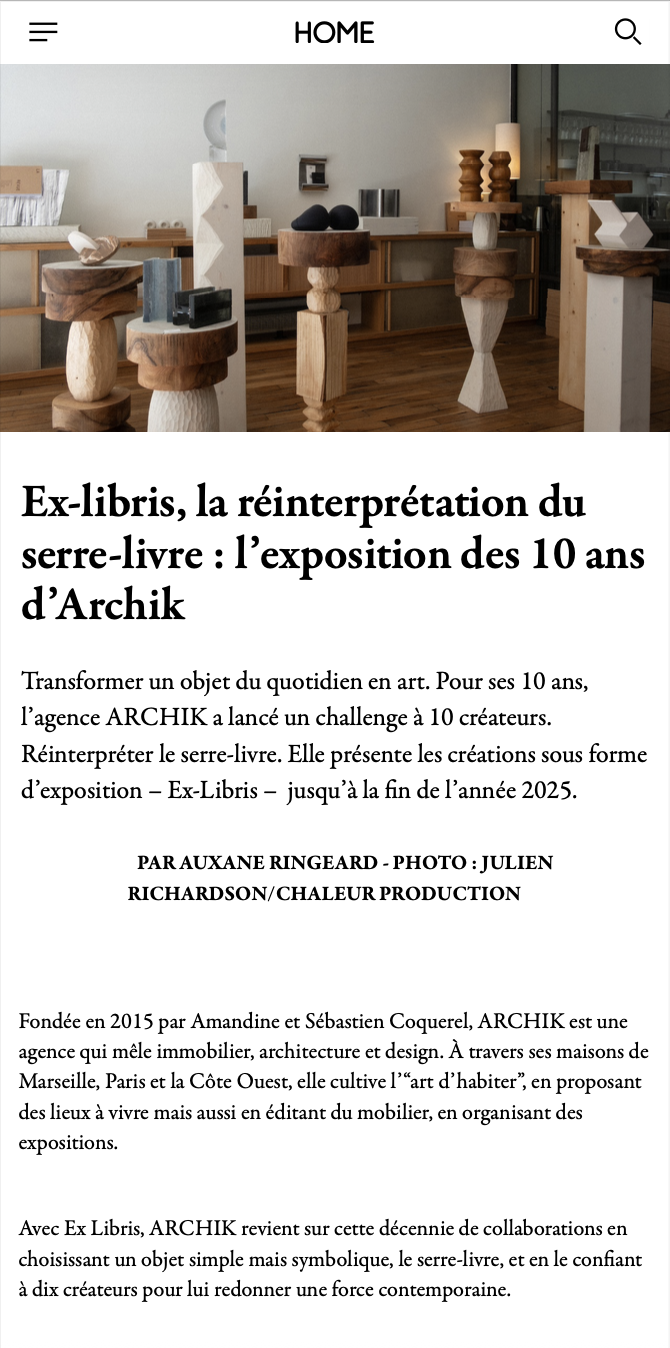 Ex-libris, la réinterprétation du serre-livre : l’exposition des 10 ans d’ArchikHOMEMAGAZINE – Septembre 2025Télécharger l'article